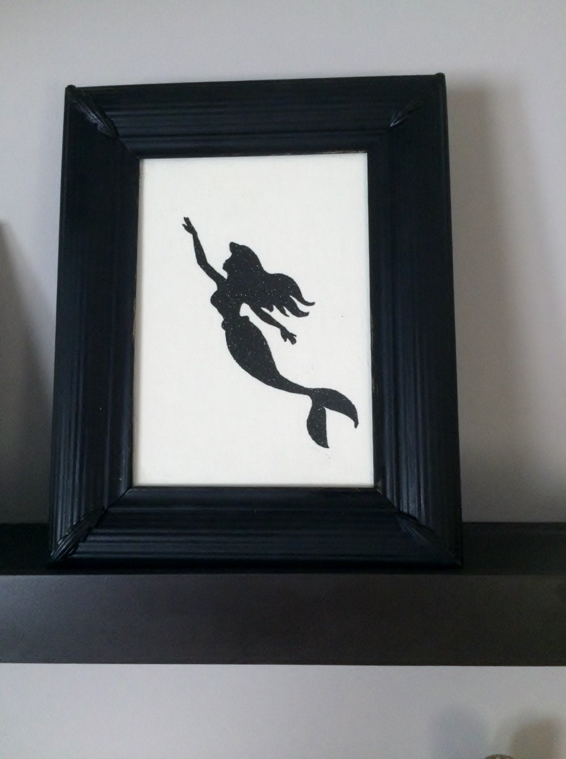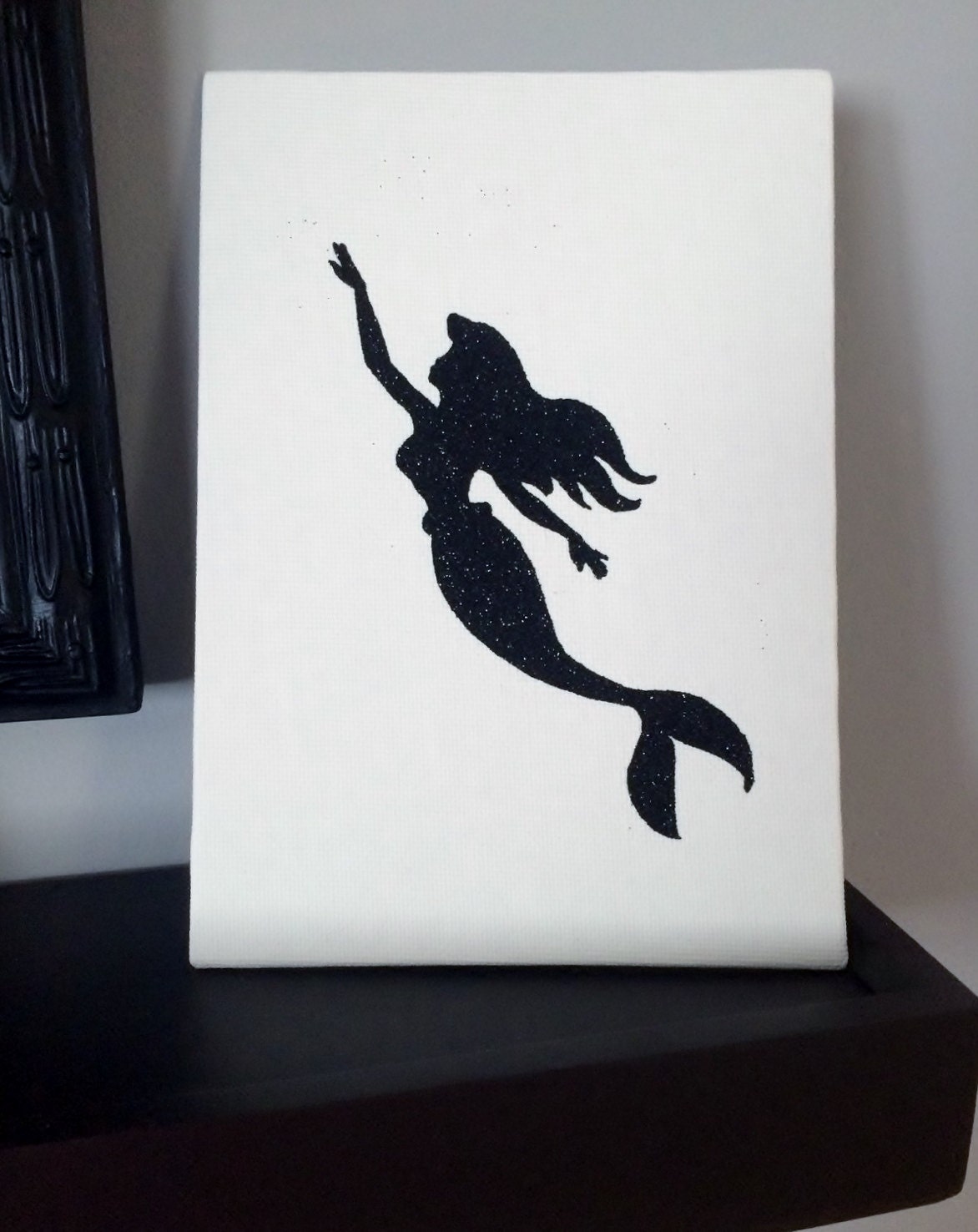Black Glittered Mermaid Silhouette on White Canvas Panel.