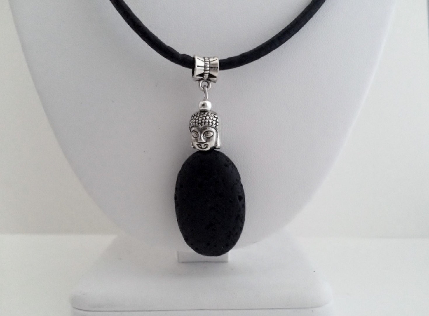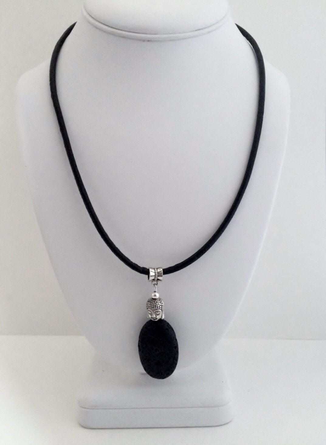 Lava Rock Pendant with Buddha Charm. 18"L Black Leather Necklace with bayonet clasp.