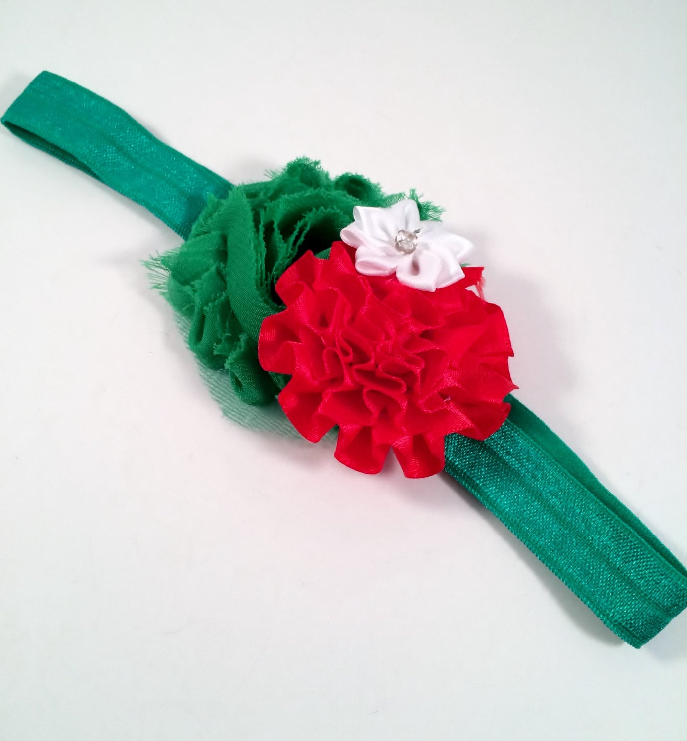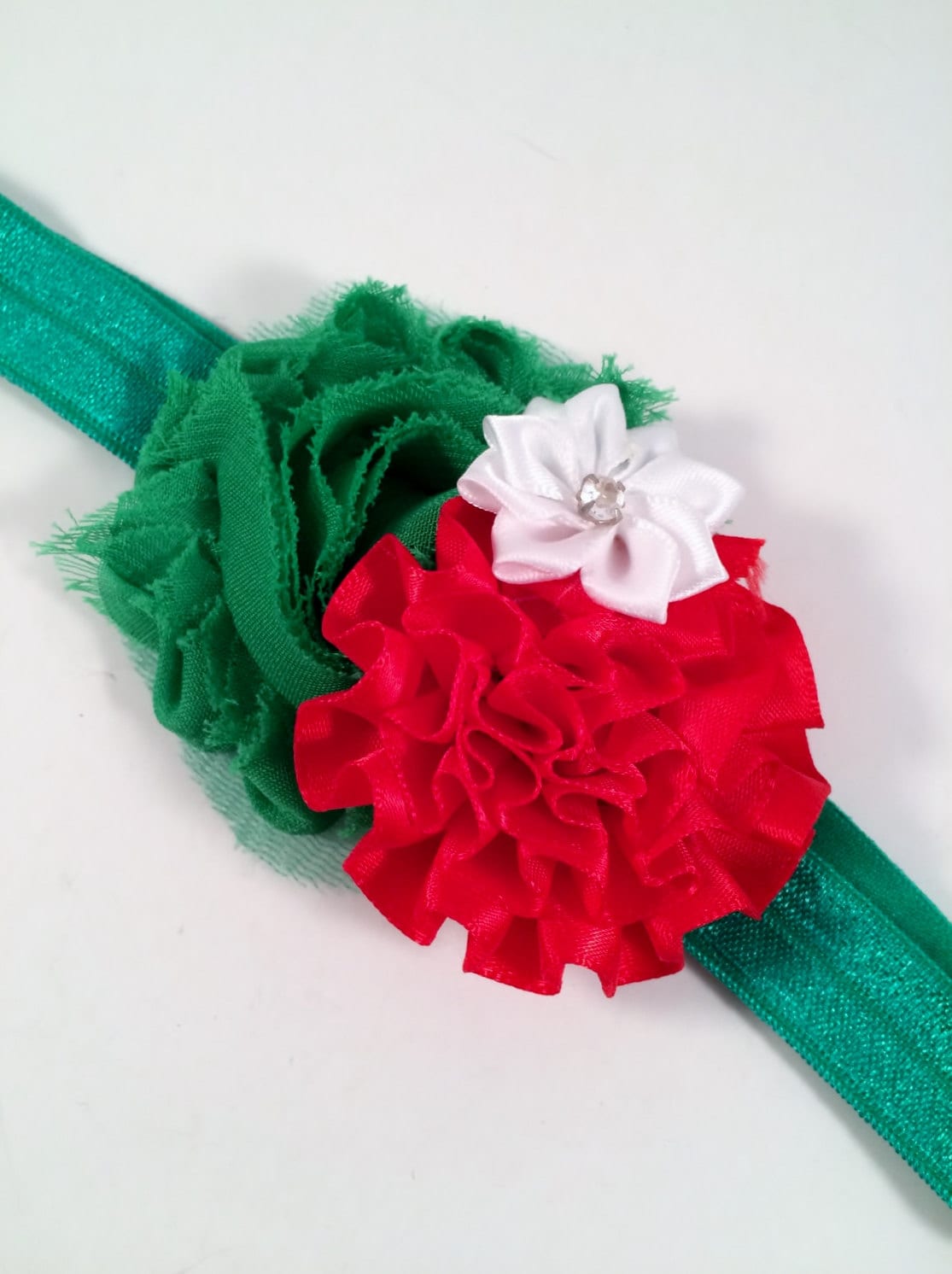 Red & Green tattered flower Stretch Headband with flower appliqués on a stretch headband