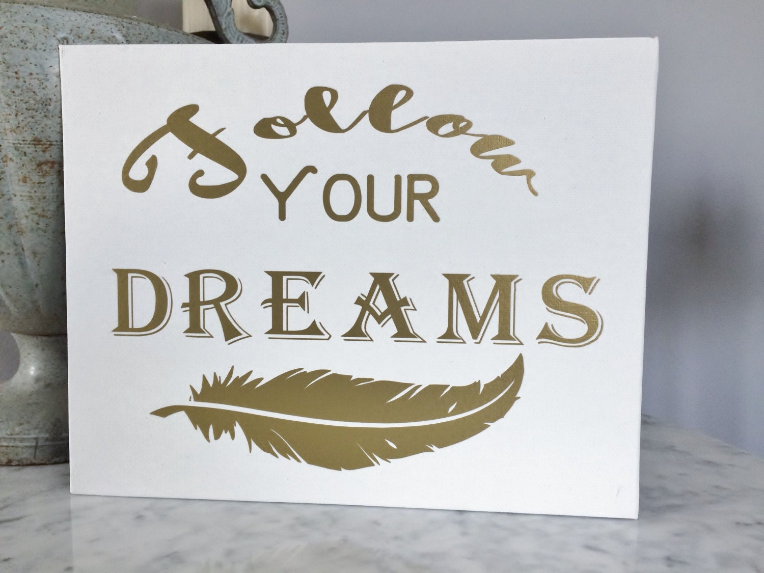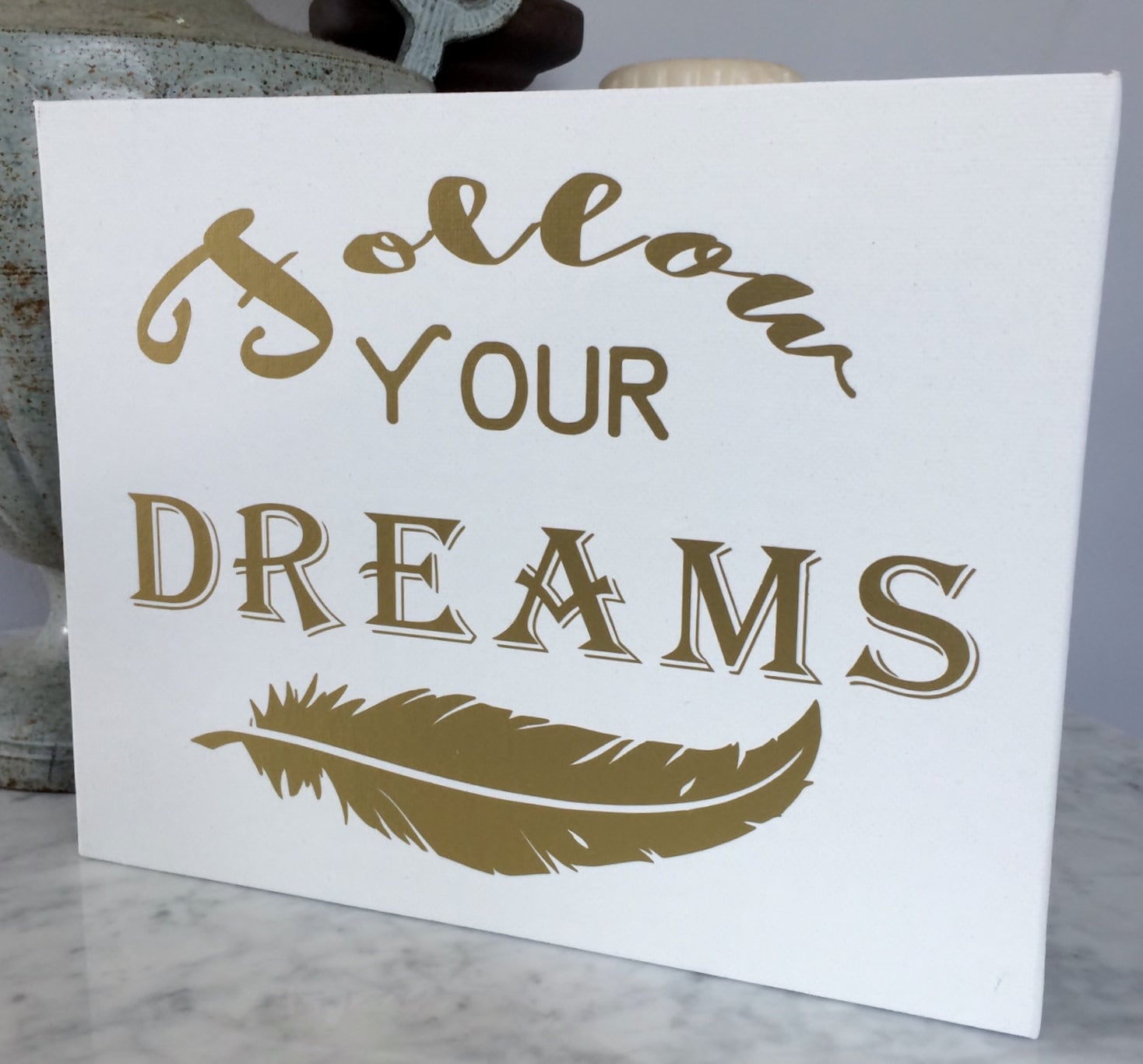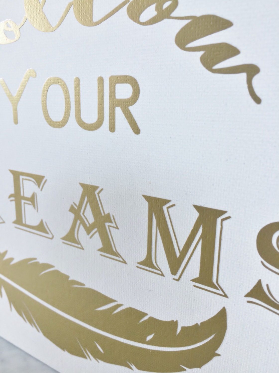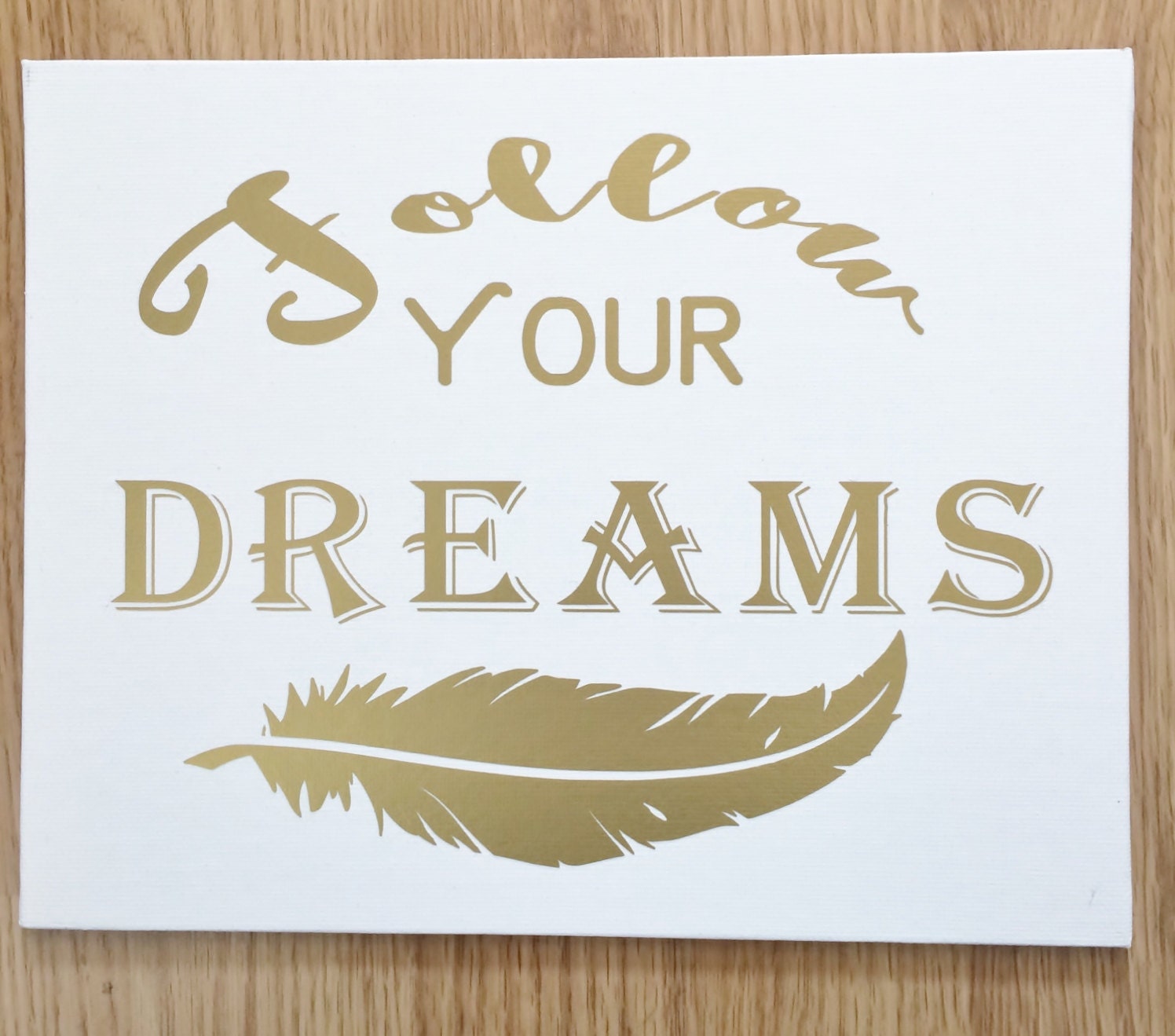 Gold Lettering Follow Your Dreams print on White Canvas Panel