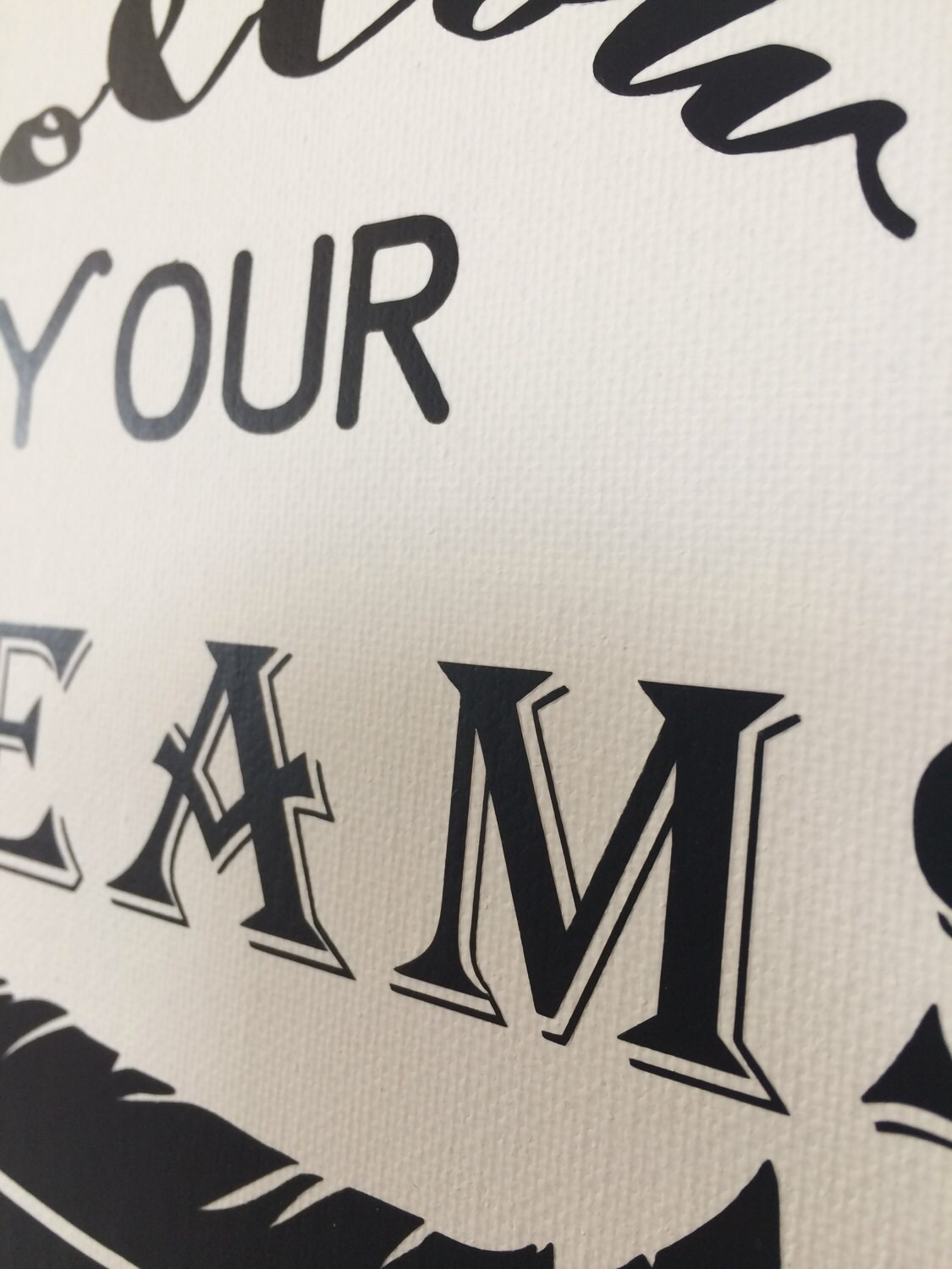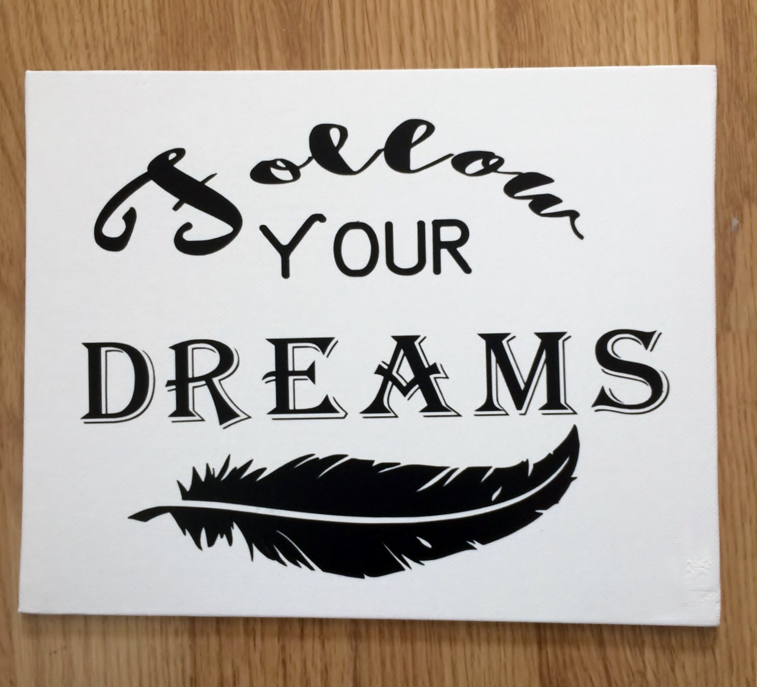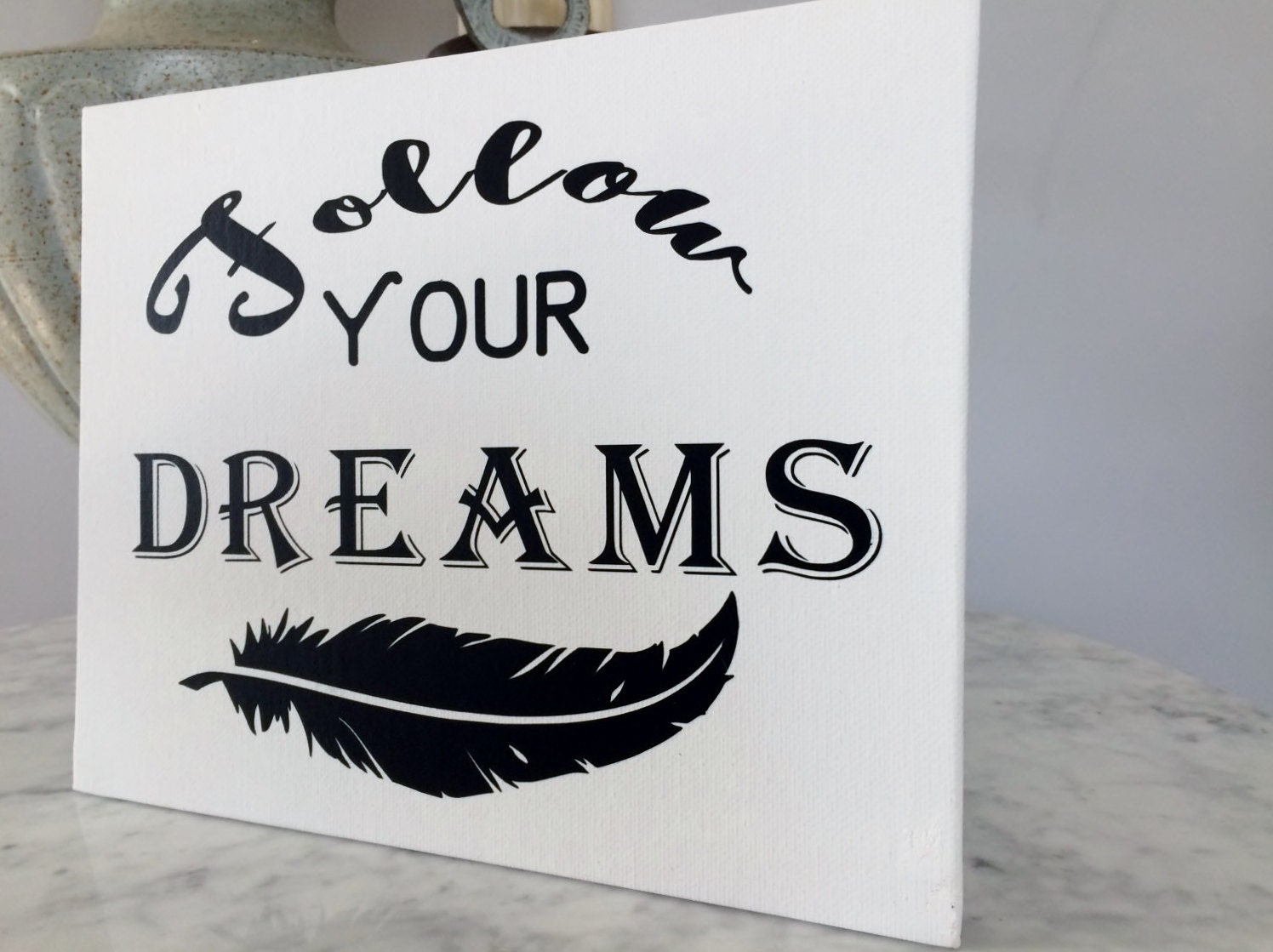 Black Lettering Follow Your Dreams print on White Canvas Panel