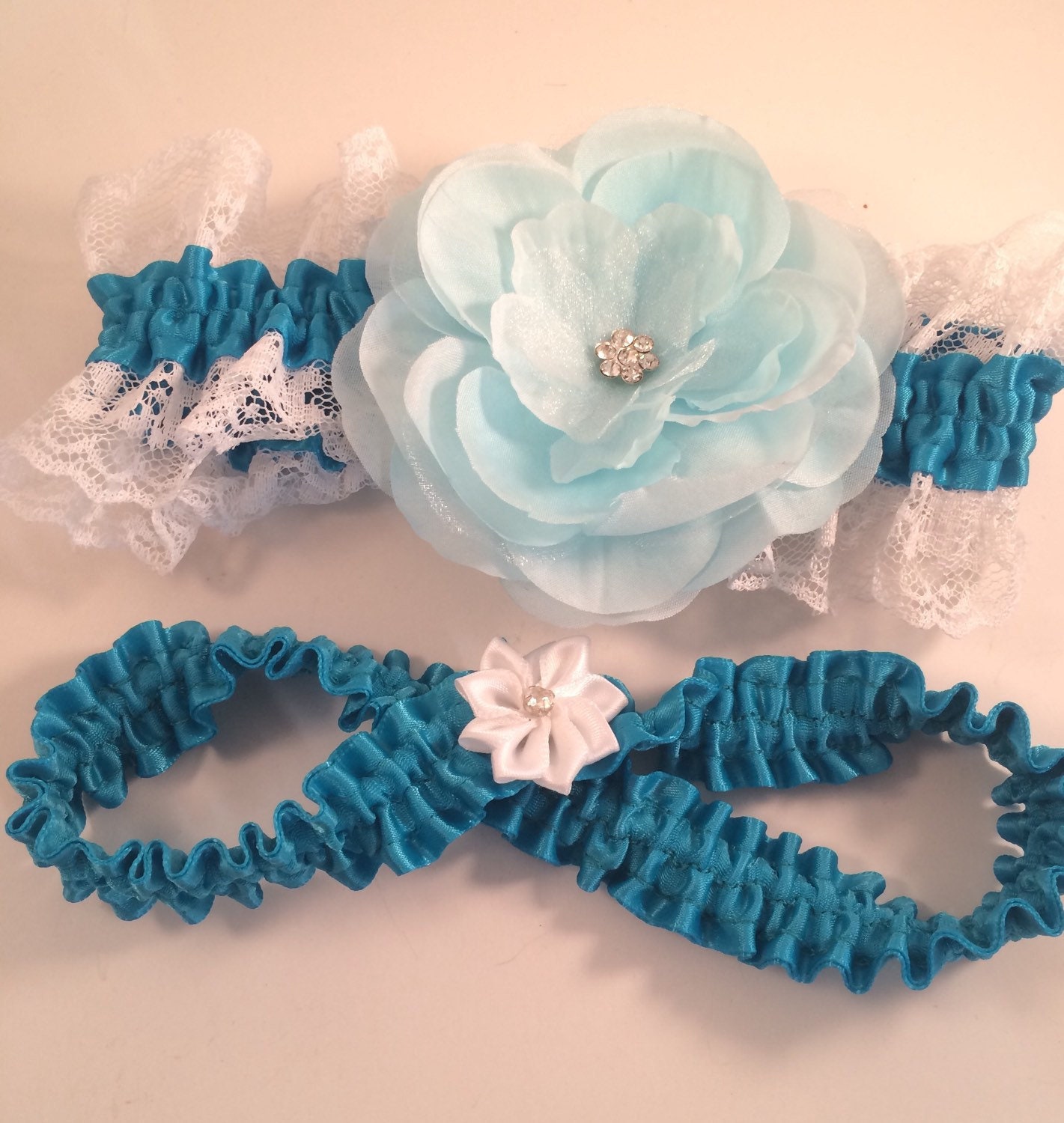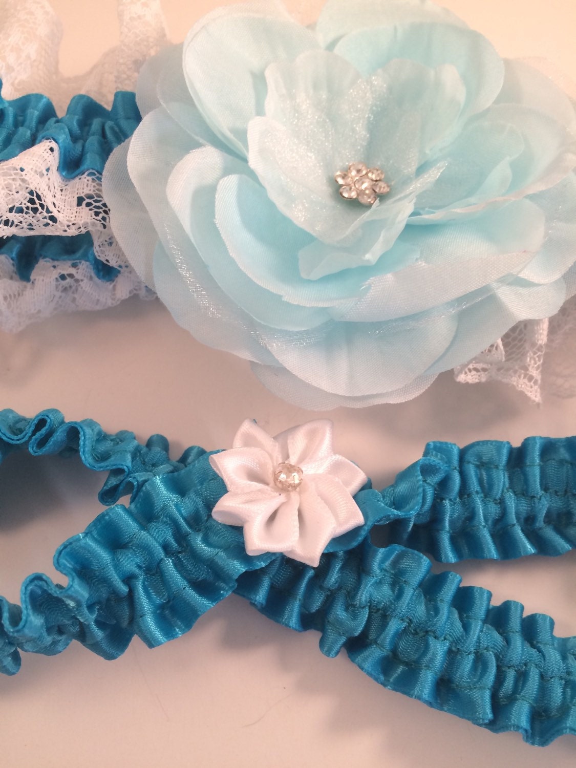 Turquoise garter satin with white lace, Light Blue Fabric Flower, elastic and backed with another layer of satin.