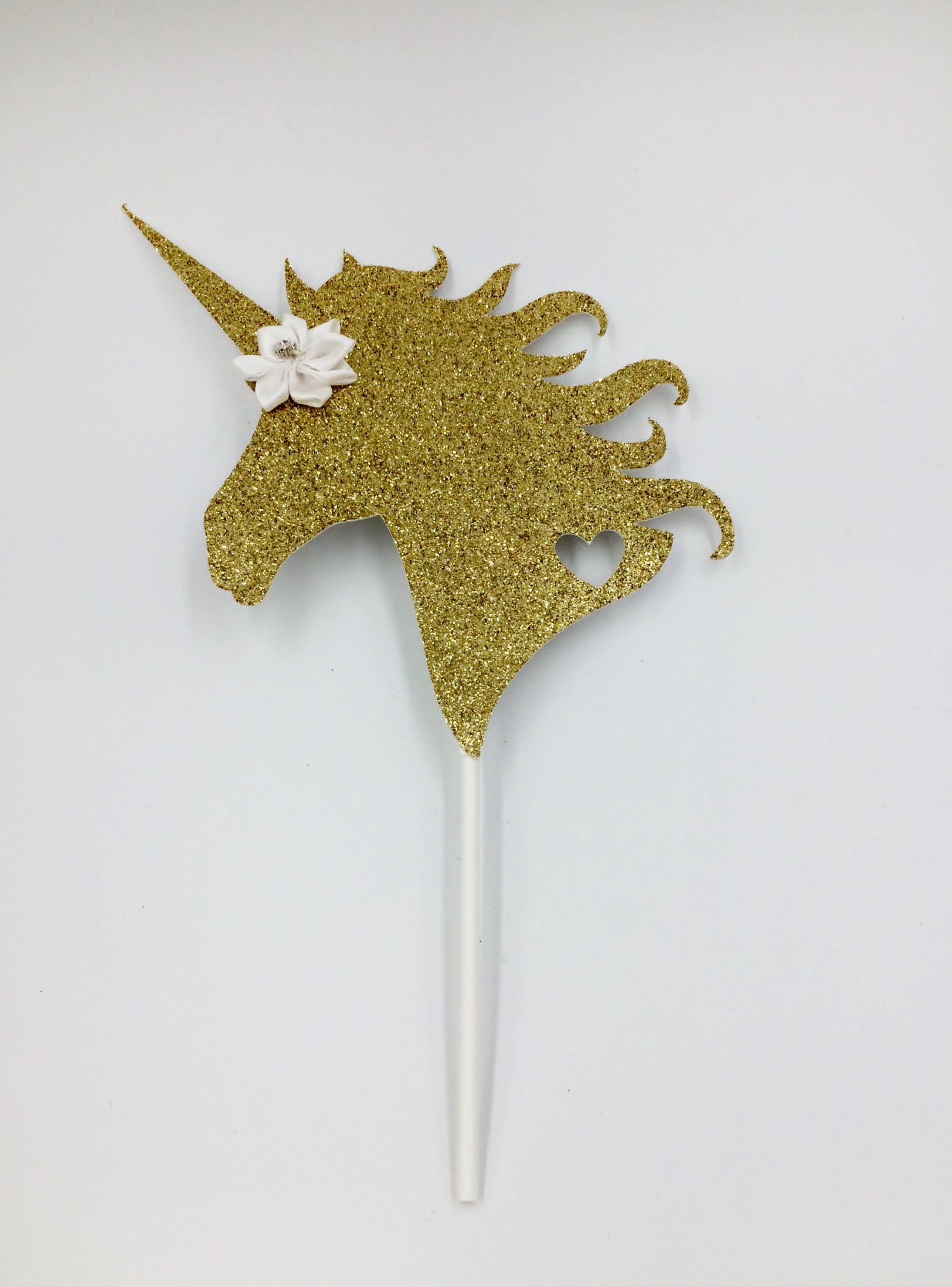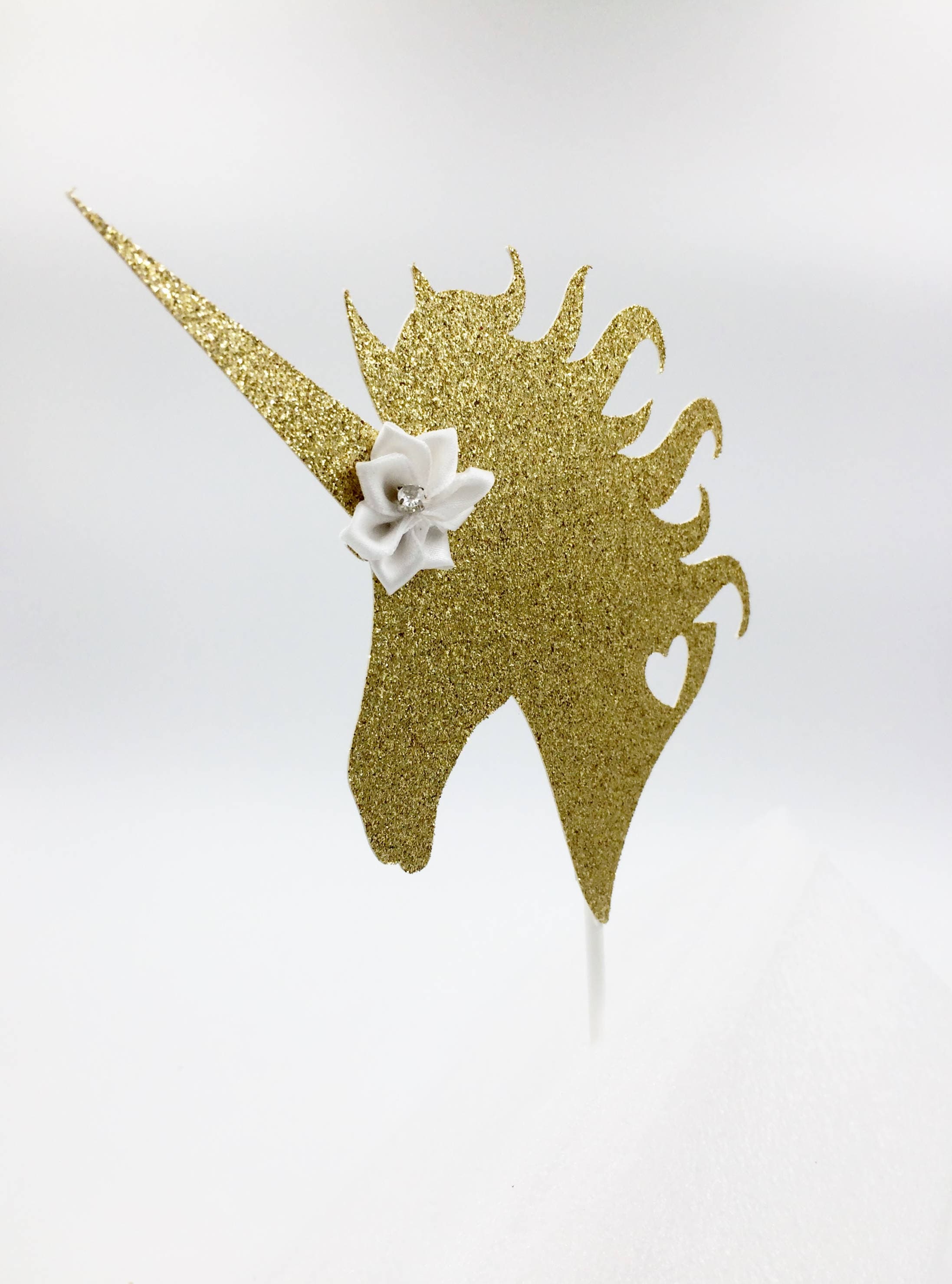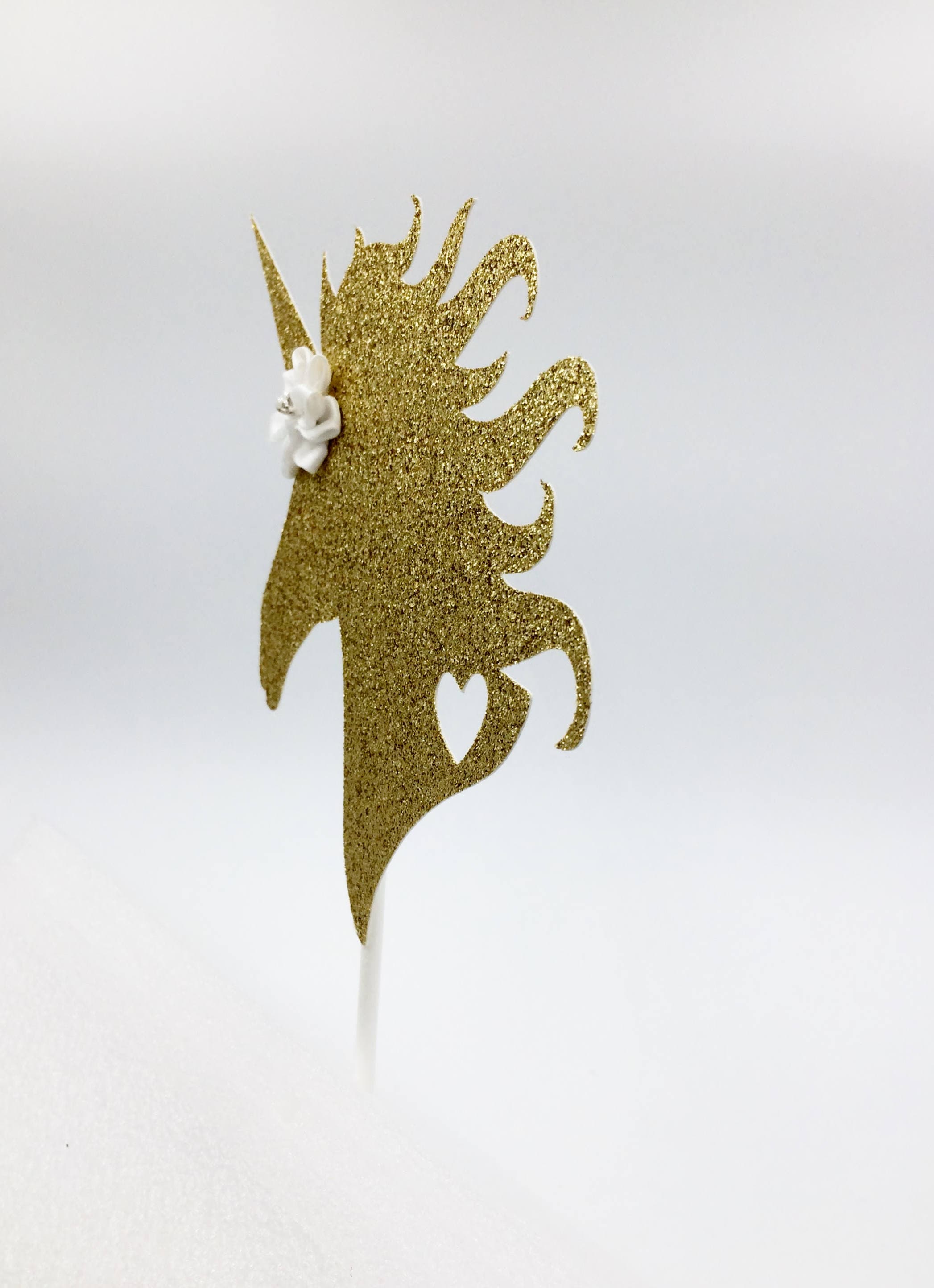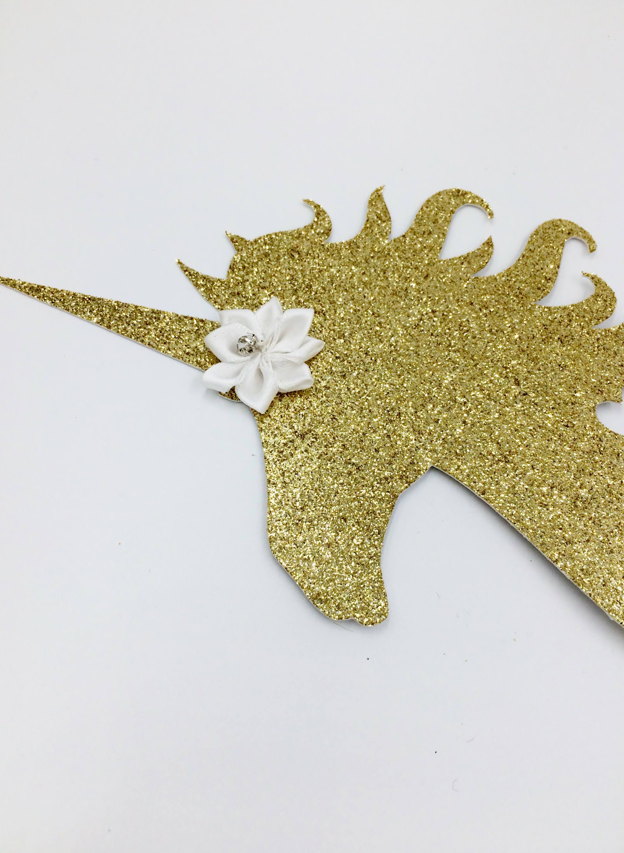 Gold Glitter Unicorn Head Cake Topper with a White Flower Ribbon & Rhinestone Embellishment.