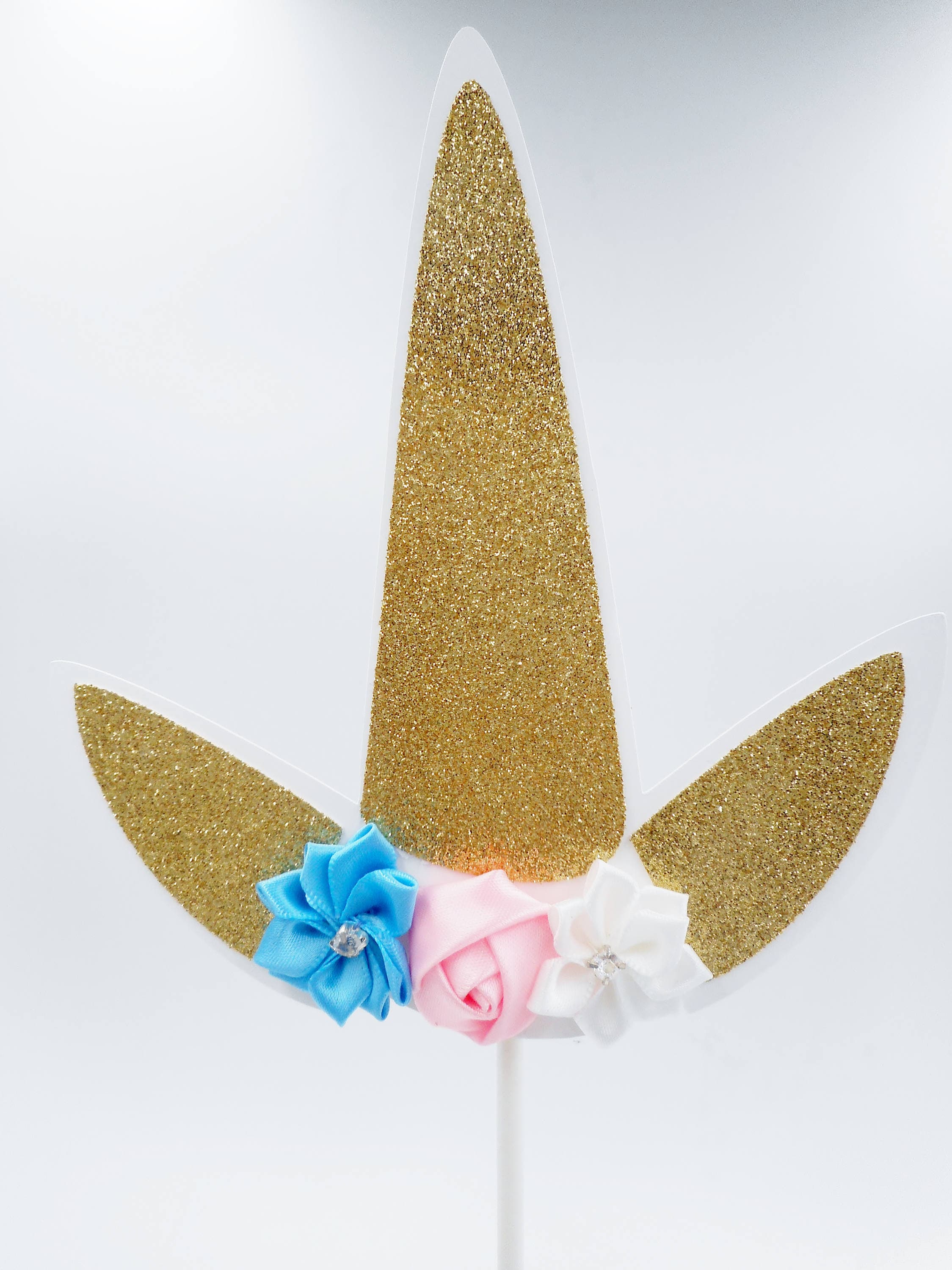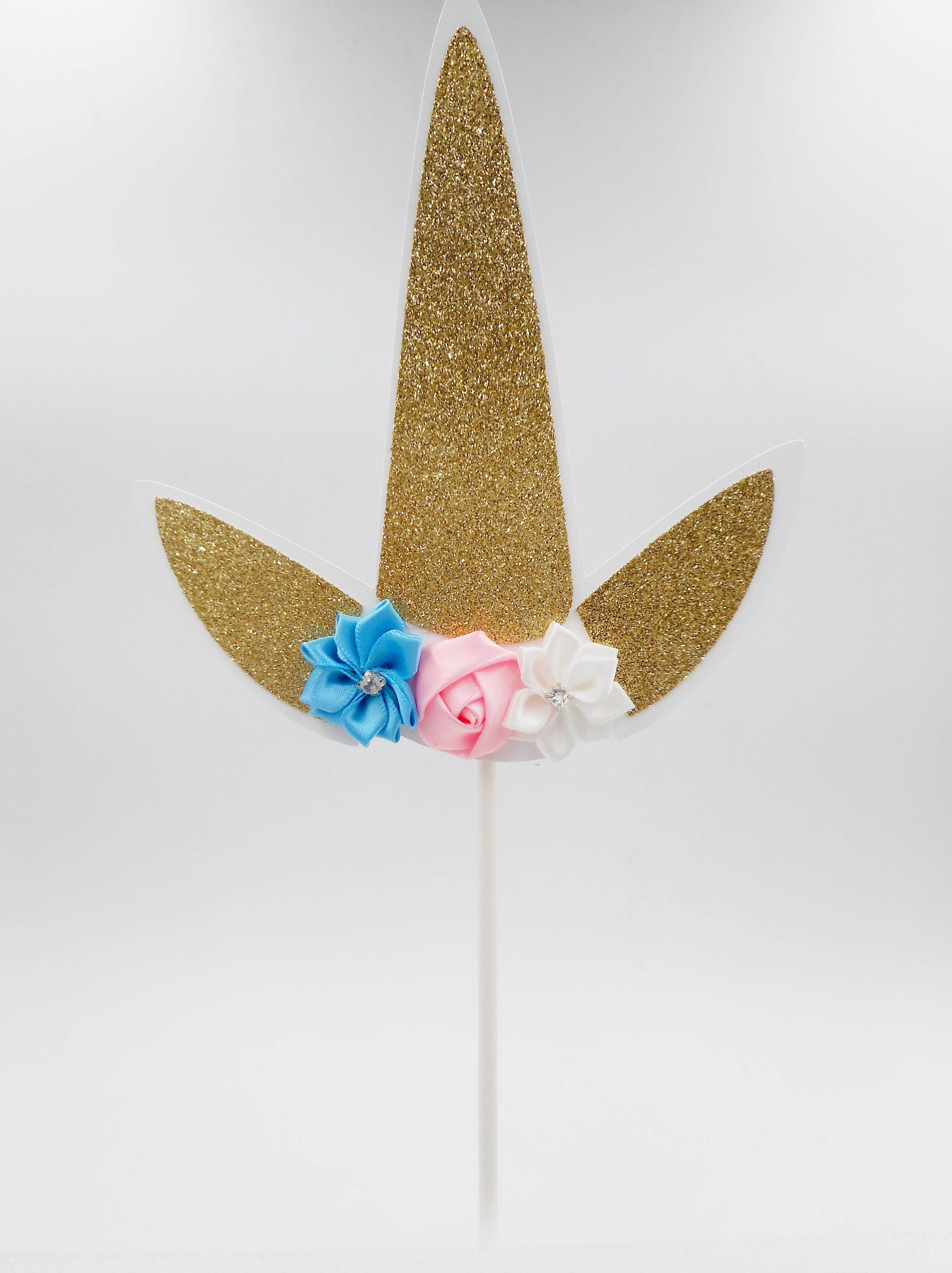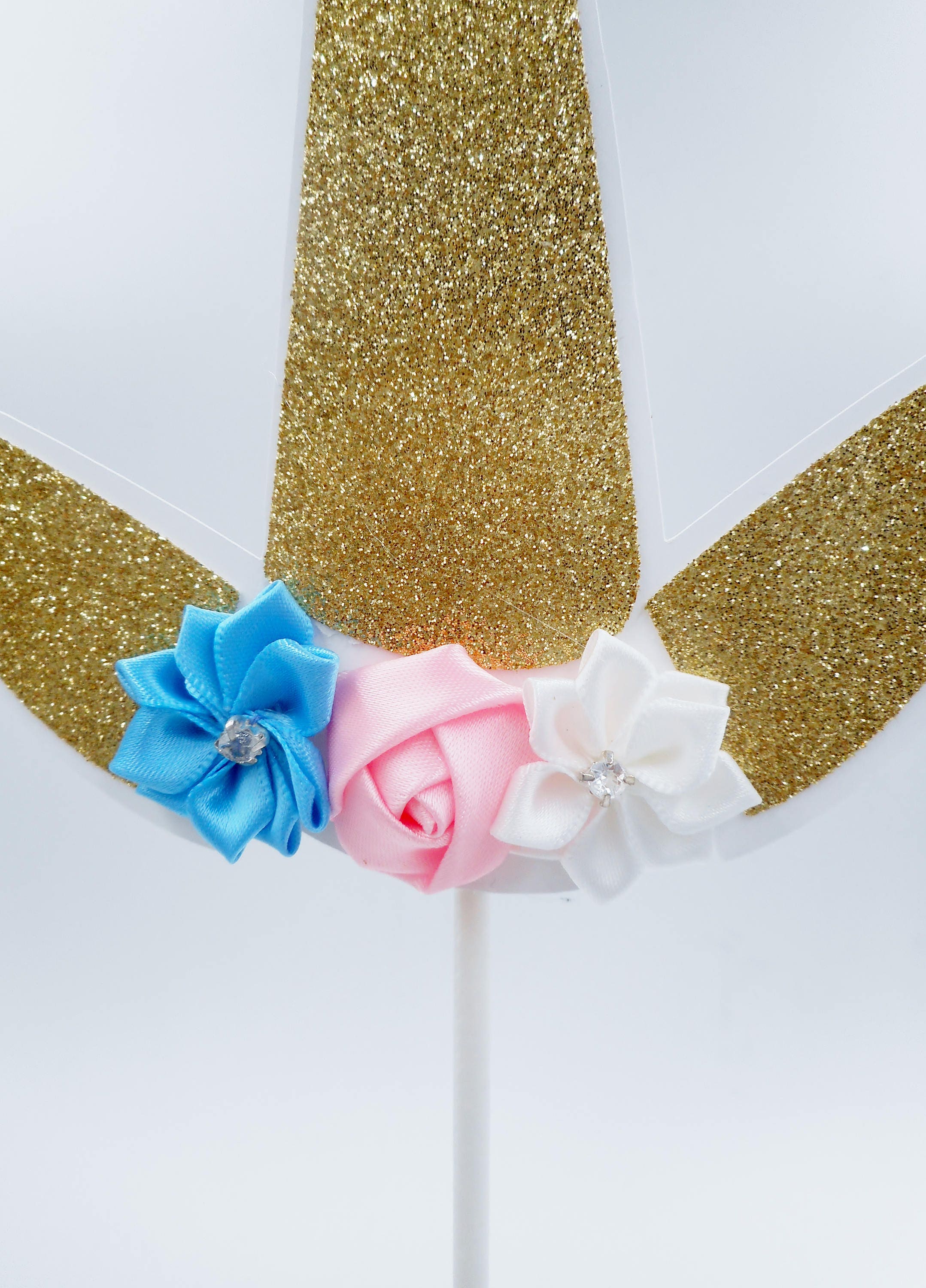 Gold Glitter Unicorn Horn Cake Topper with a Pink, White & Blue Flower Ribbon Embellishment.
