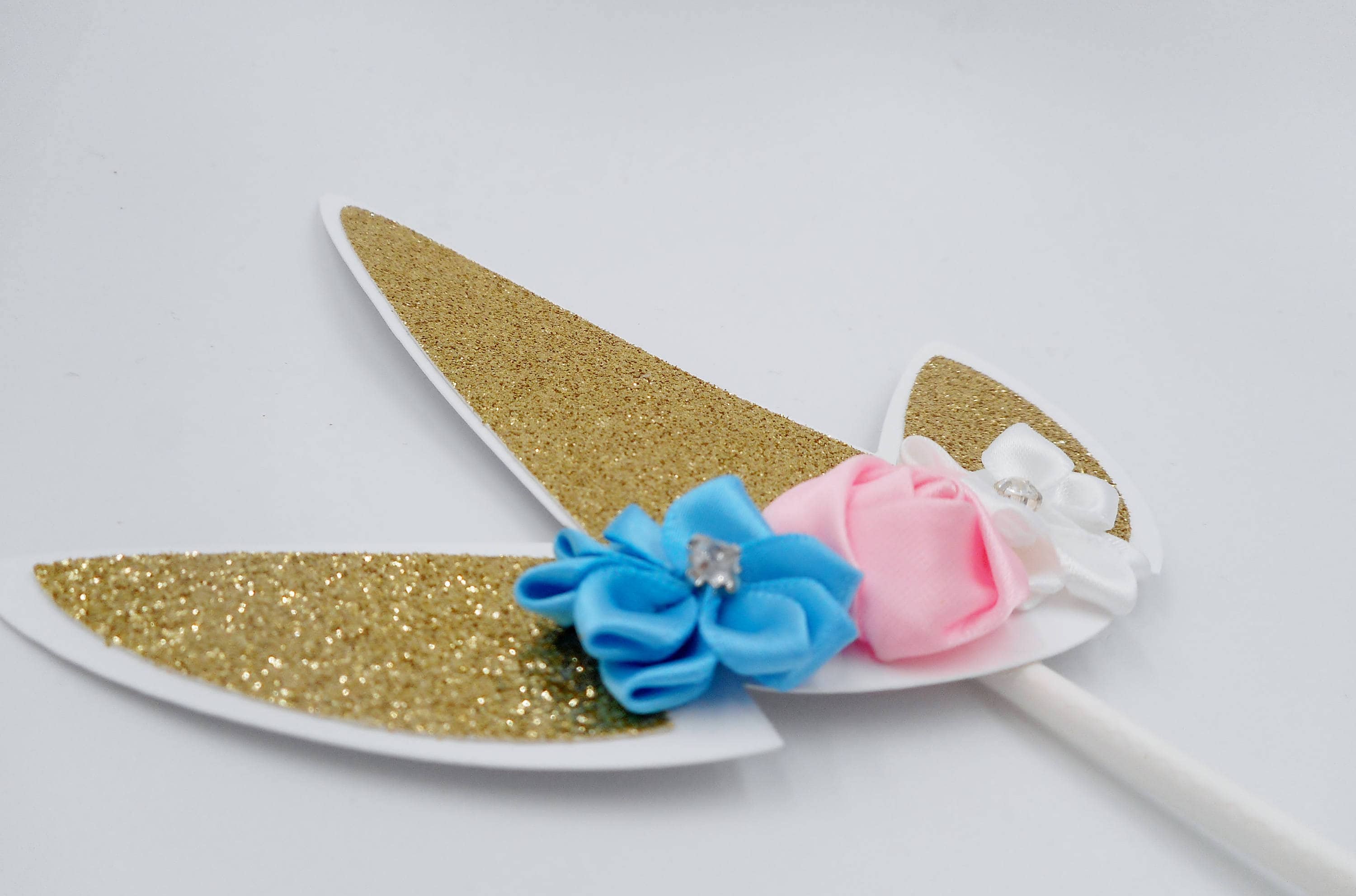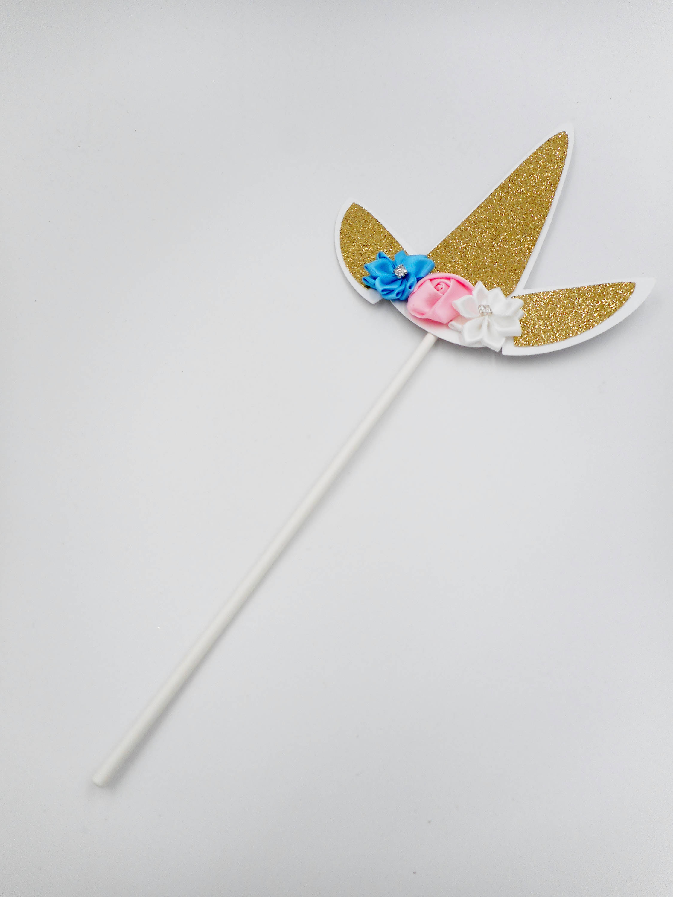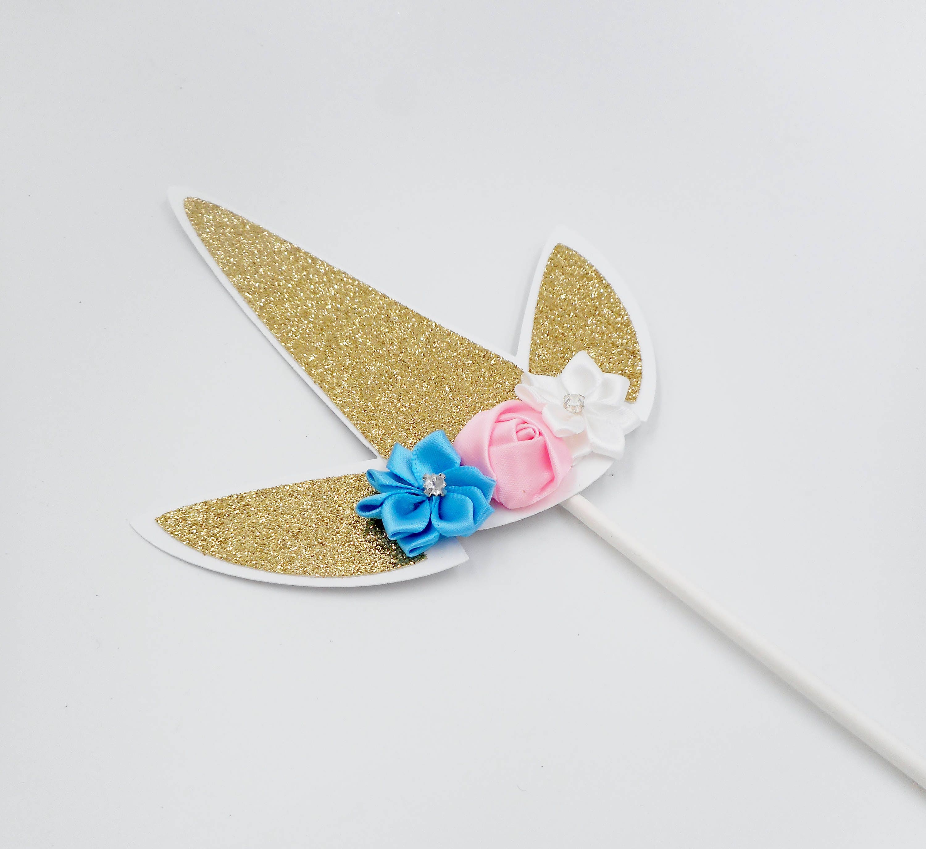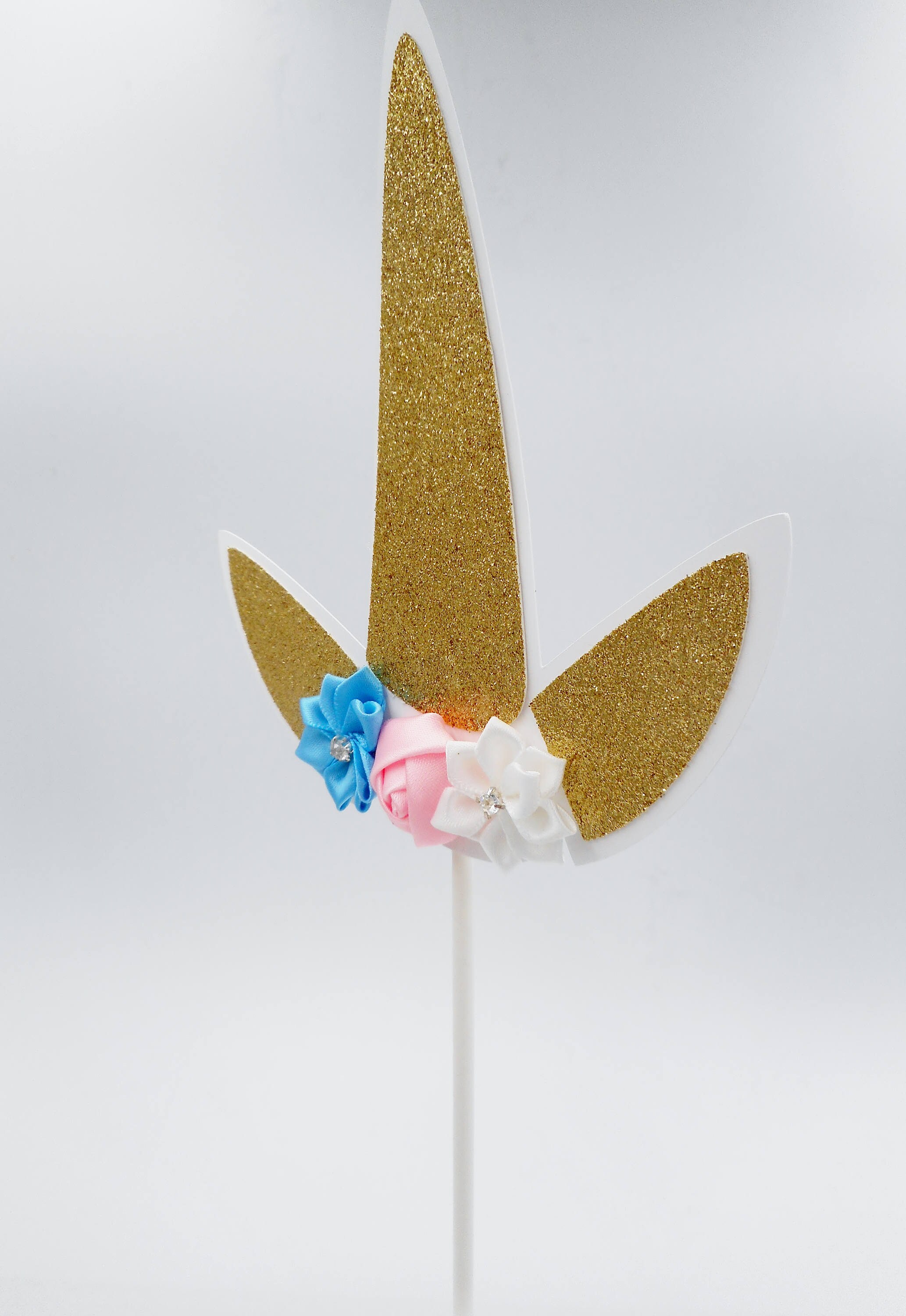 Gold Glitter Unicorn Horn Cake Topper with a Pink, White & Blue Flower Ribbon Embellishment.