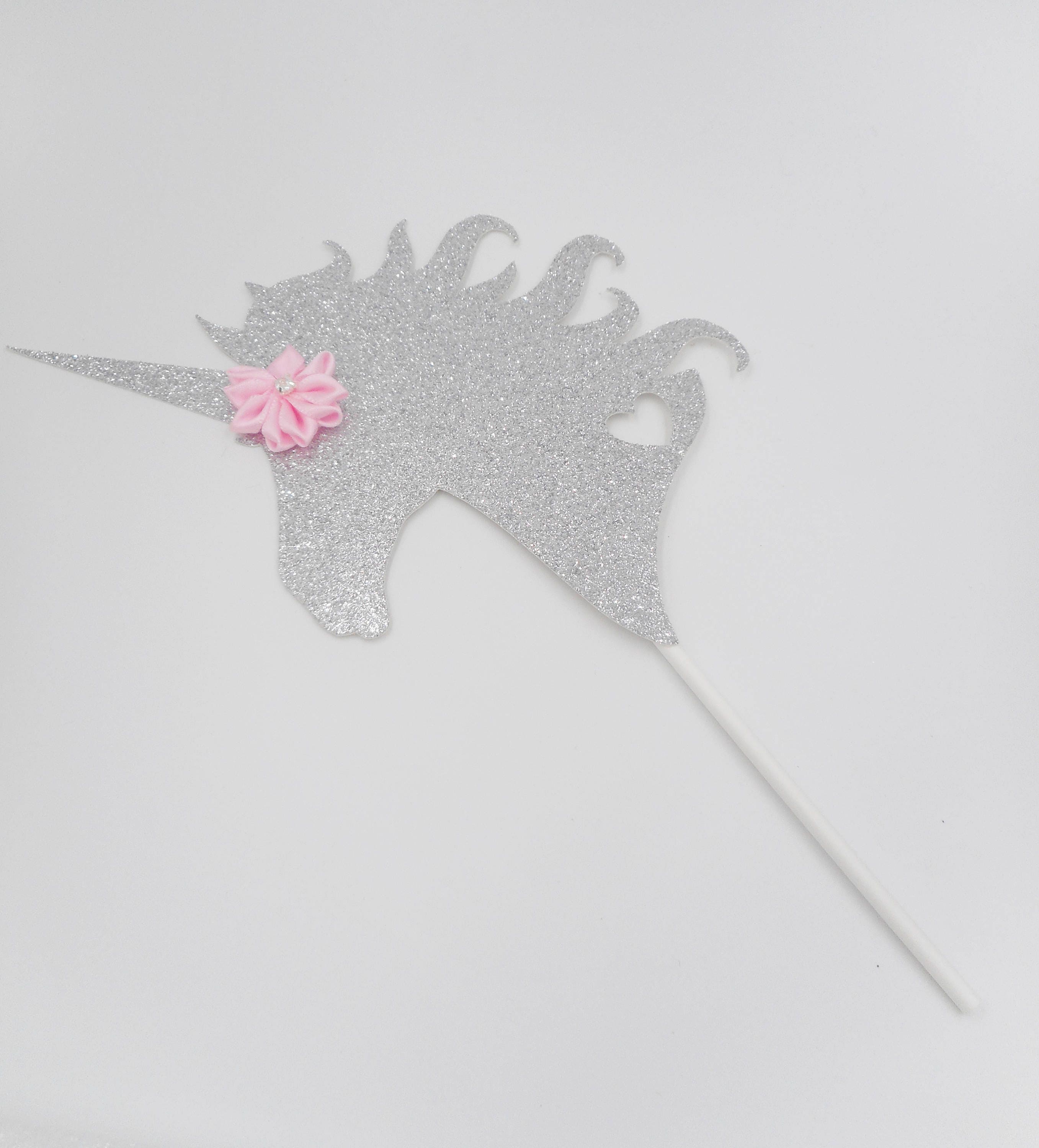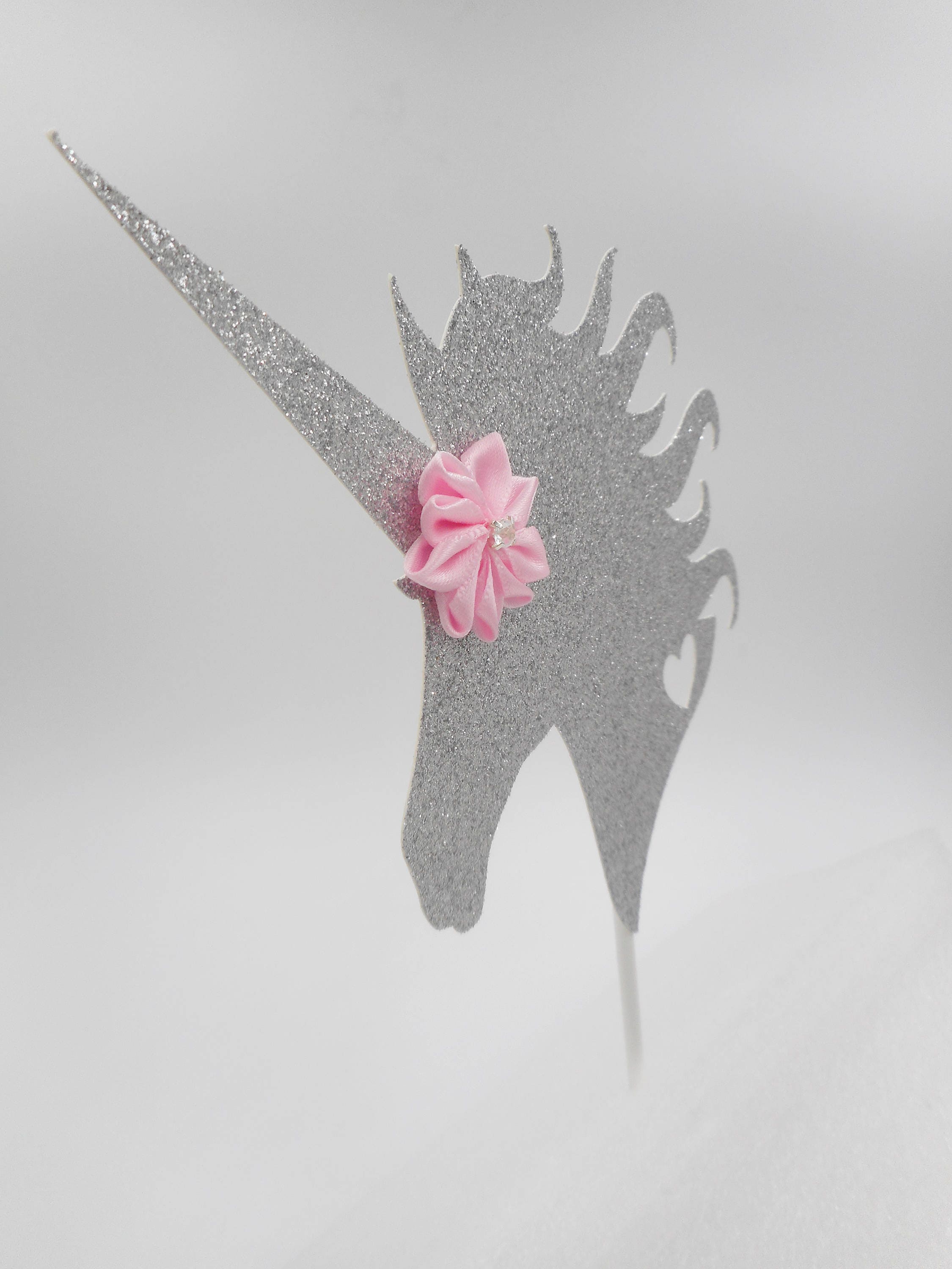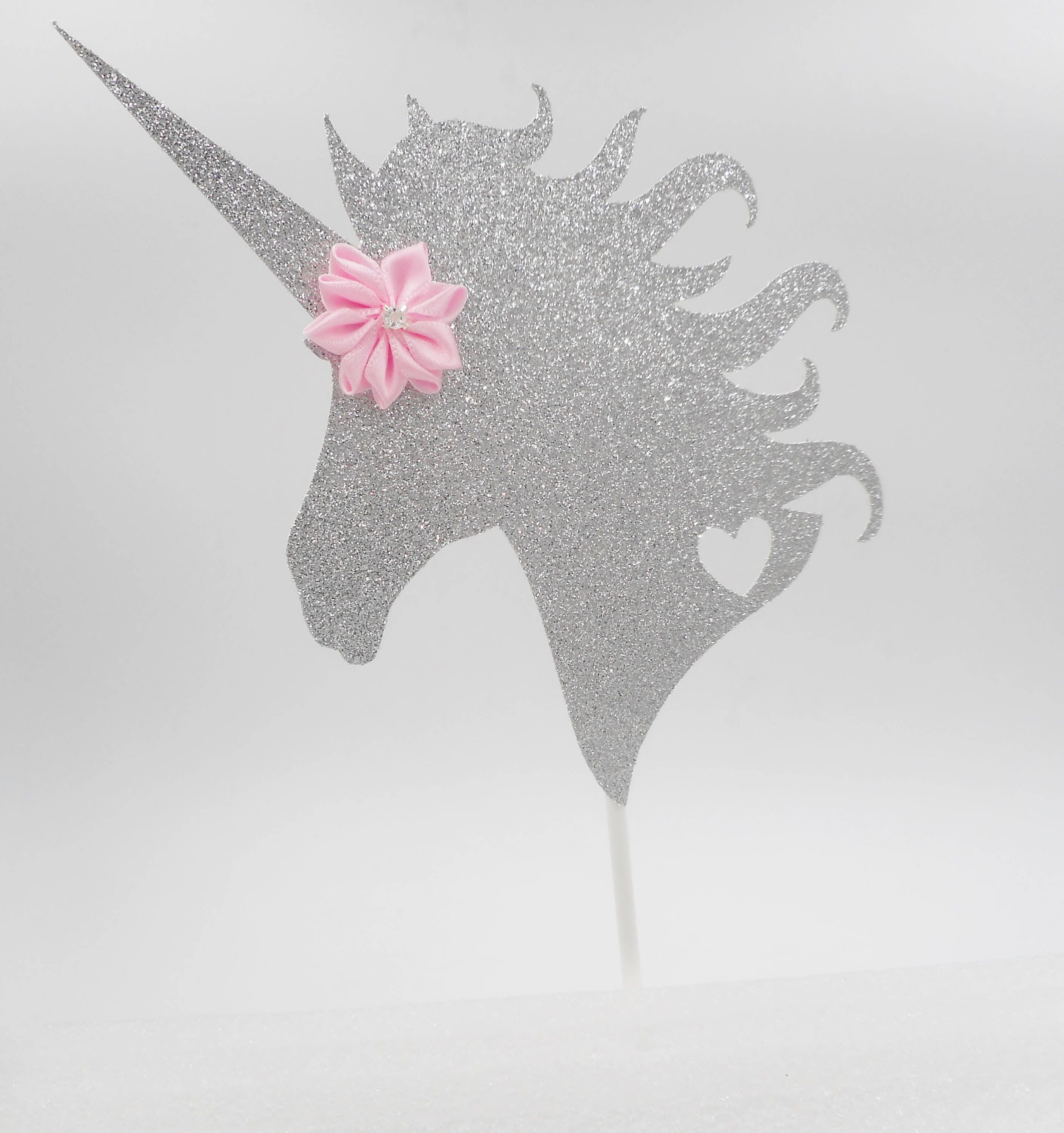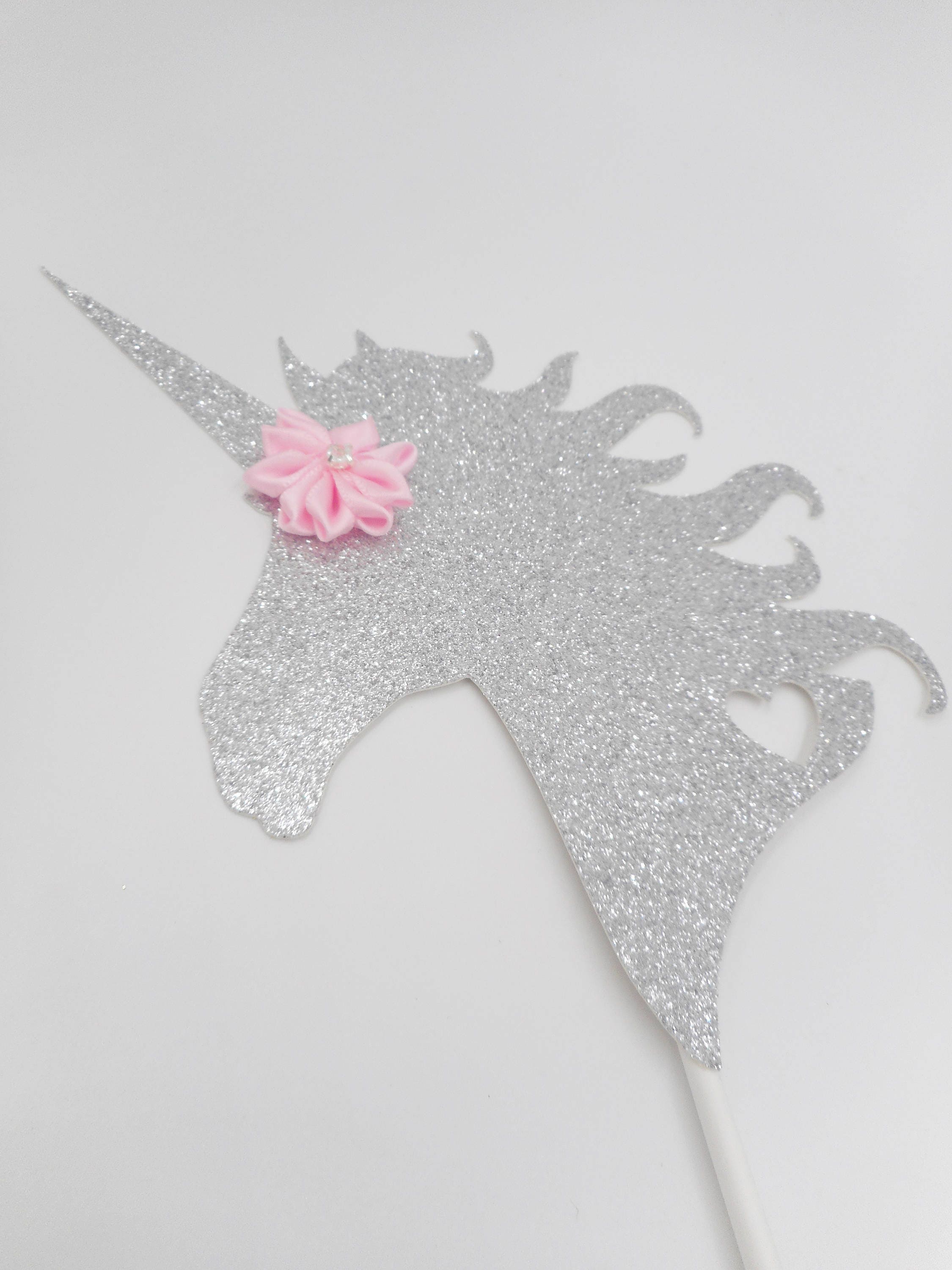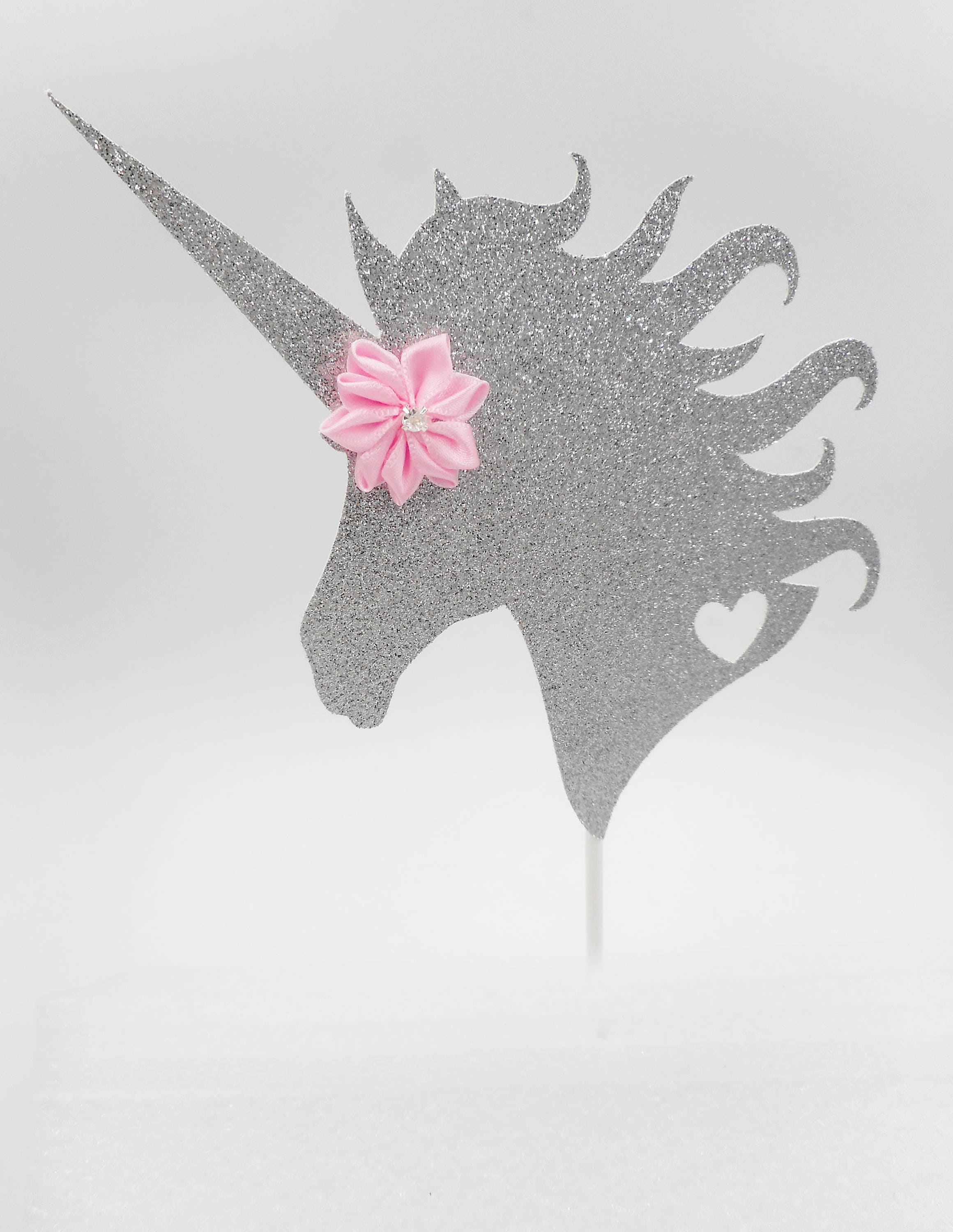 Silver Glitter Unicorn Head Cake Topper with a Pink Flower Ribbon & Rhinestone Embellishment.