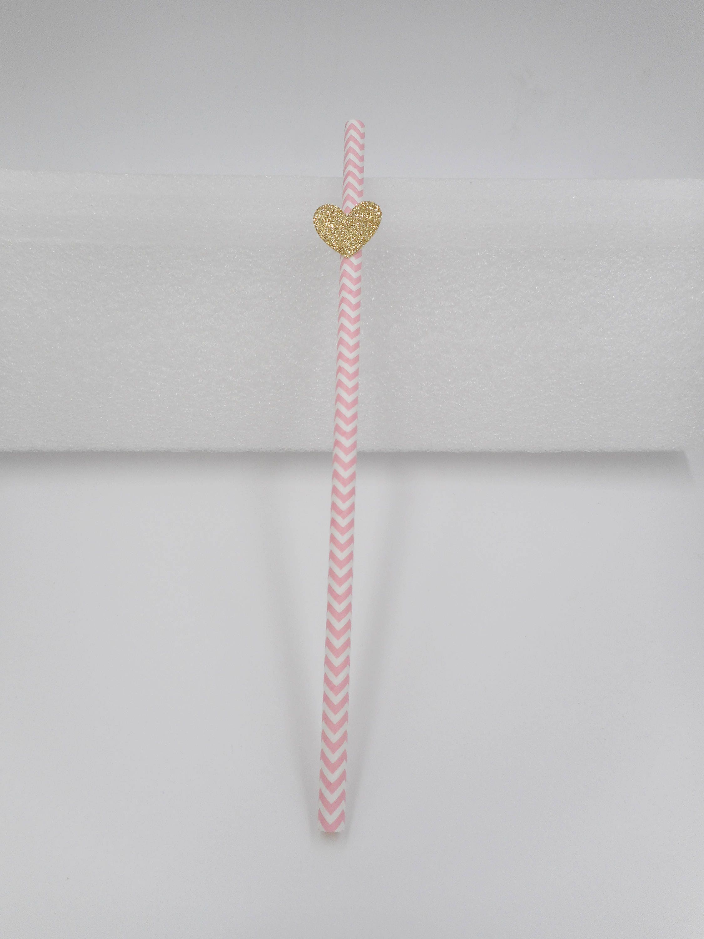 1 Dozen - 12 pc Pink Chevron Print Paper Straws with Gold Glittered Heart Embellishment