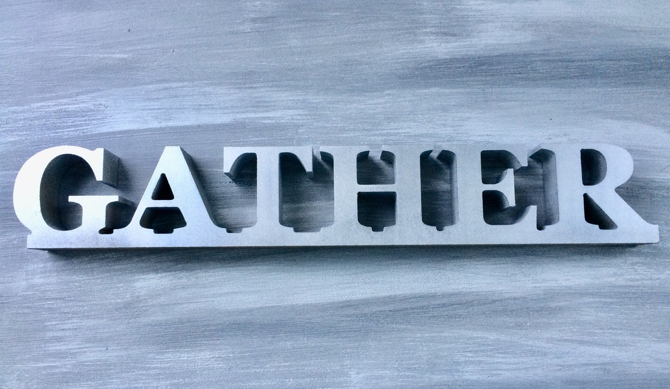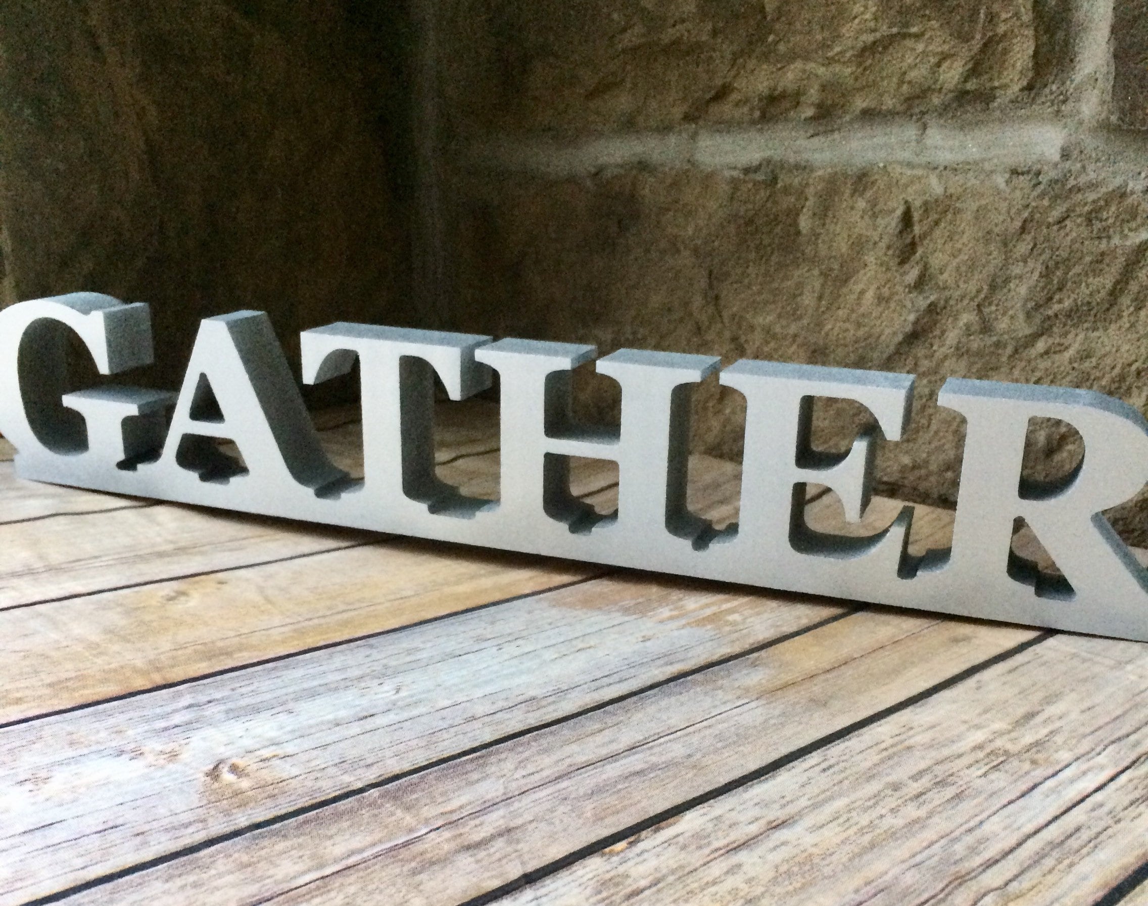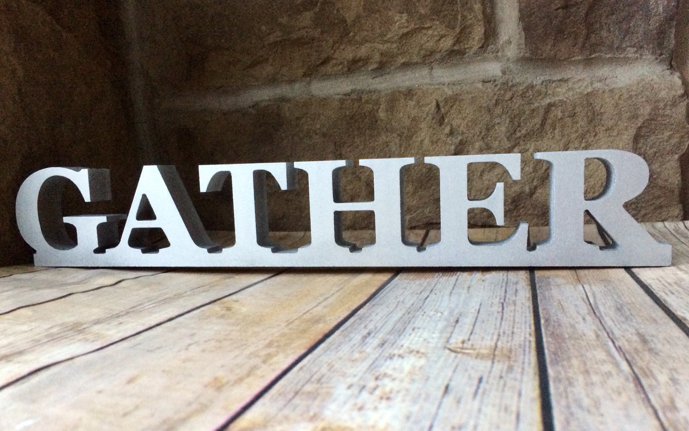 Farmhouse Gather Sign, Wood Shelf Decor, Shelf Sitter, Standing Sign, Letter Sign, Gather Wood Decor, Tabletop, Mantel Decor, Silver