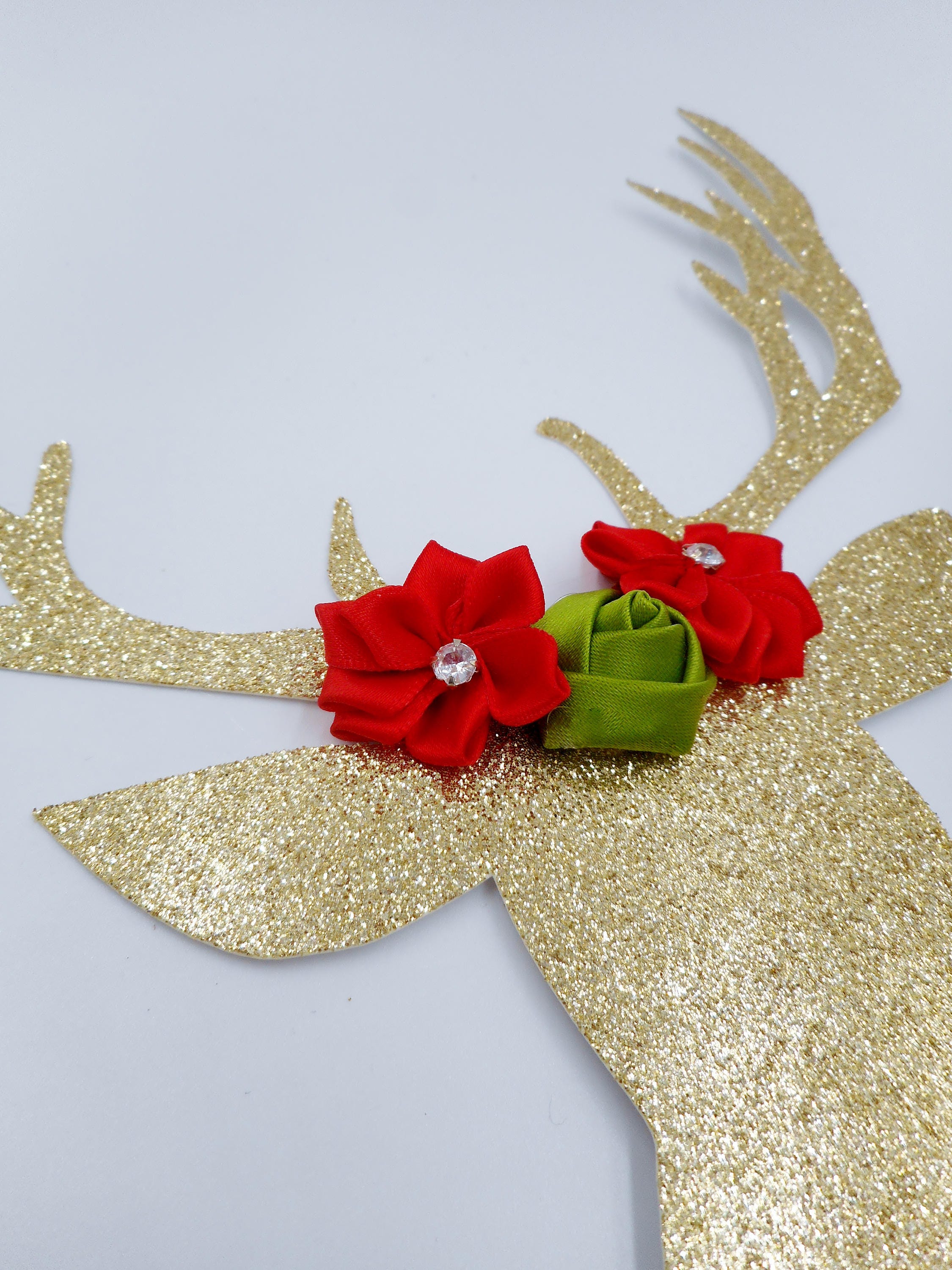 Gold Glitter Deer and Antler Cake Topper embellished with satin flowers