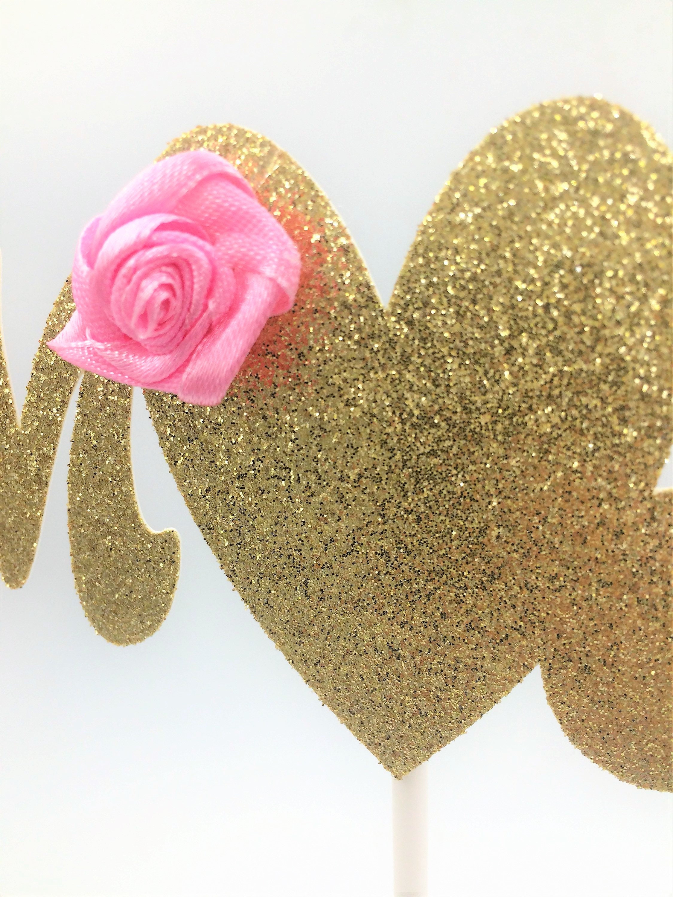 Gold Glitter Mom Cake Topper embellished with pink satin rose.