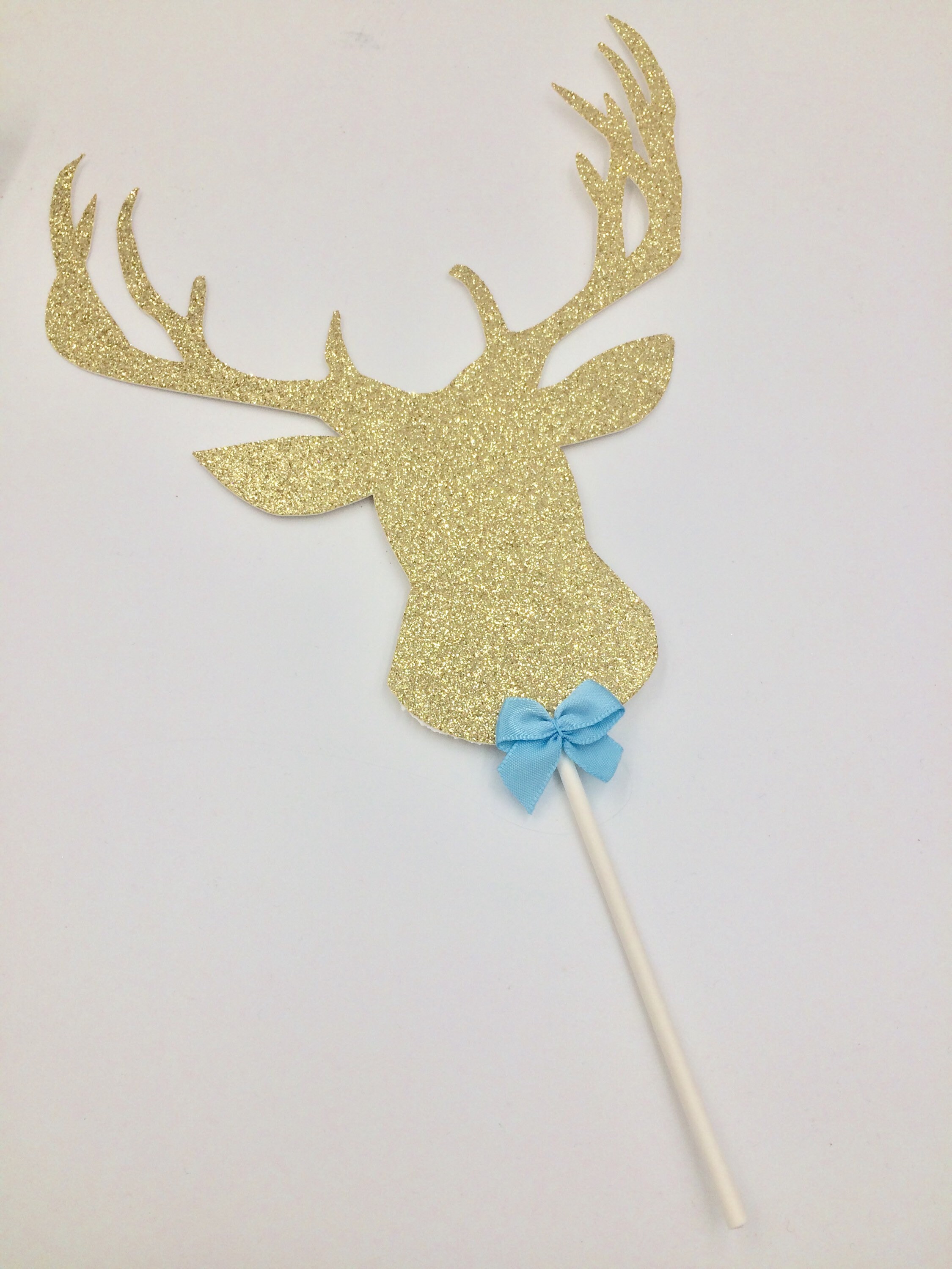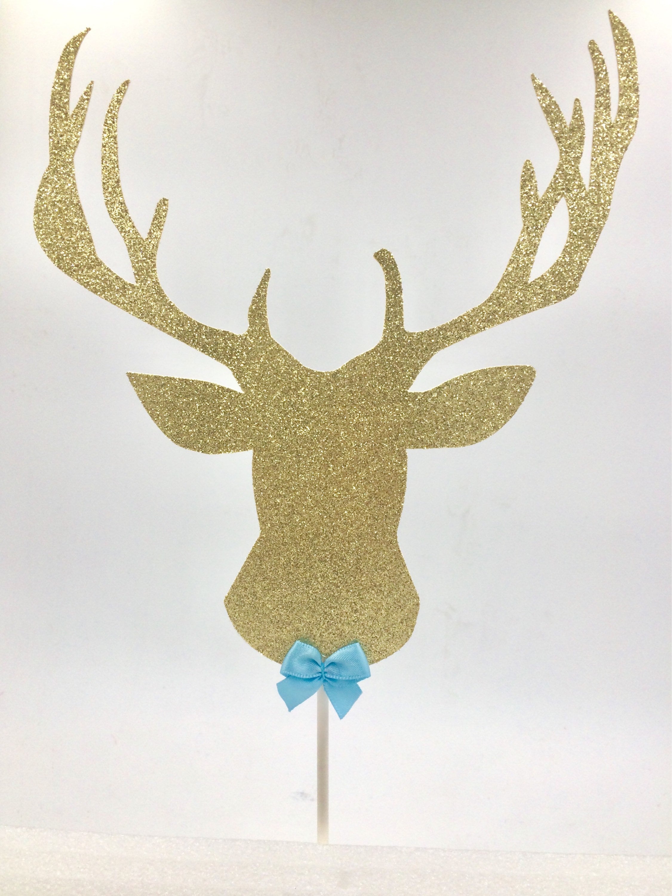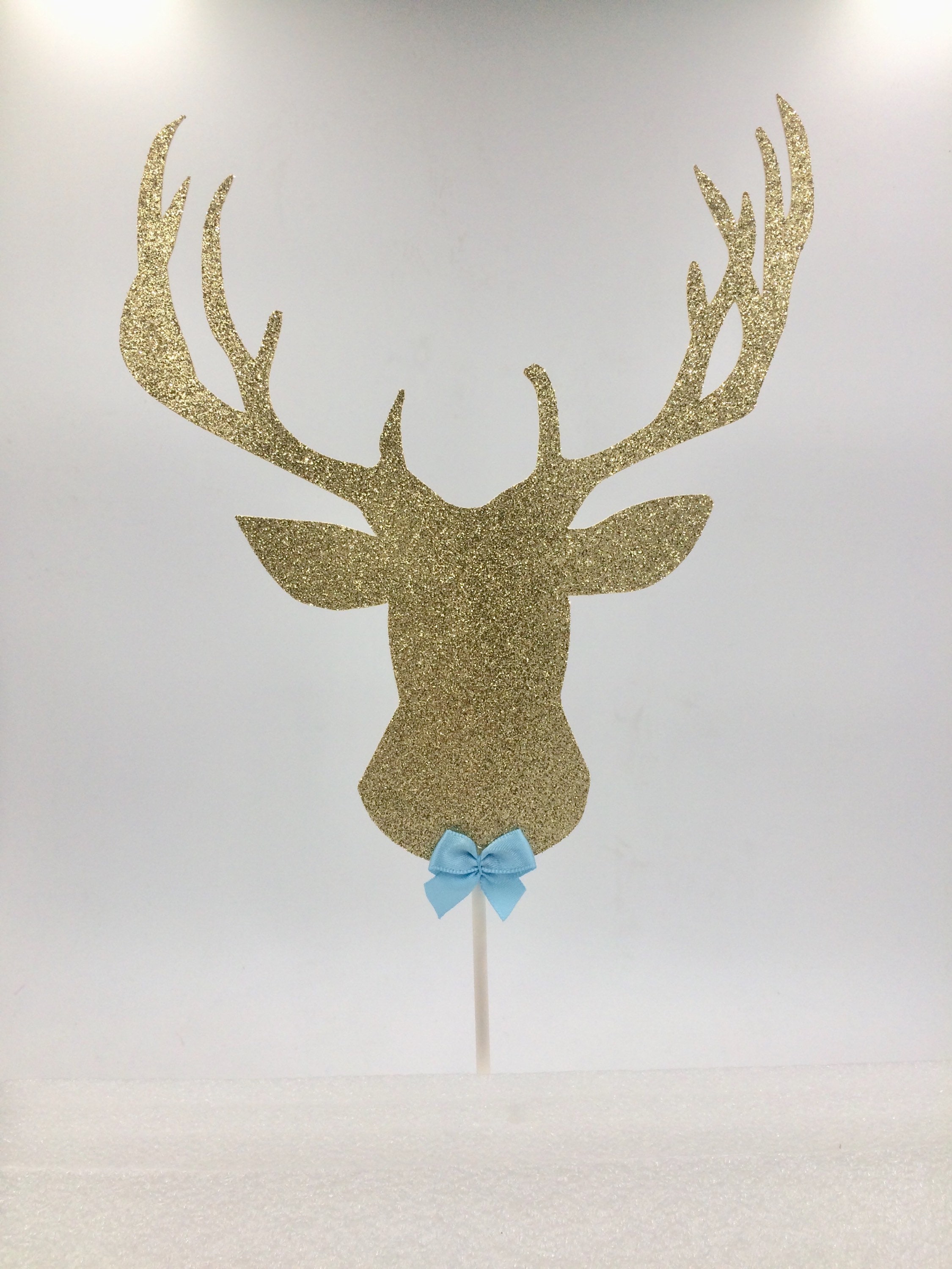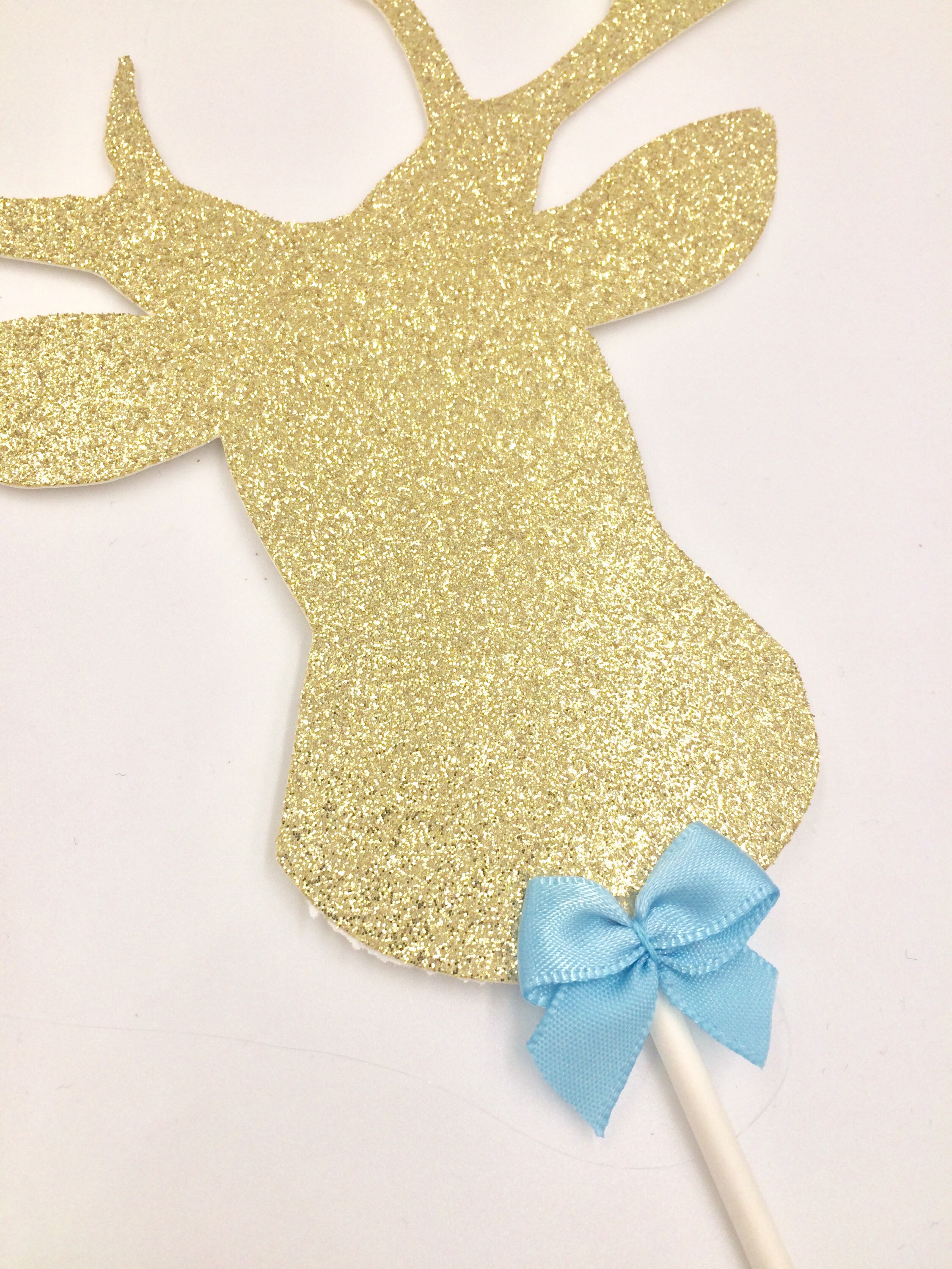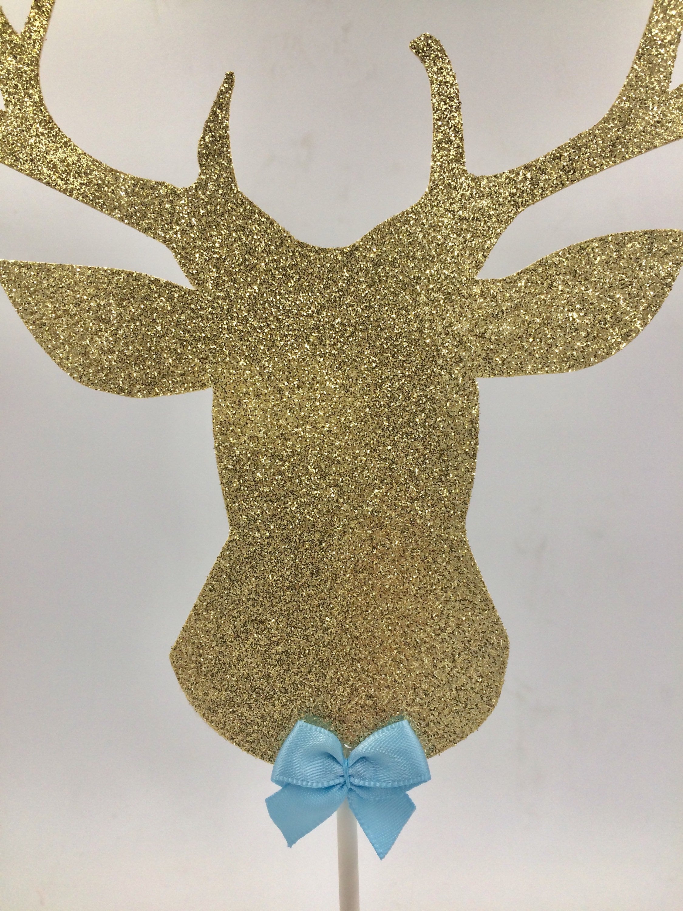 Gold Glitter or Silver Glitter Deer and Antler Cake Topper embellished with satin blue ribbon