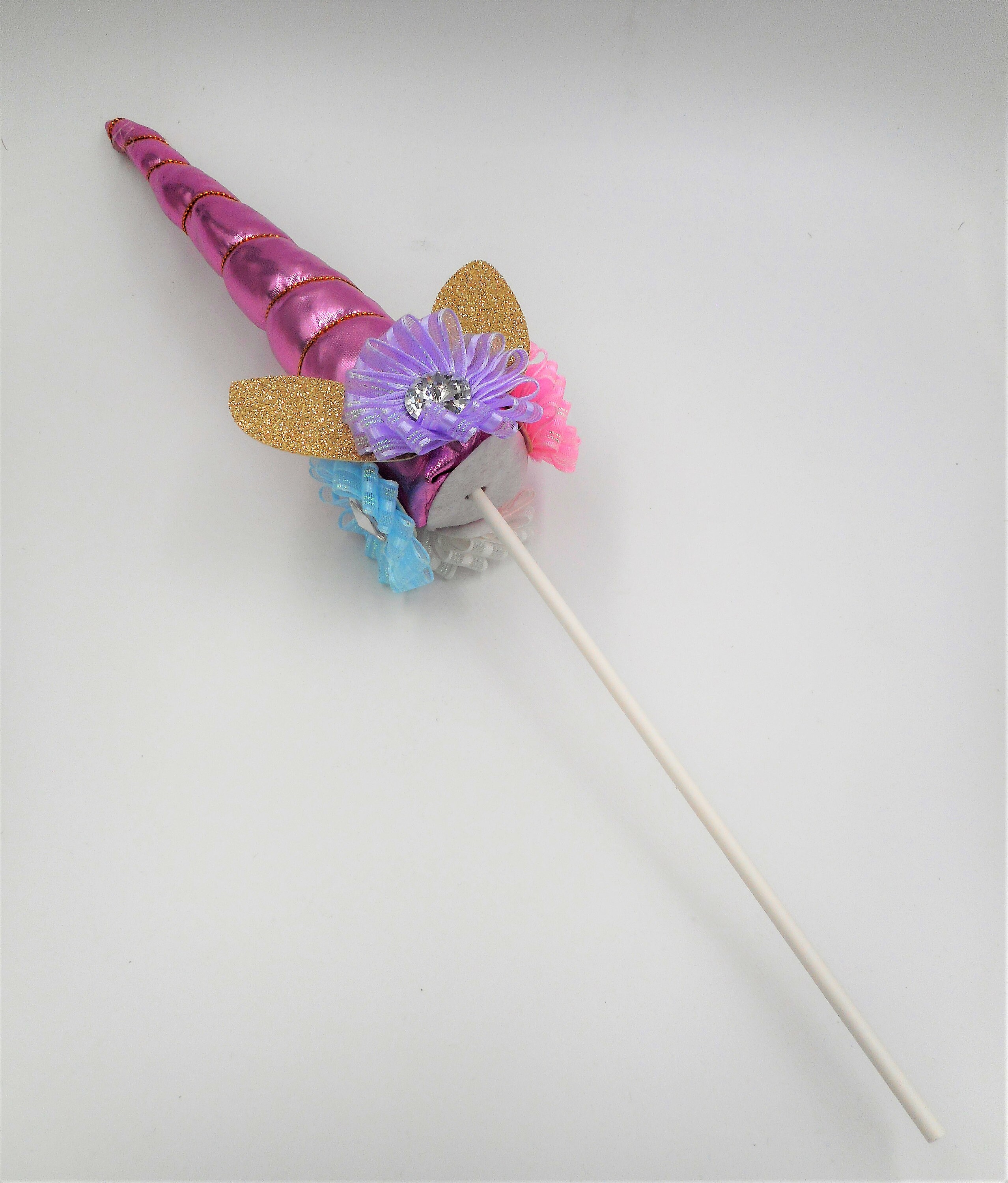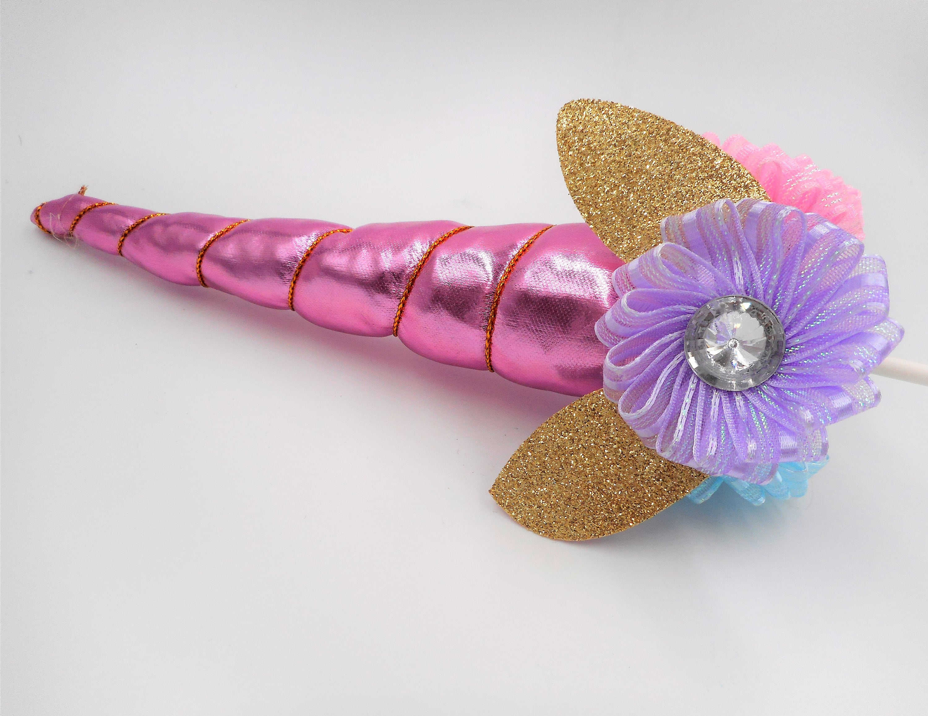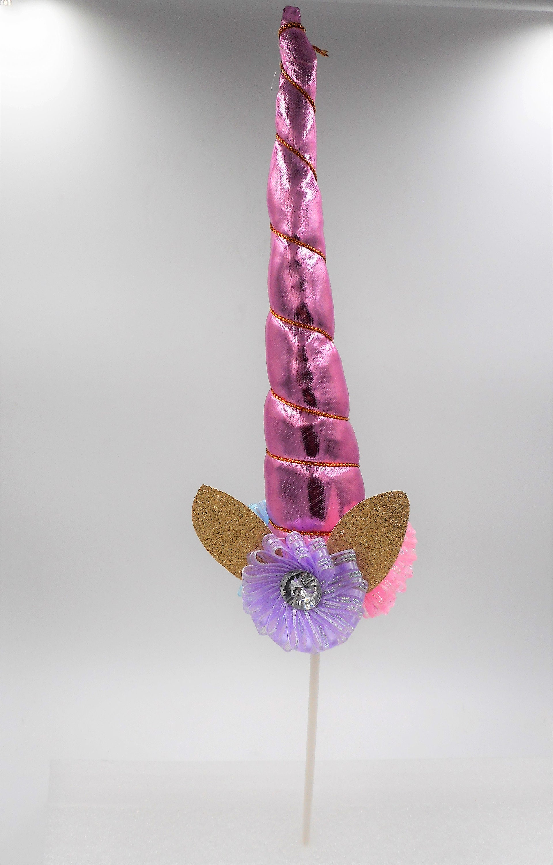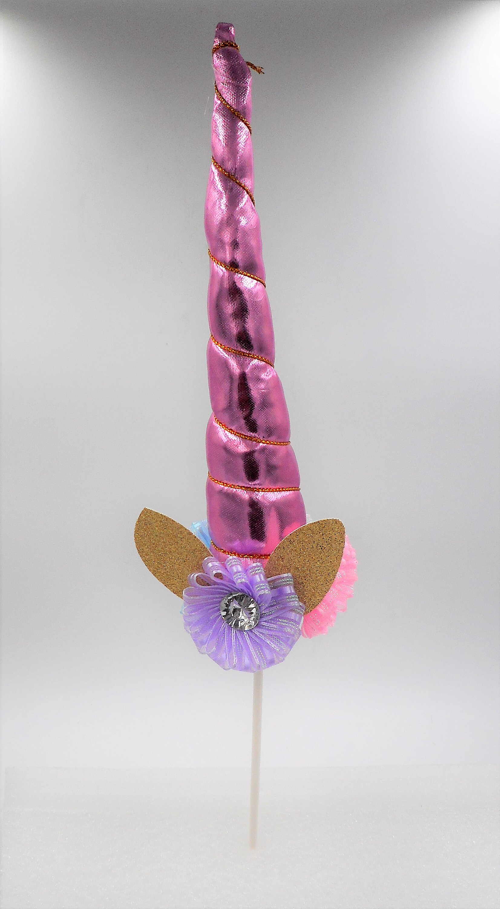 Metallic Pink Fabric Foam Filled Unicorn Horn Cake Topper with Lavender, Pink, Blue & White Ribbon Flower Embellishments.
