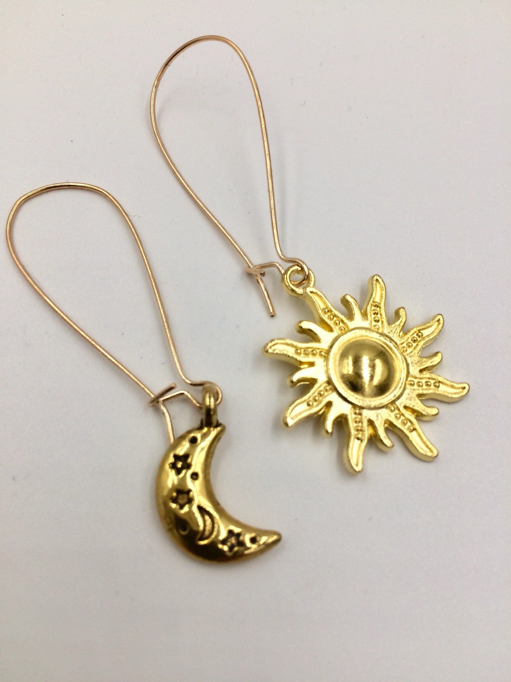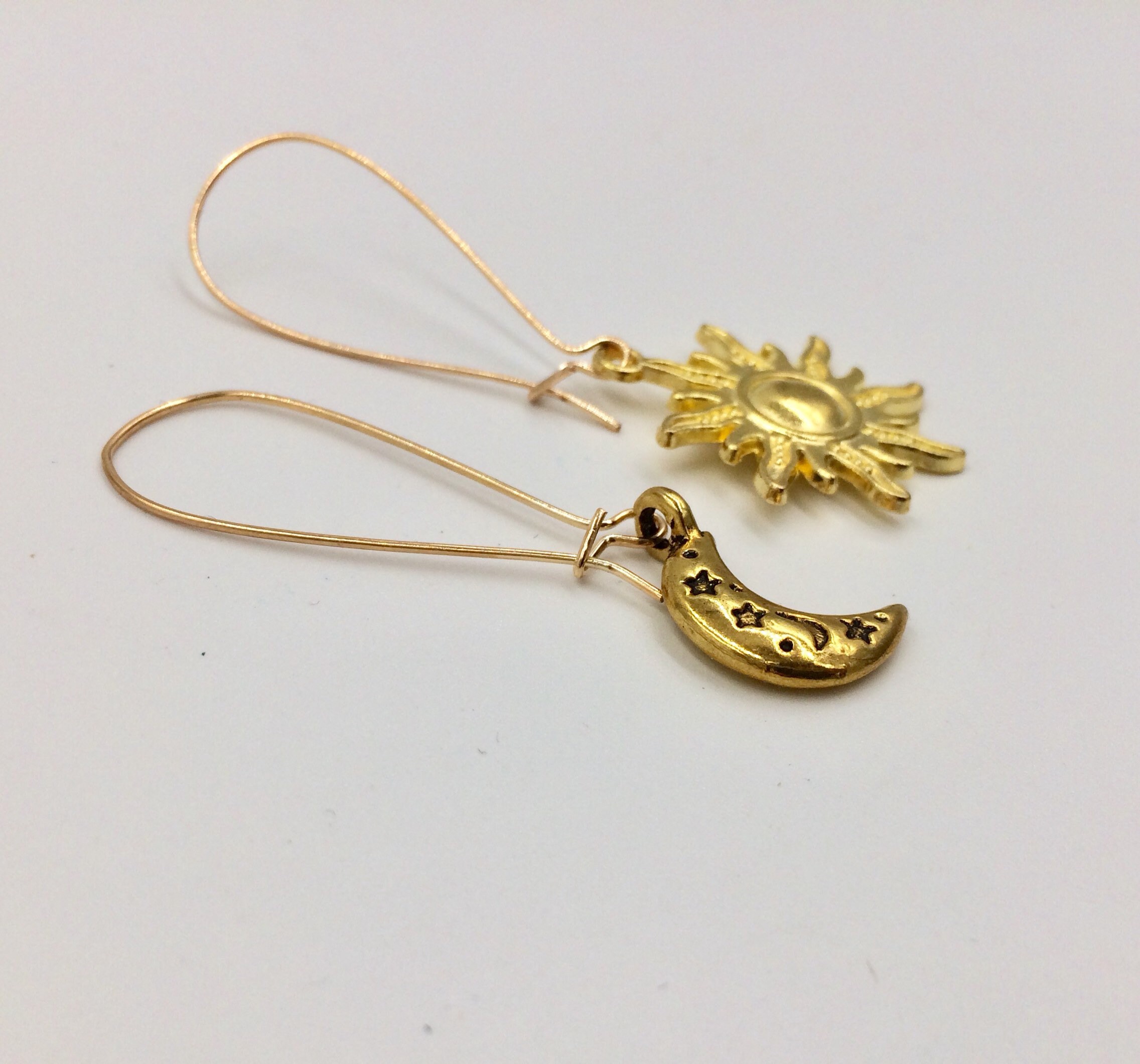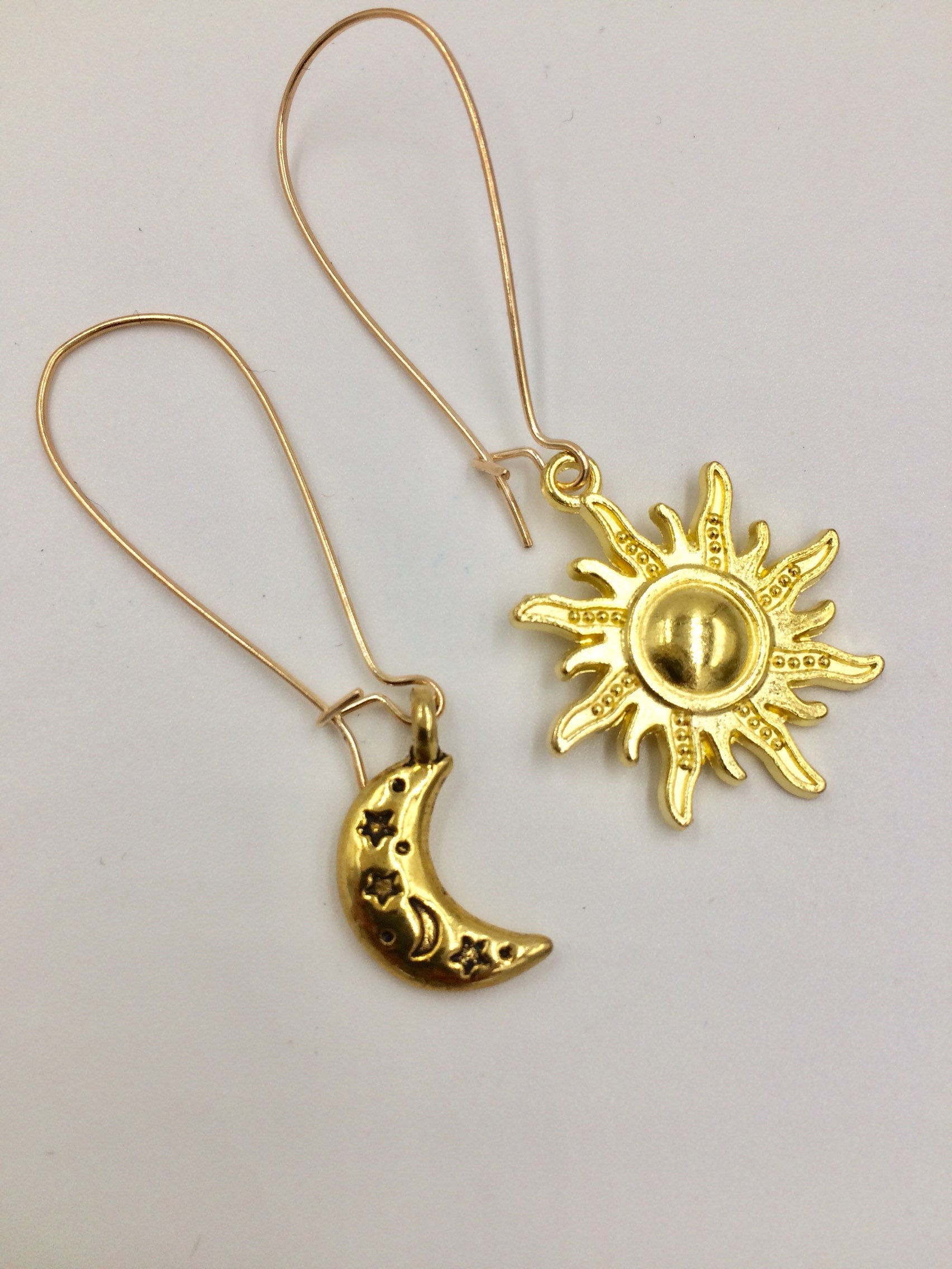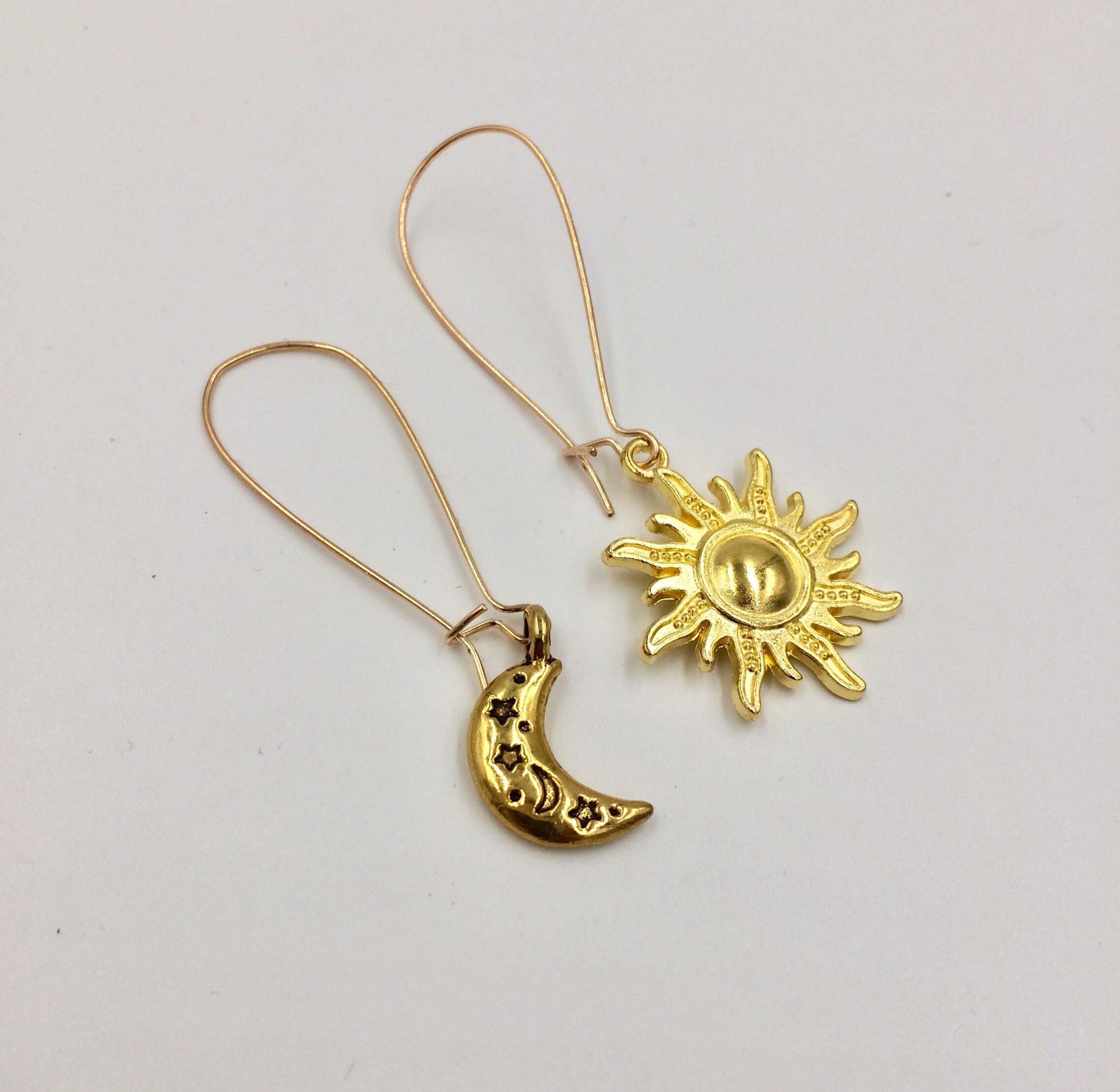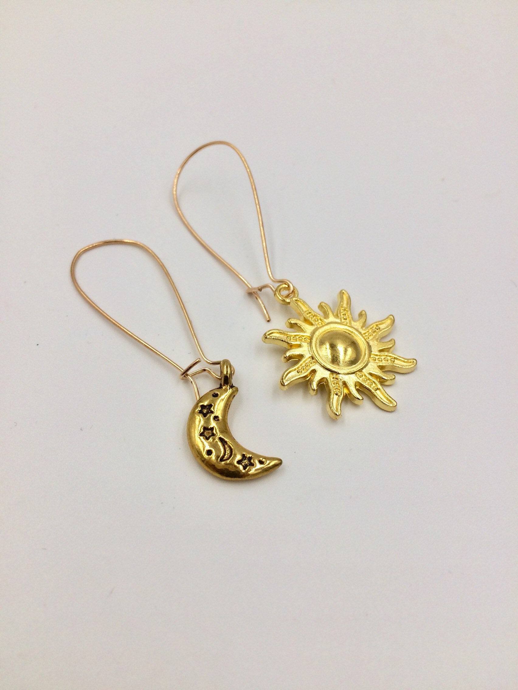 Sun and Moon Charm Dangle Earrings; sun jewelry, sun and moon jewelry, boho earrings, mismatch earrings, gifts for friendship, gold tone