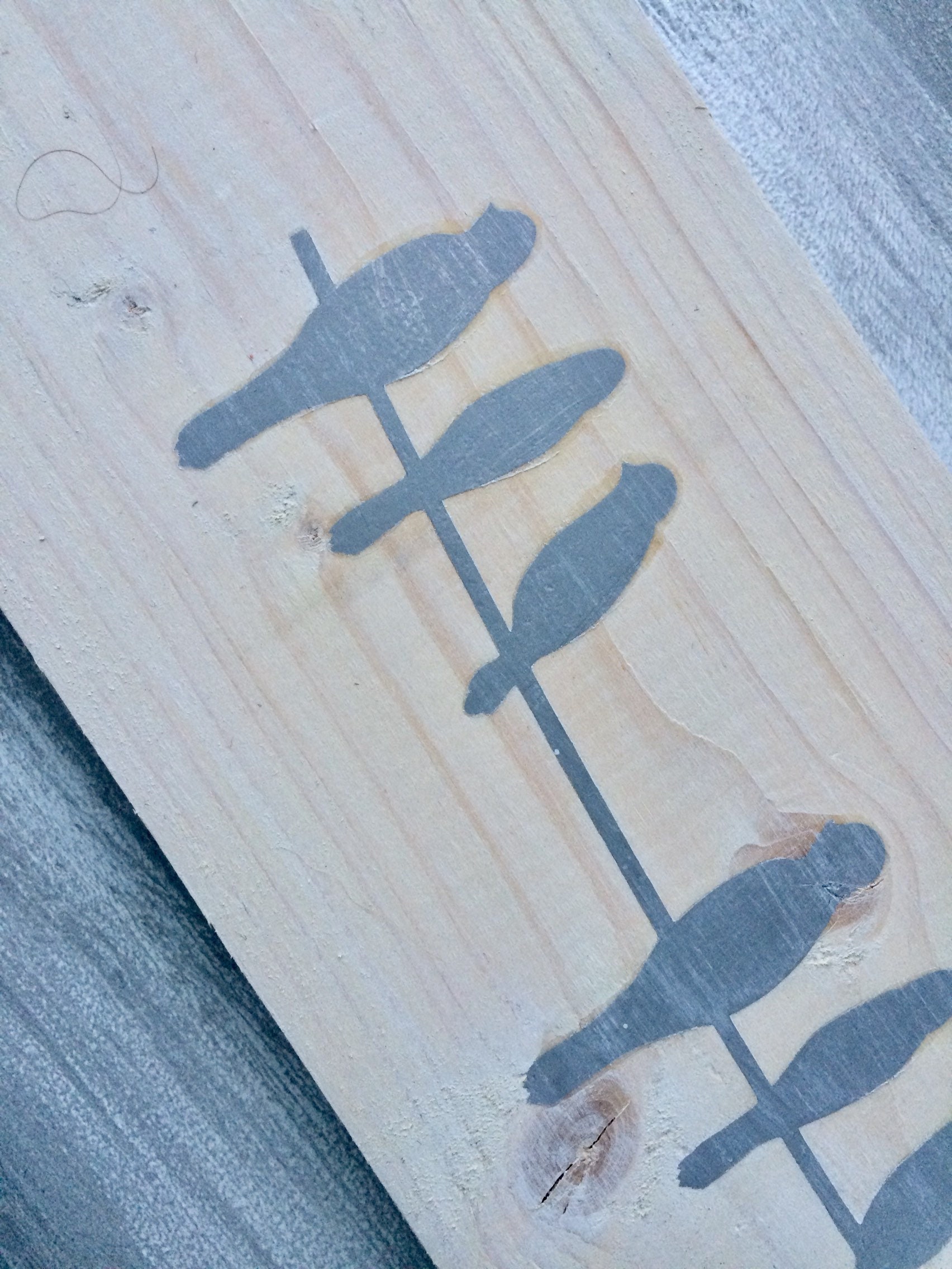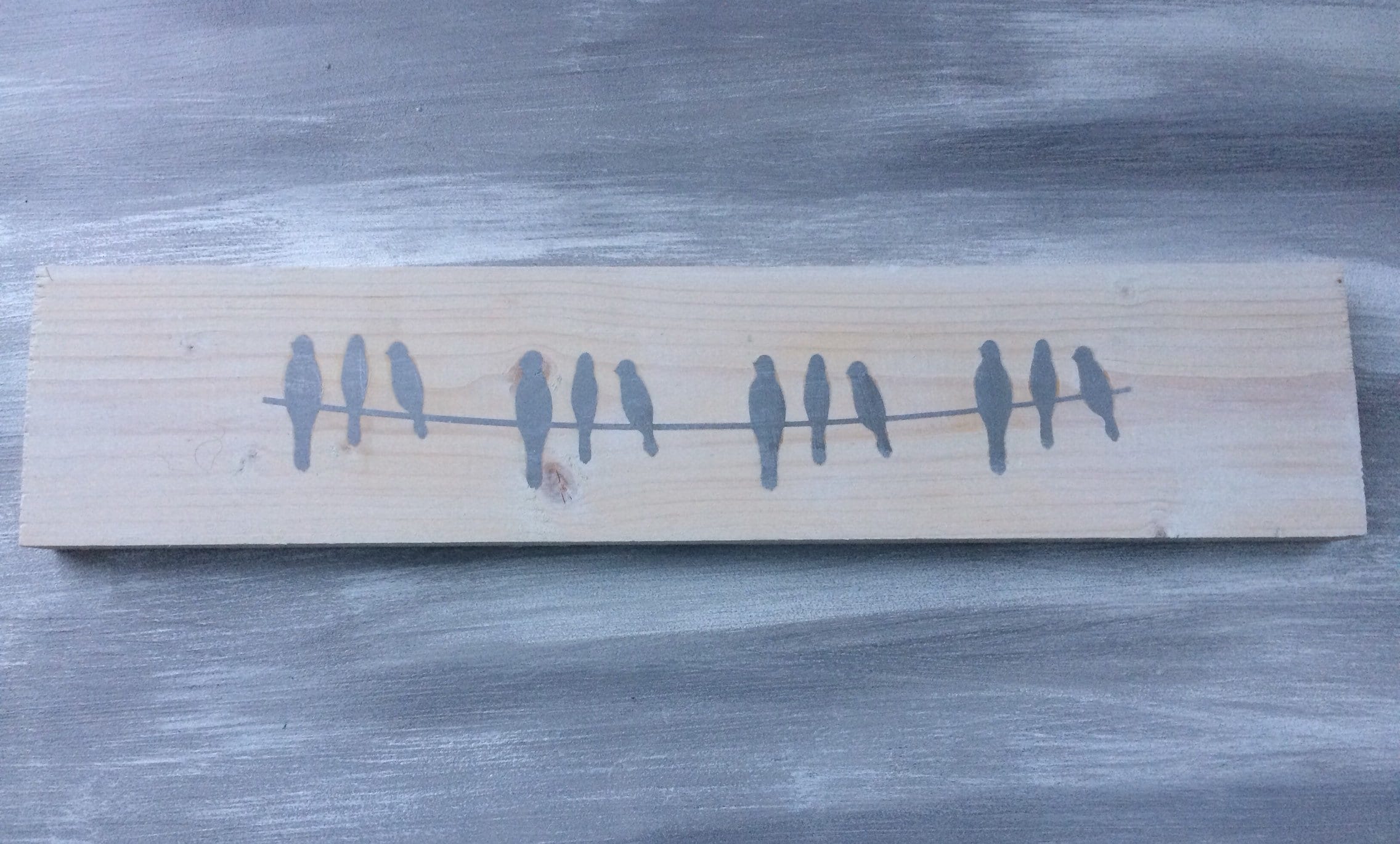 White washed pine board with silver birds on a branch