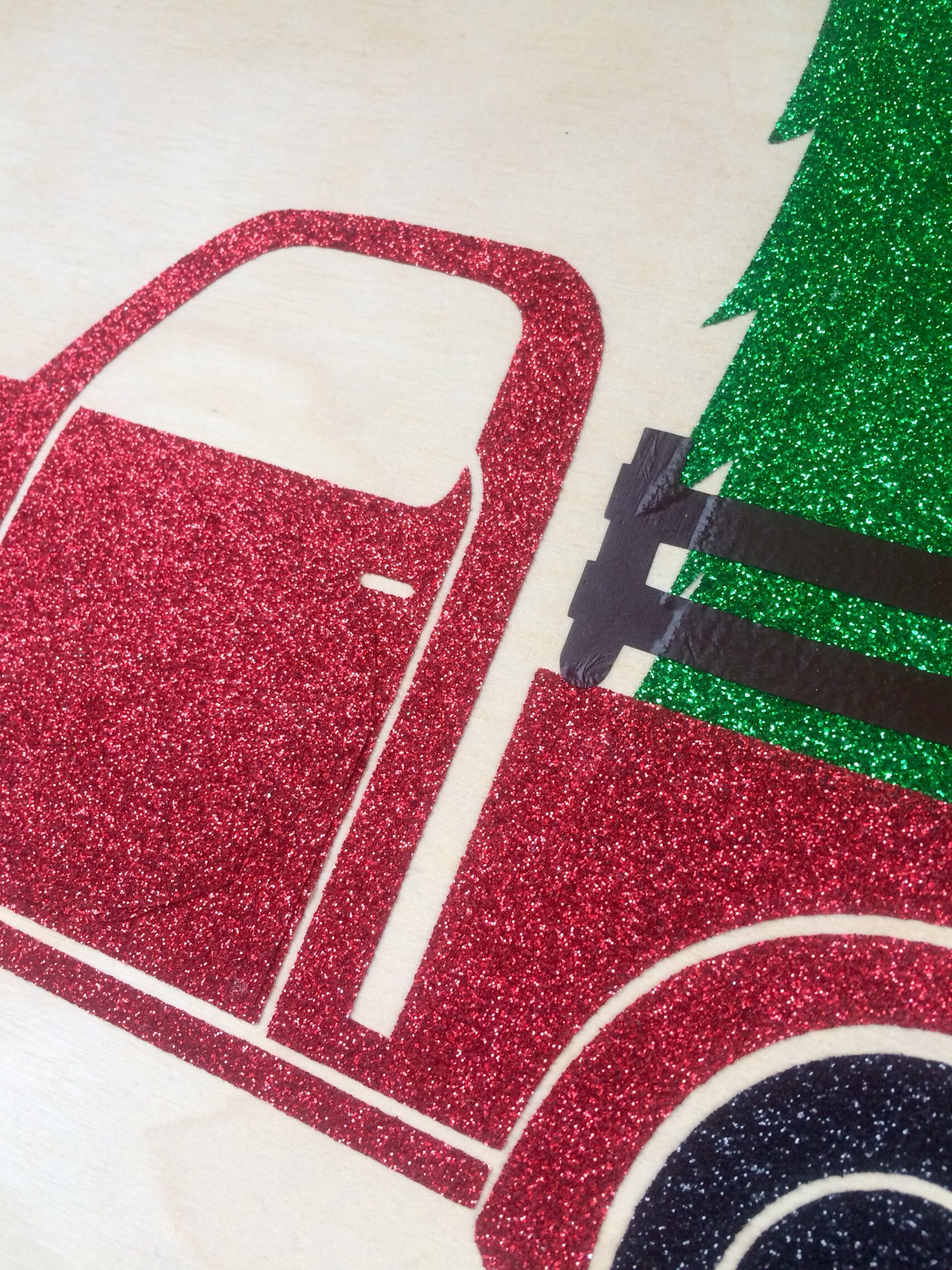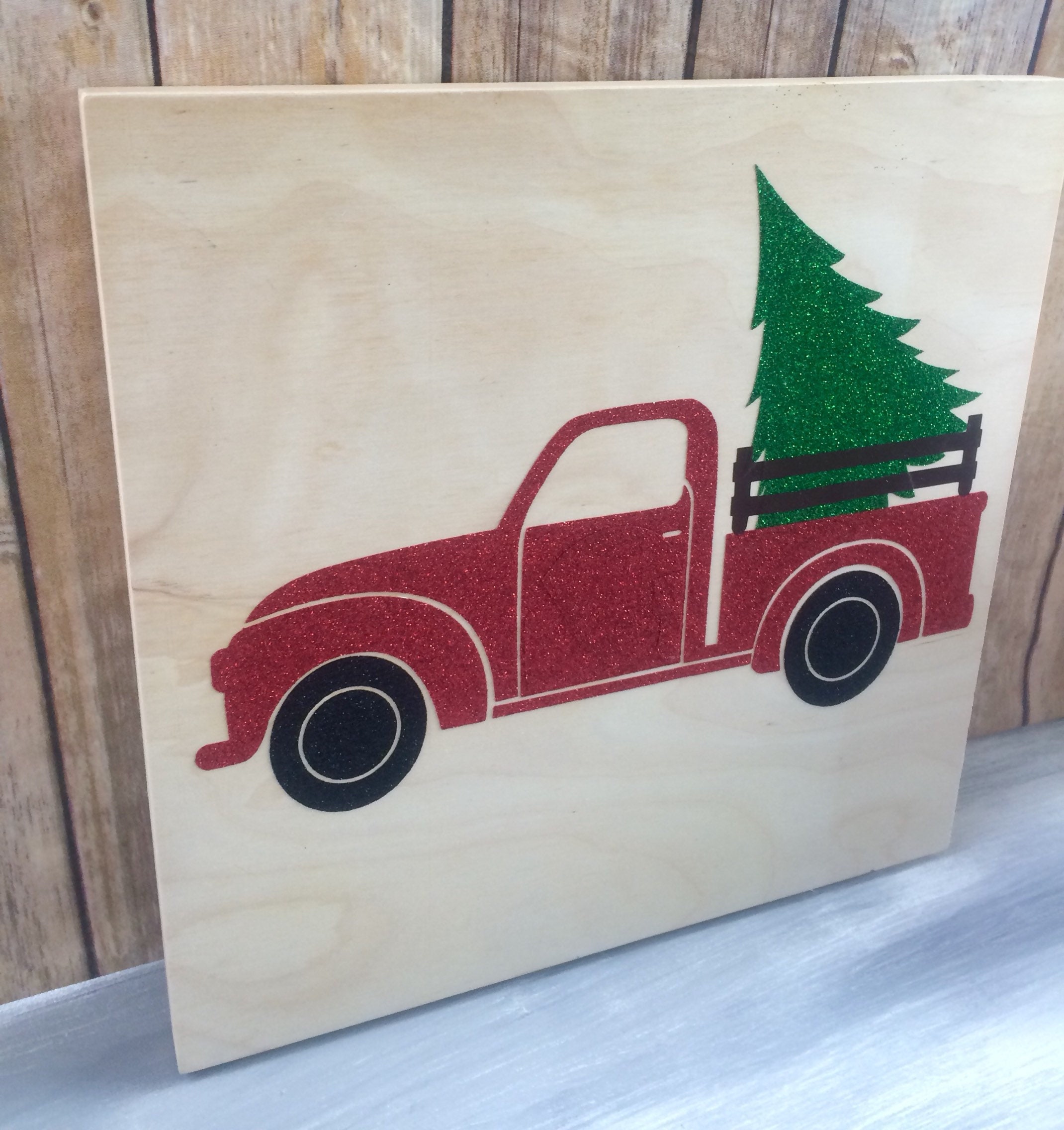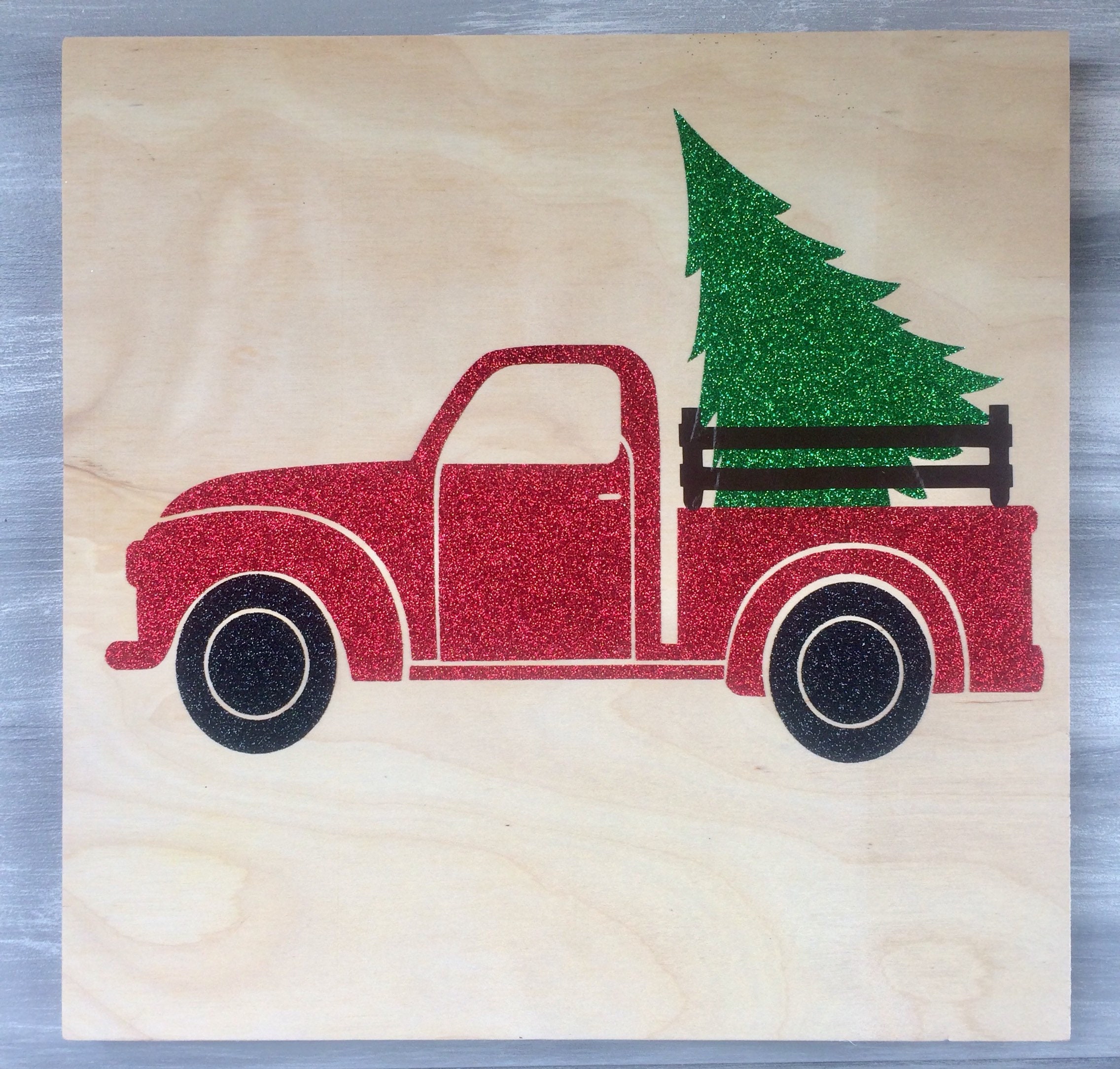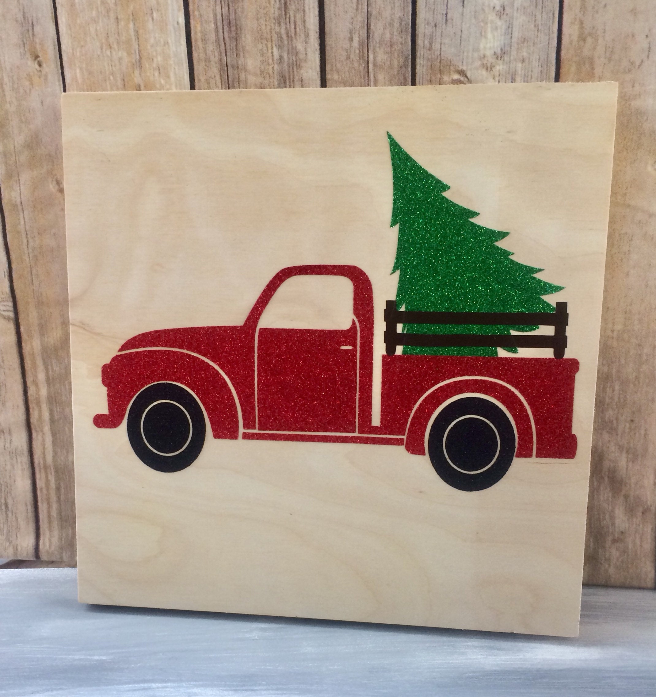 Natural unstained Wooden Wall Sign With Glittered Red Truck & Glittered Christmas Tree.