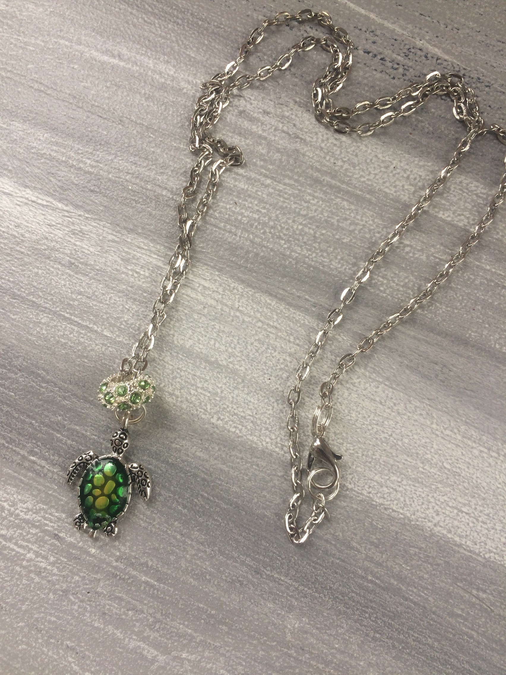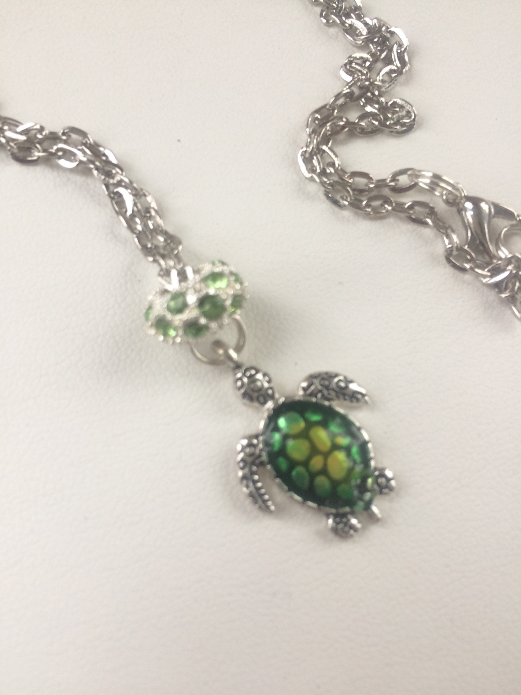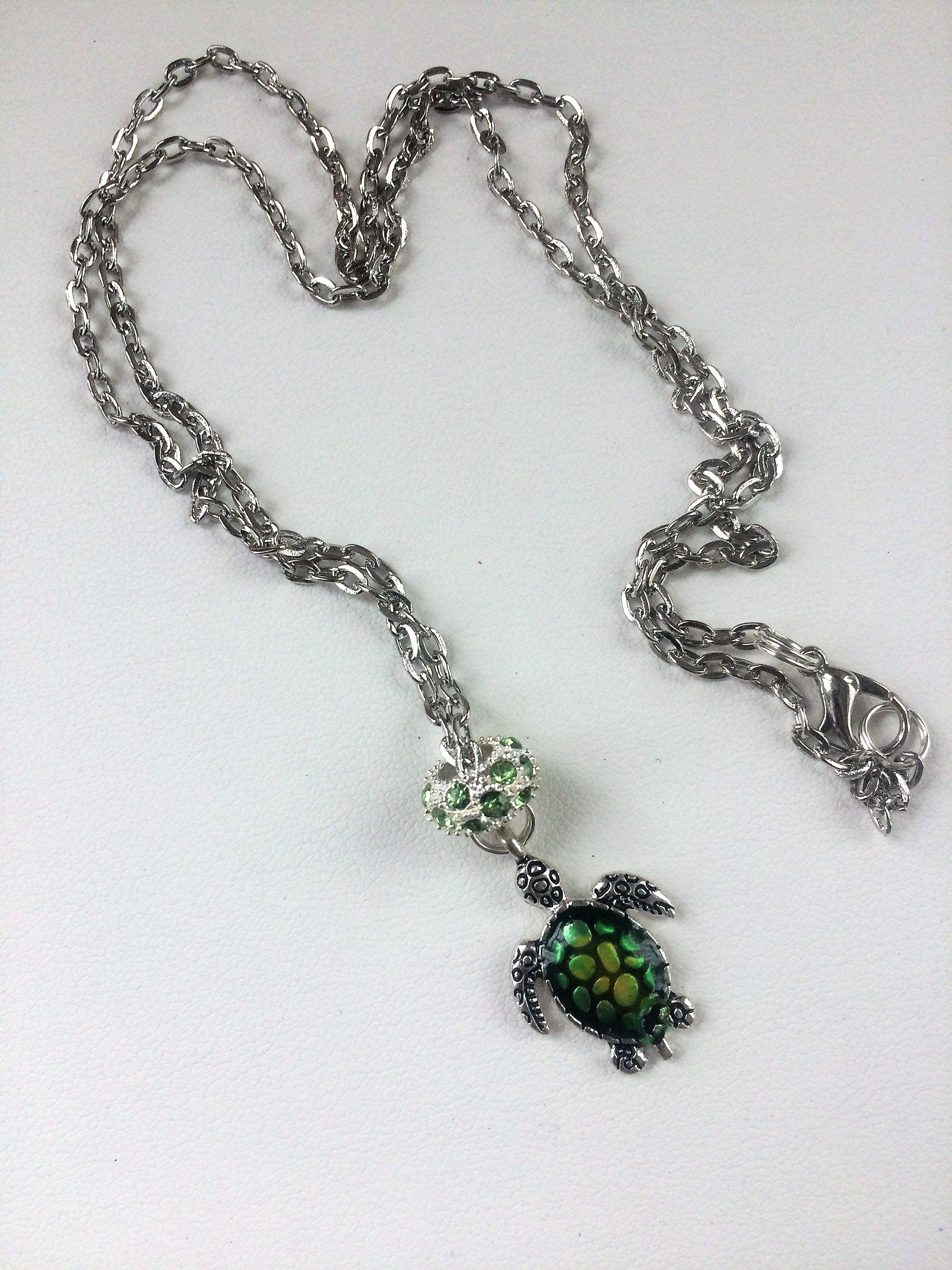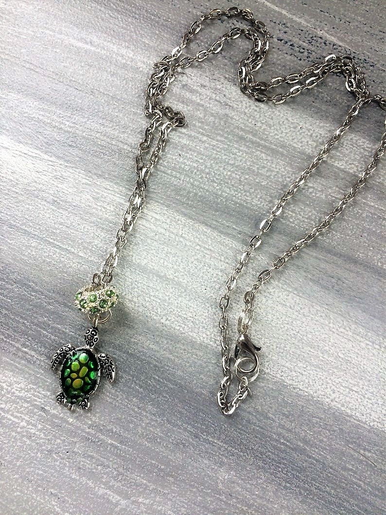 Sea Turtle Charm & Rhinestone Bead on a Silvertone 24”L Chain Necklace with lobster clasp closure