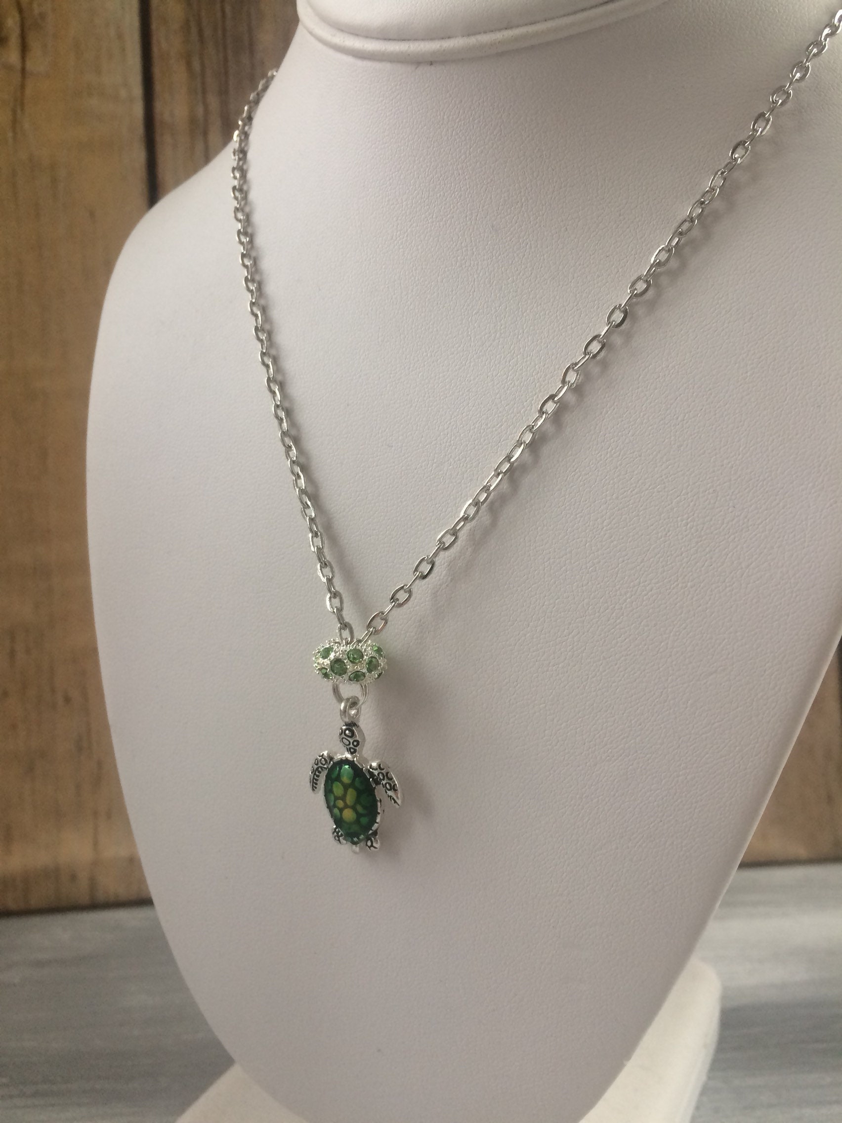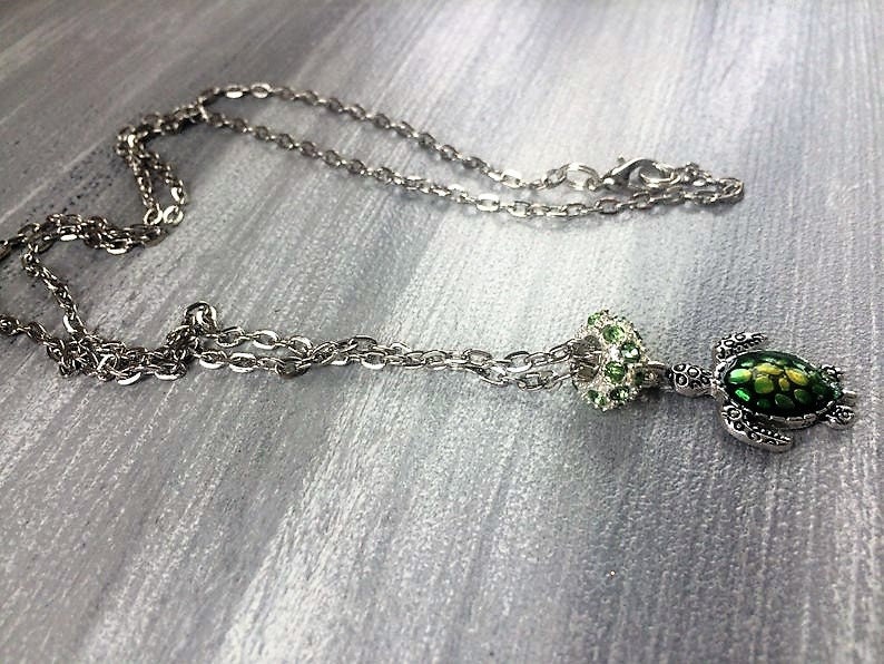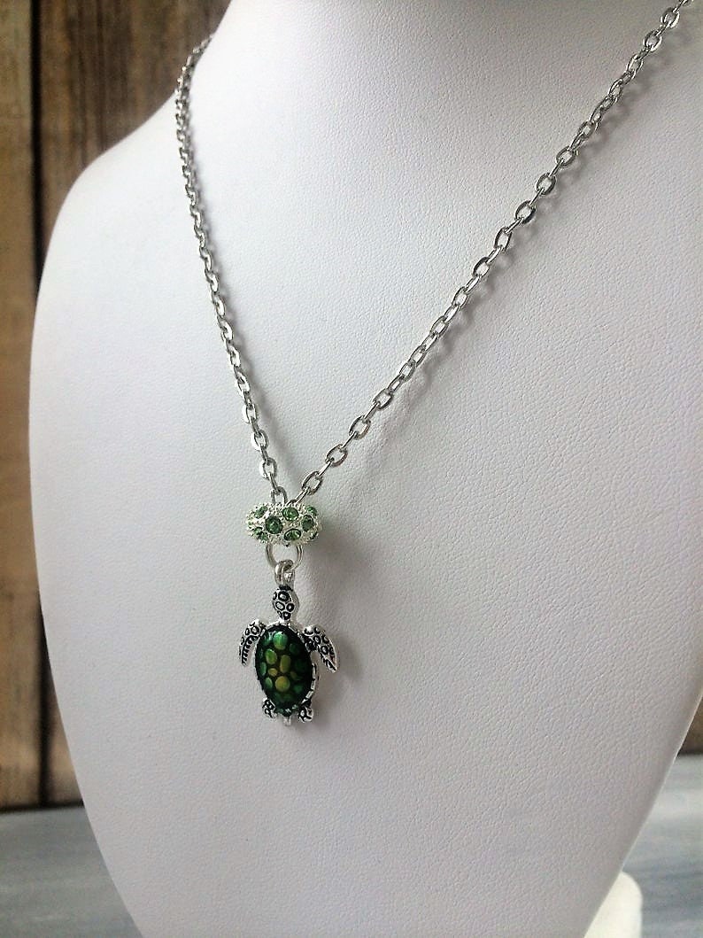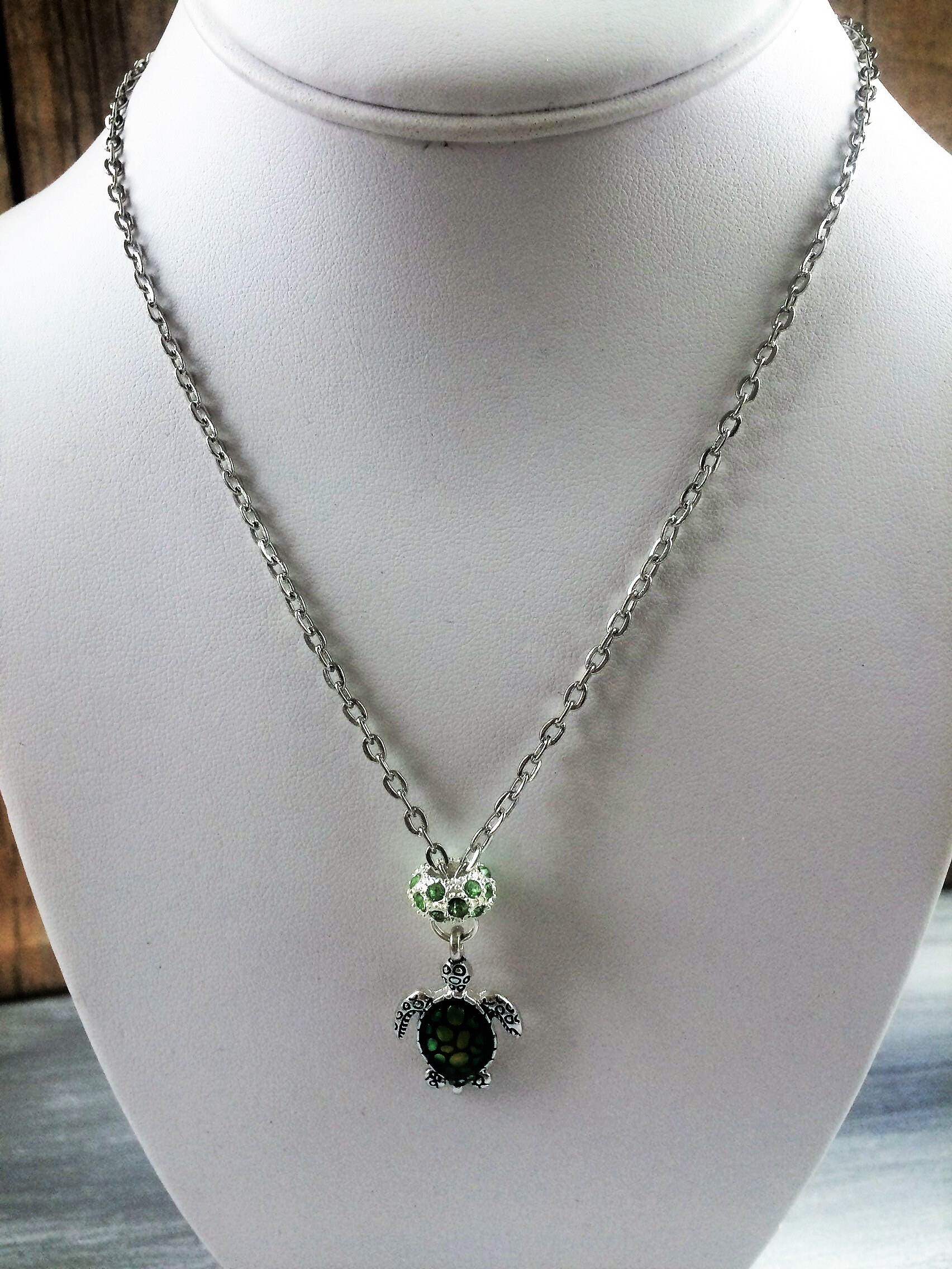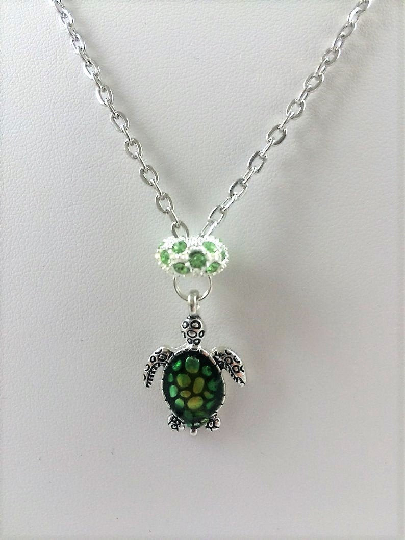 Sea Turtle Charm & Rhinestone Bead on a Silvertone 24”L Chain Necklace with lobster clasp closure