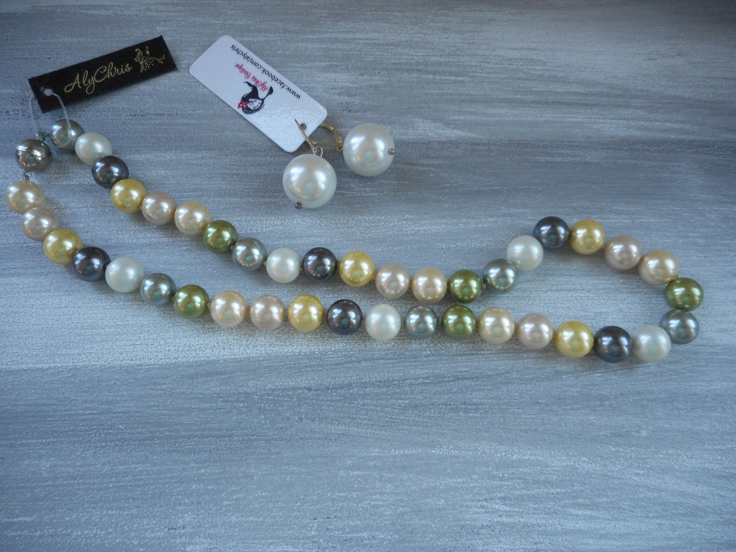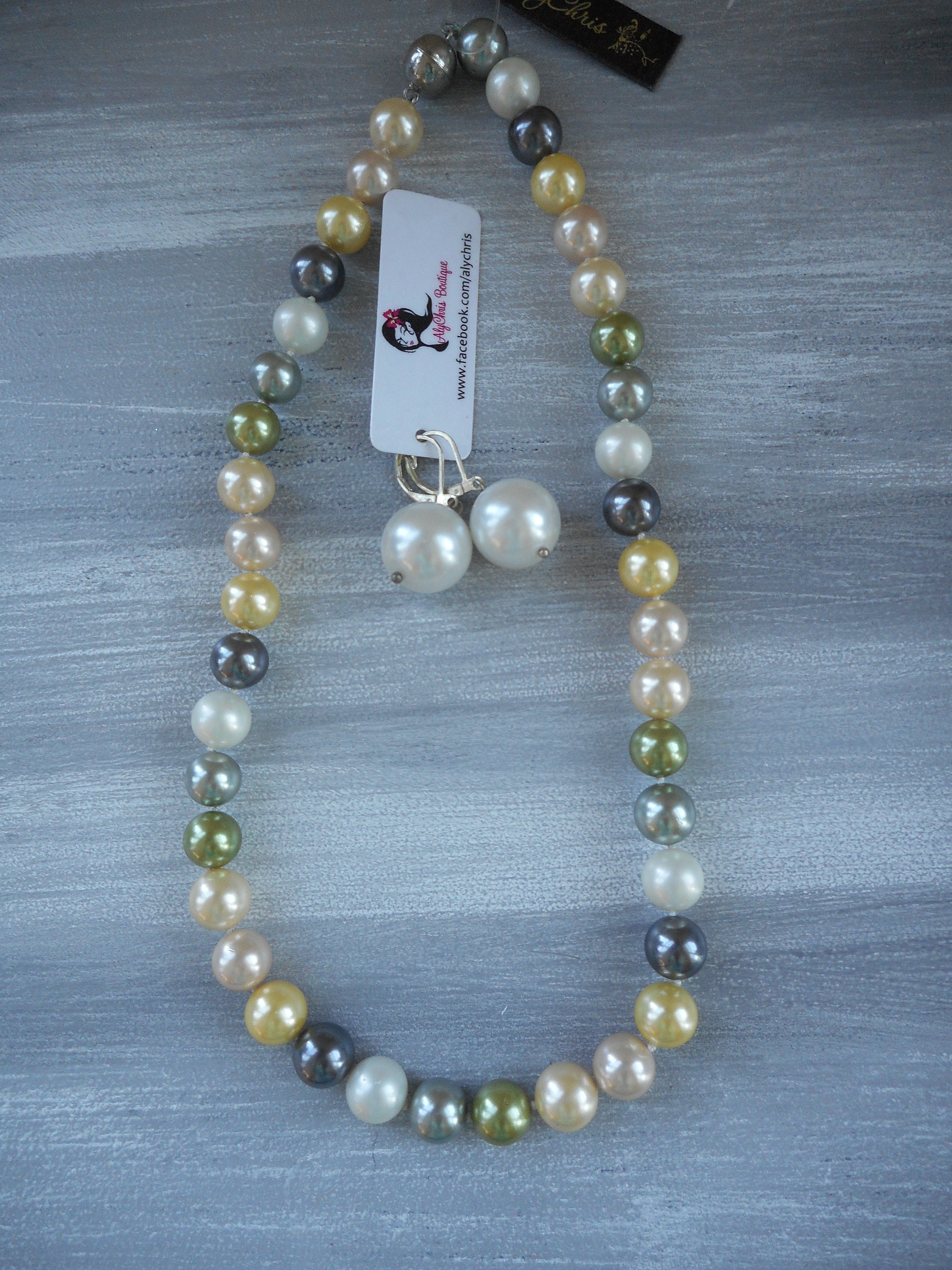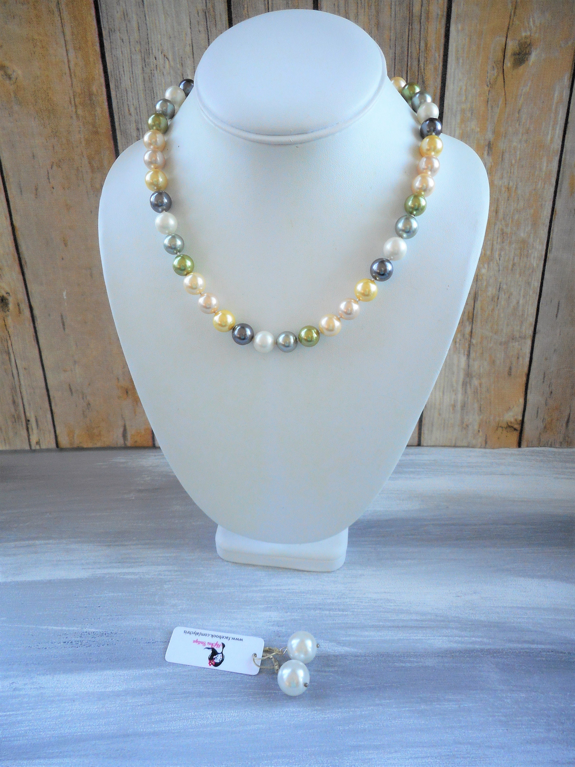 18" 10mm Faux Pearl Necklace Earring Set in Greens, Greys and White Shades