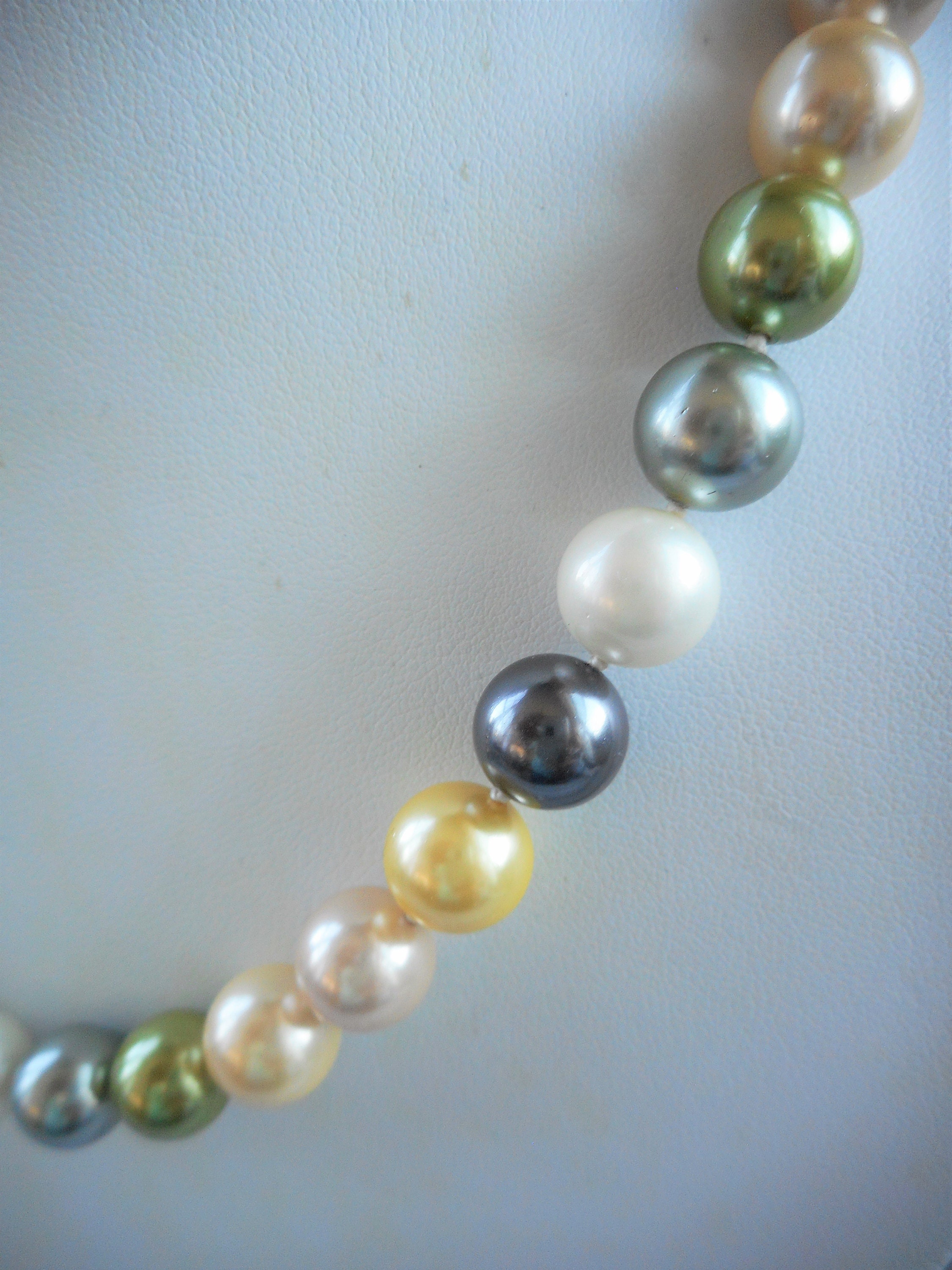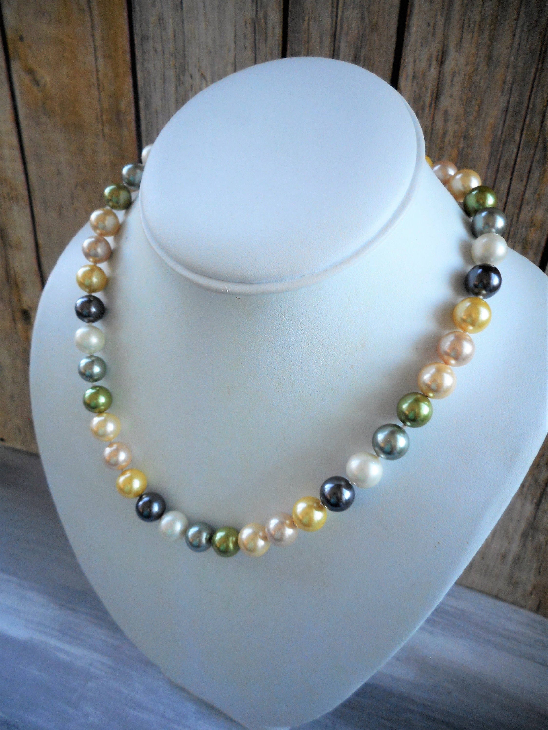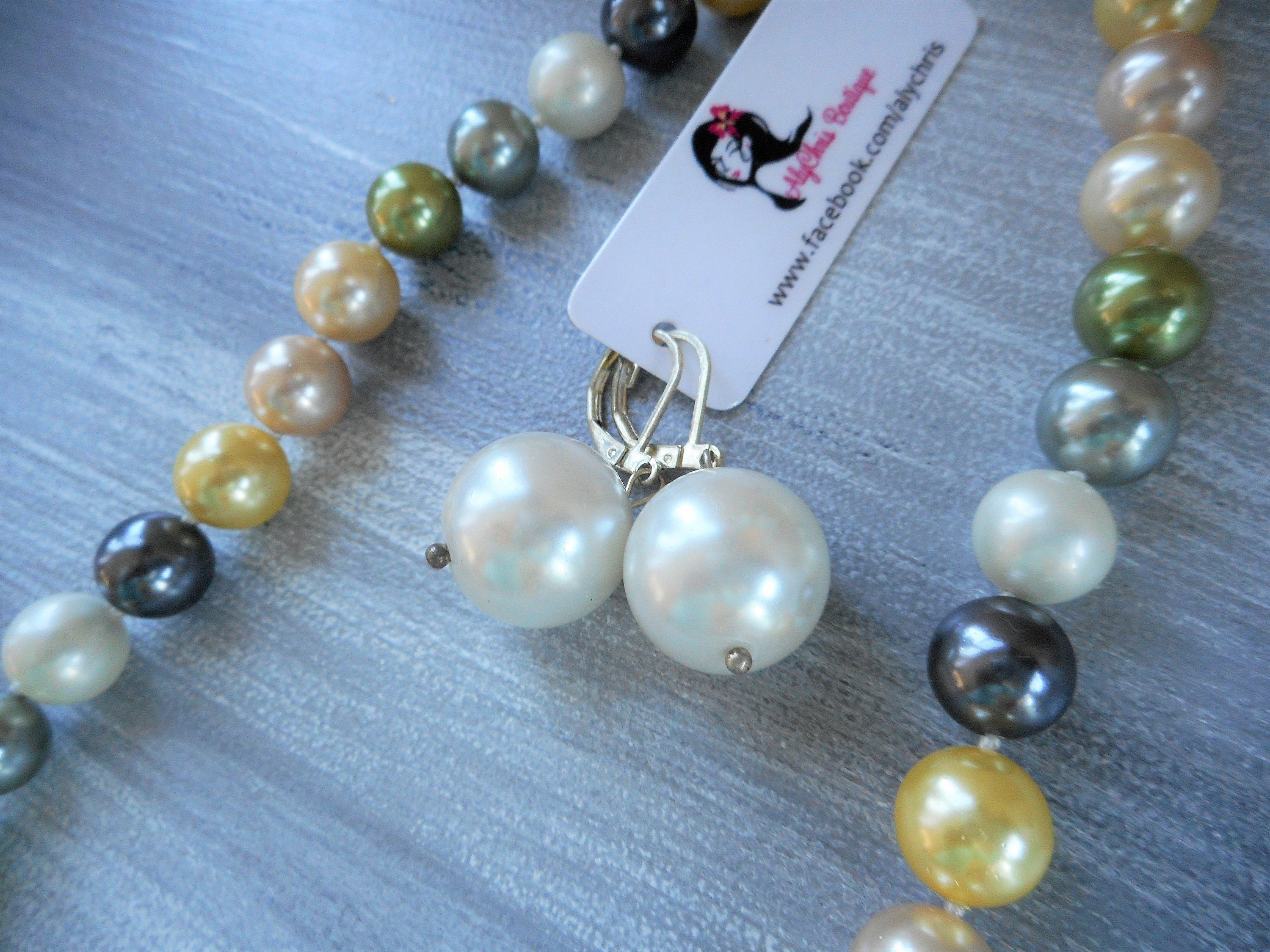 18" 10mm Faux Pearl Necklace Earring Set in Greens, Greys and White Shades