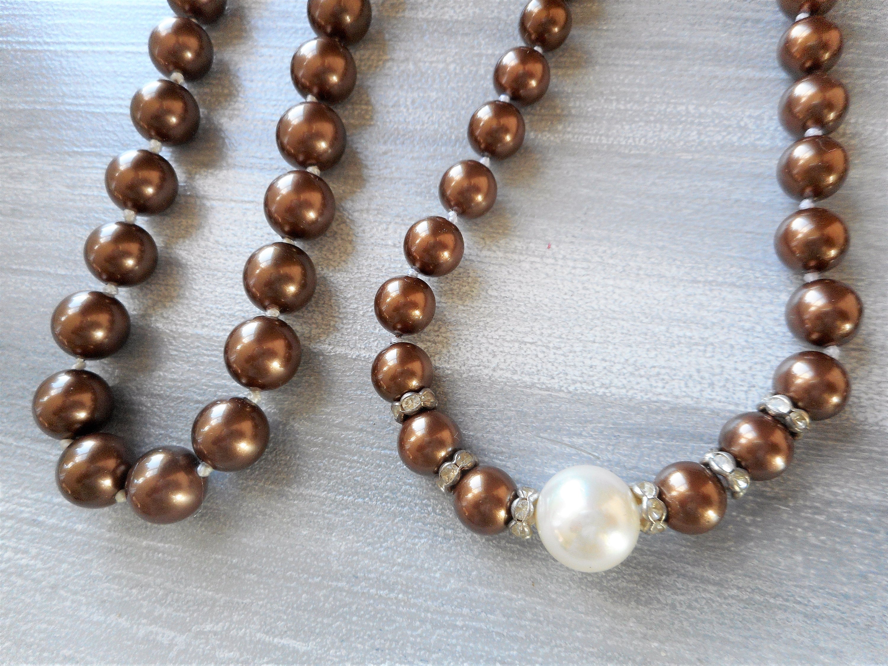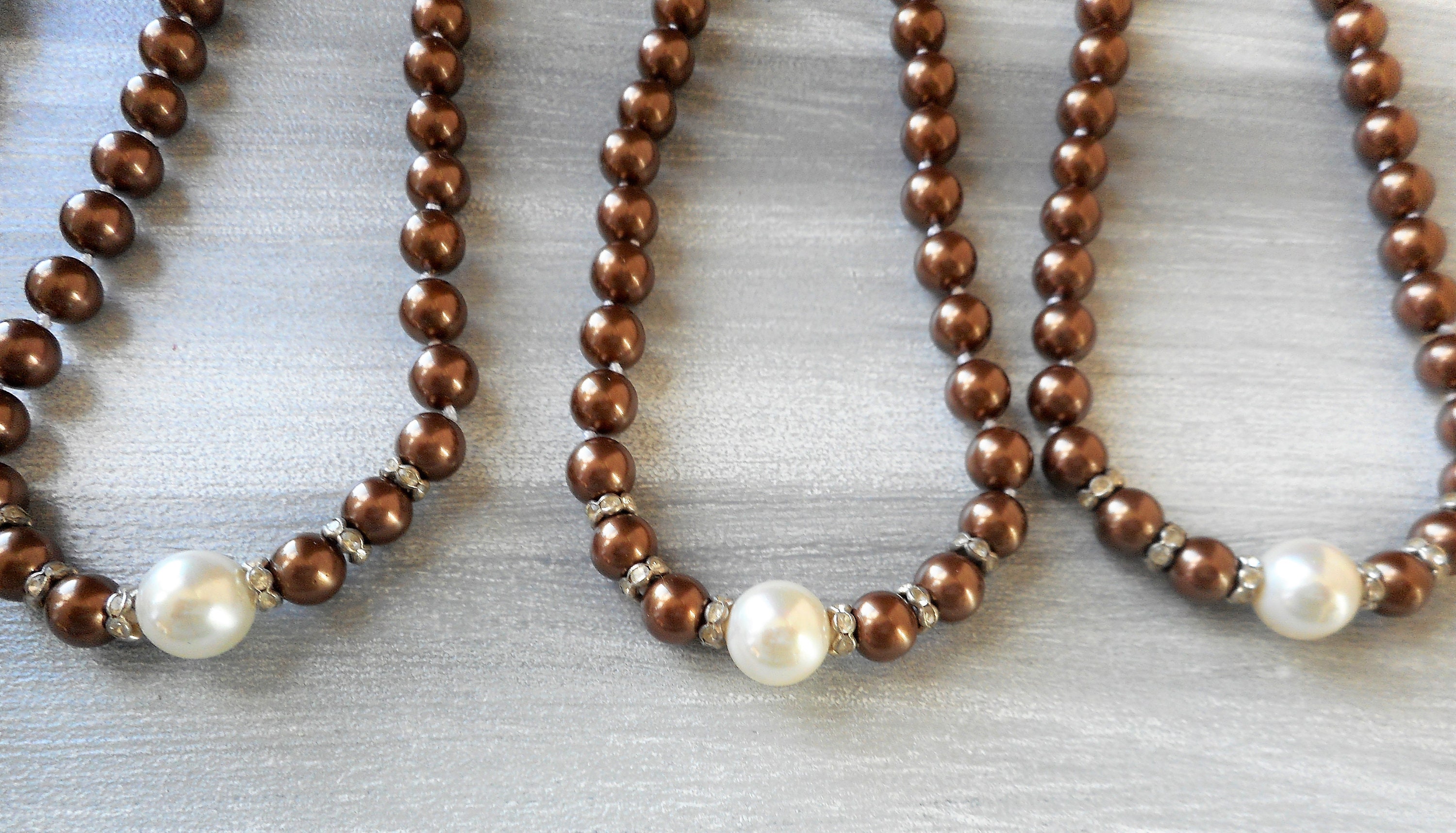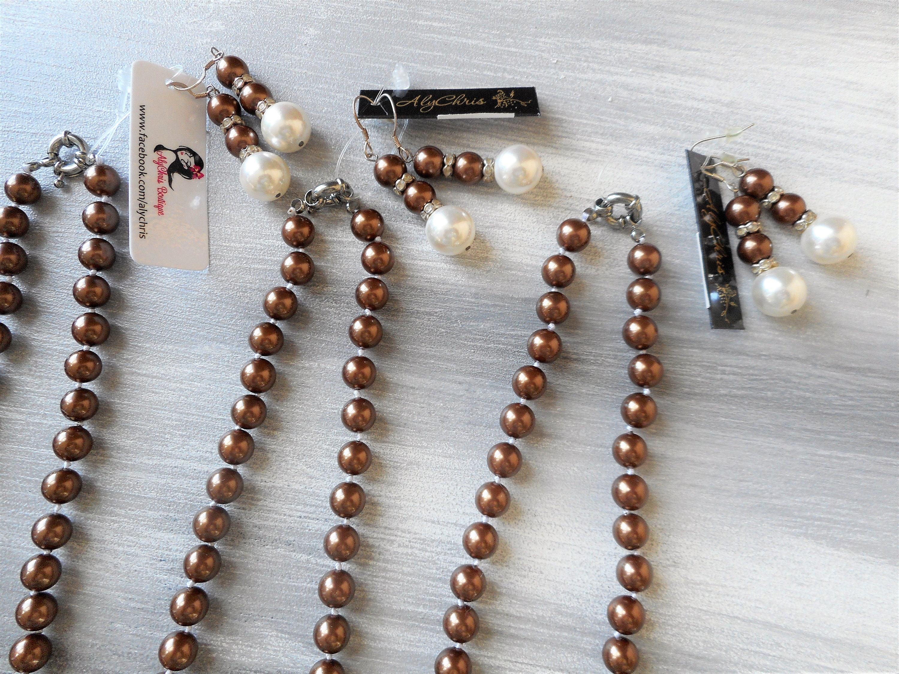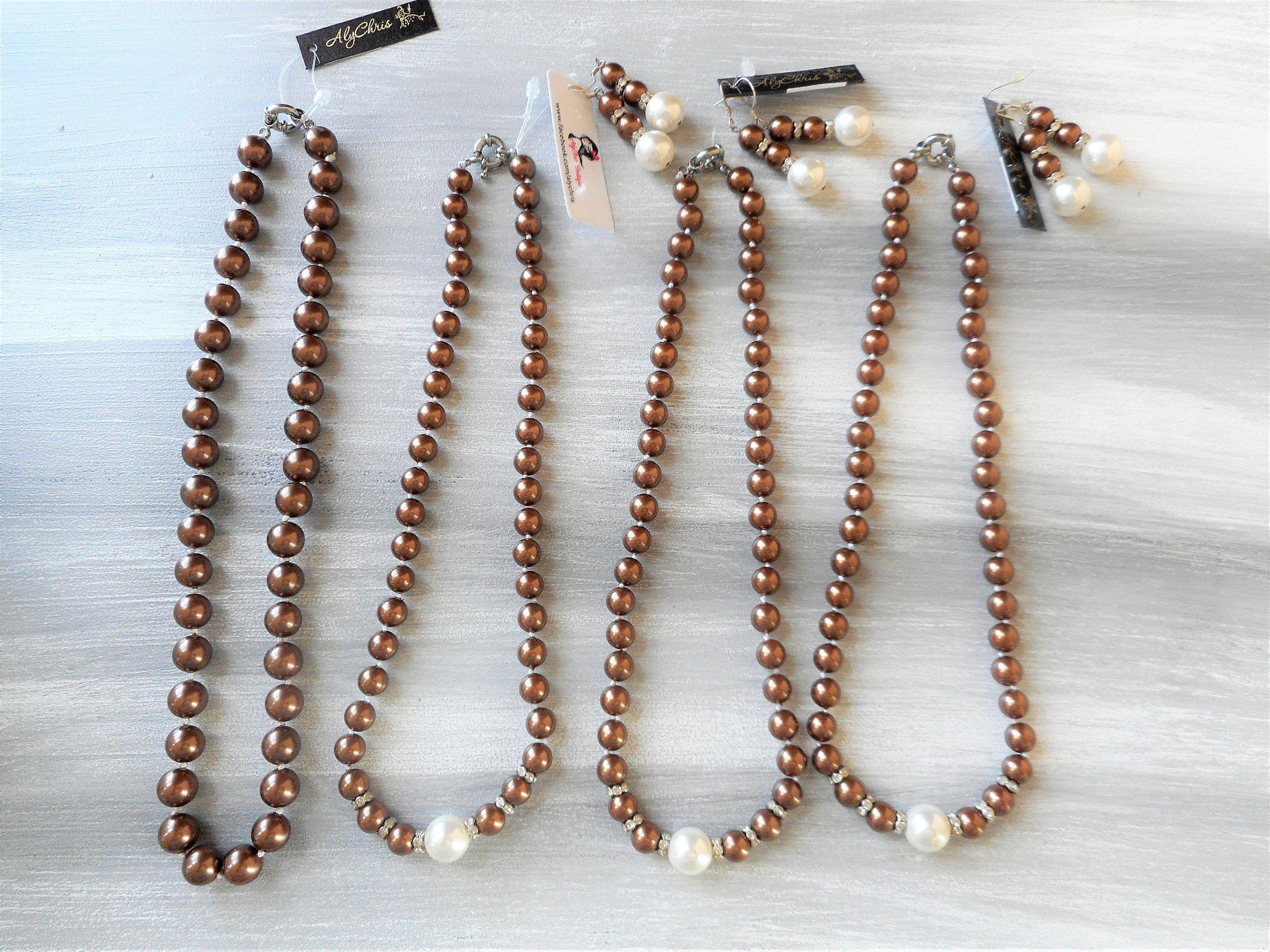 Brown Pearl Bridal Party Necklace Set, Brown & White Faux Pearl Bridal Necklace Earring Set - Jewelry for Bridesmaids, Maid of Honor Jewelry