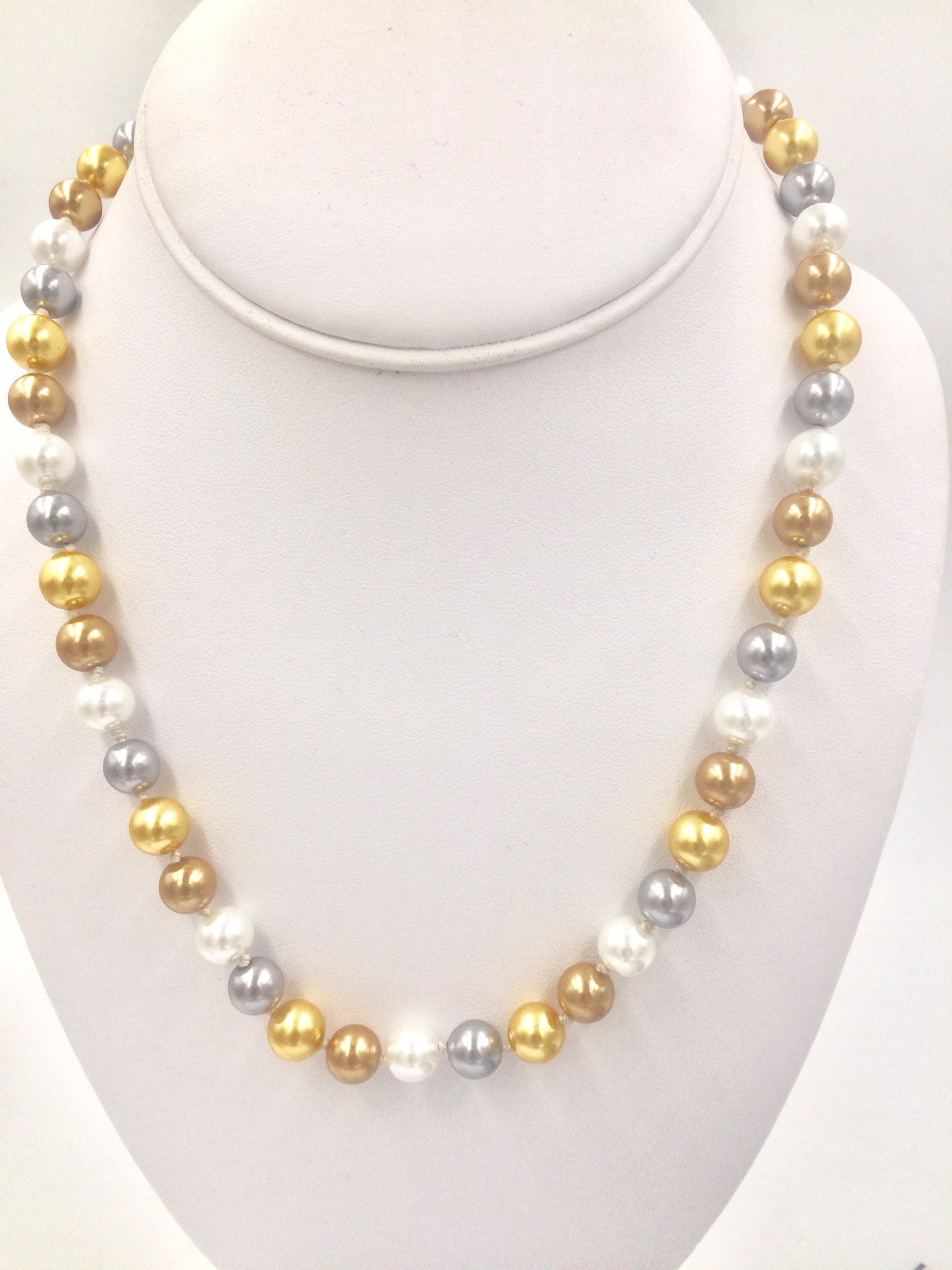 16"L 8mm Gold, Grey, White Beaded Necklace with spring ring closure