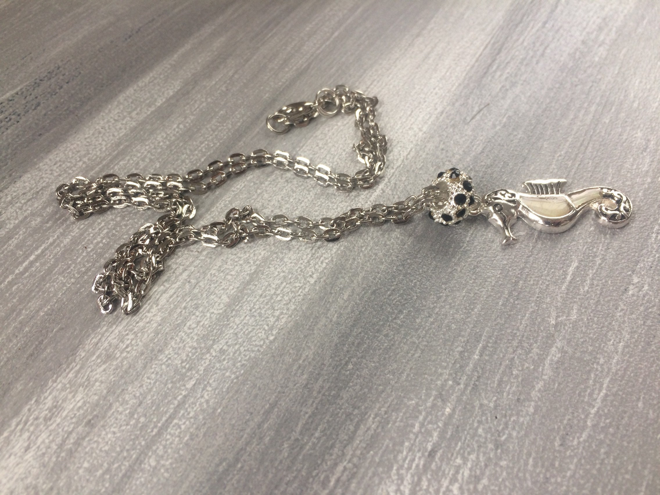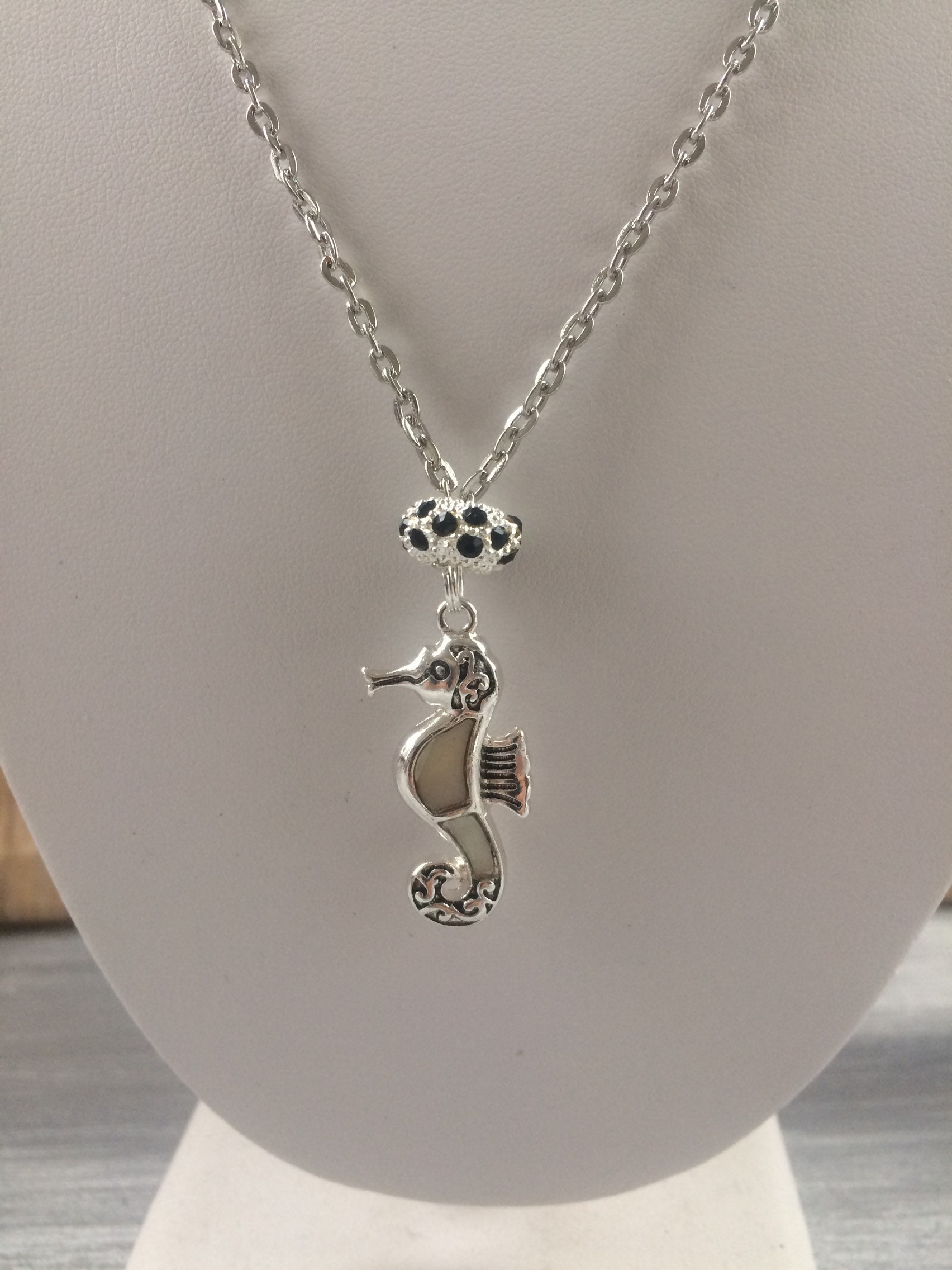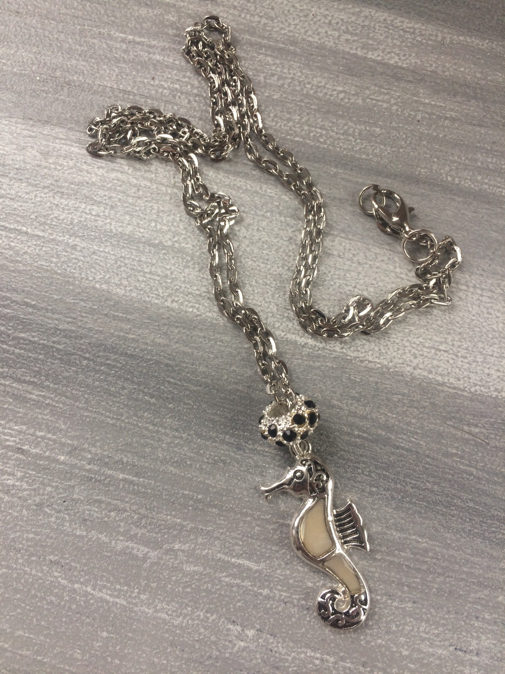 Mother of Pearl Seahorse Charm & Rhinestone Bead on a Silvertone 24”L Chain Necklace with lobster clasp closure