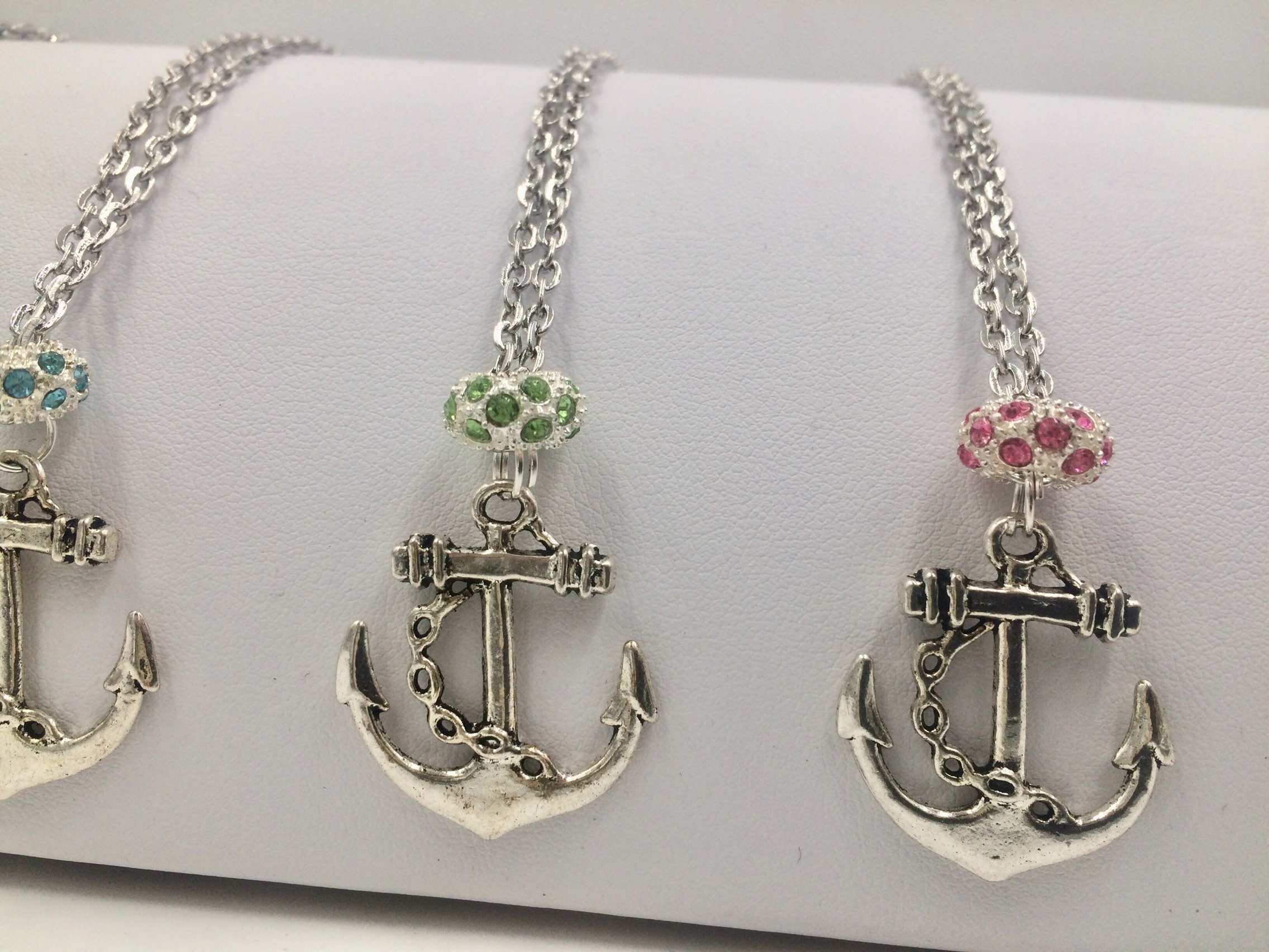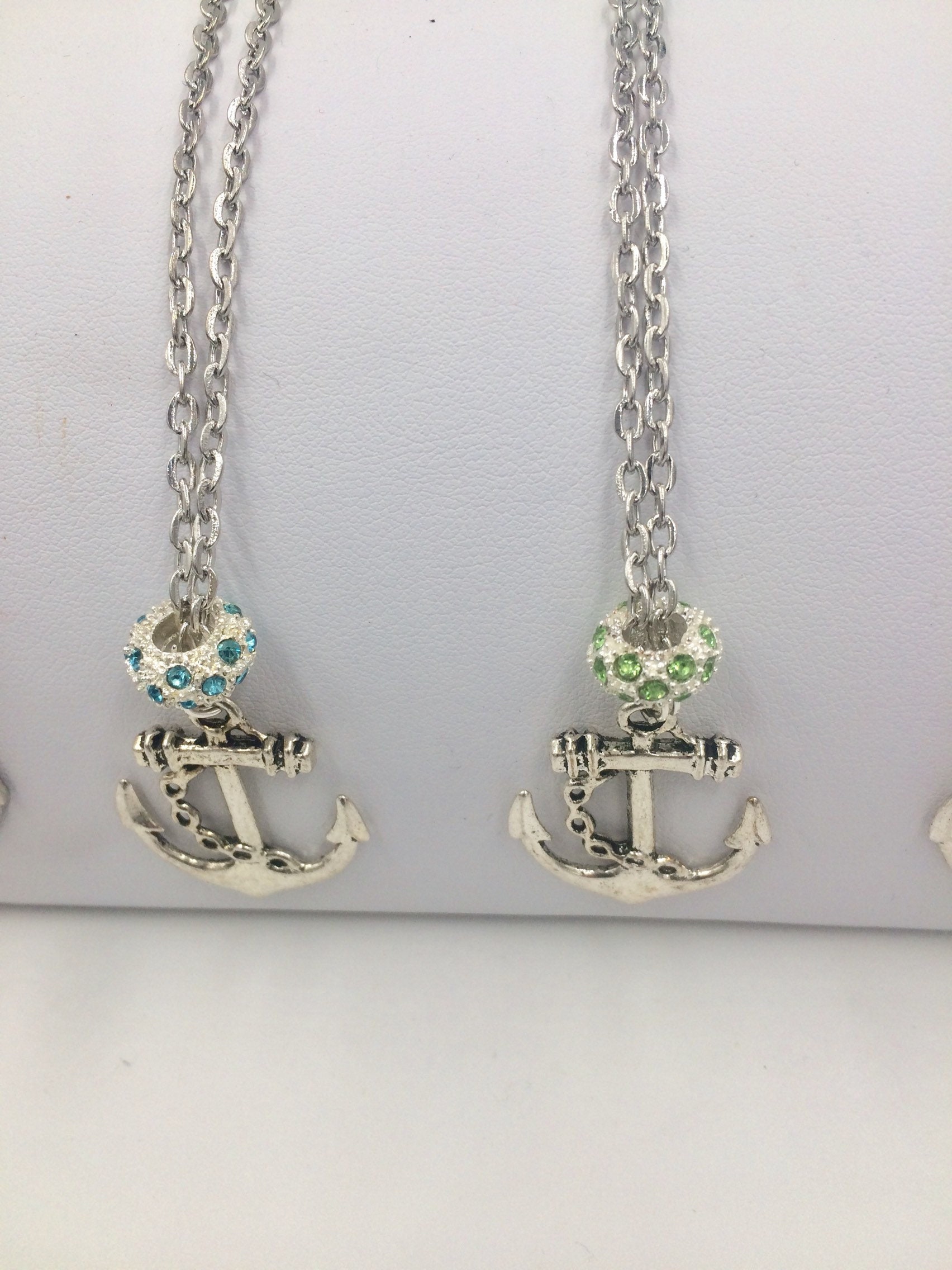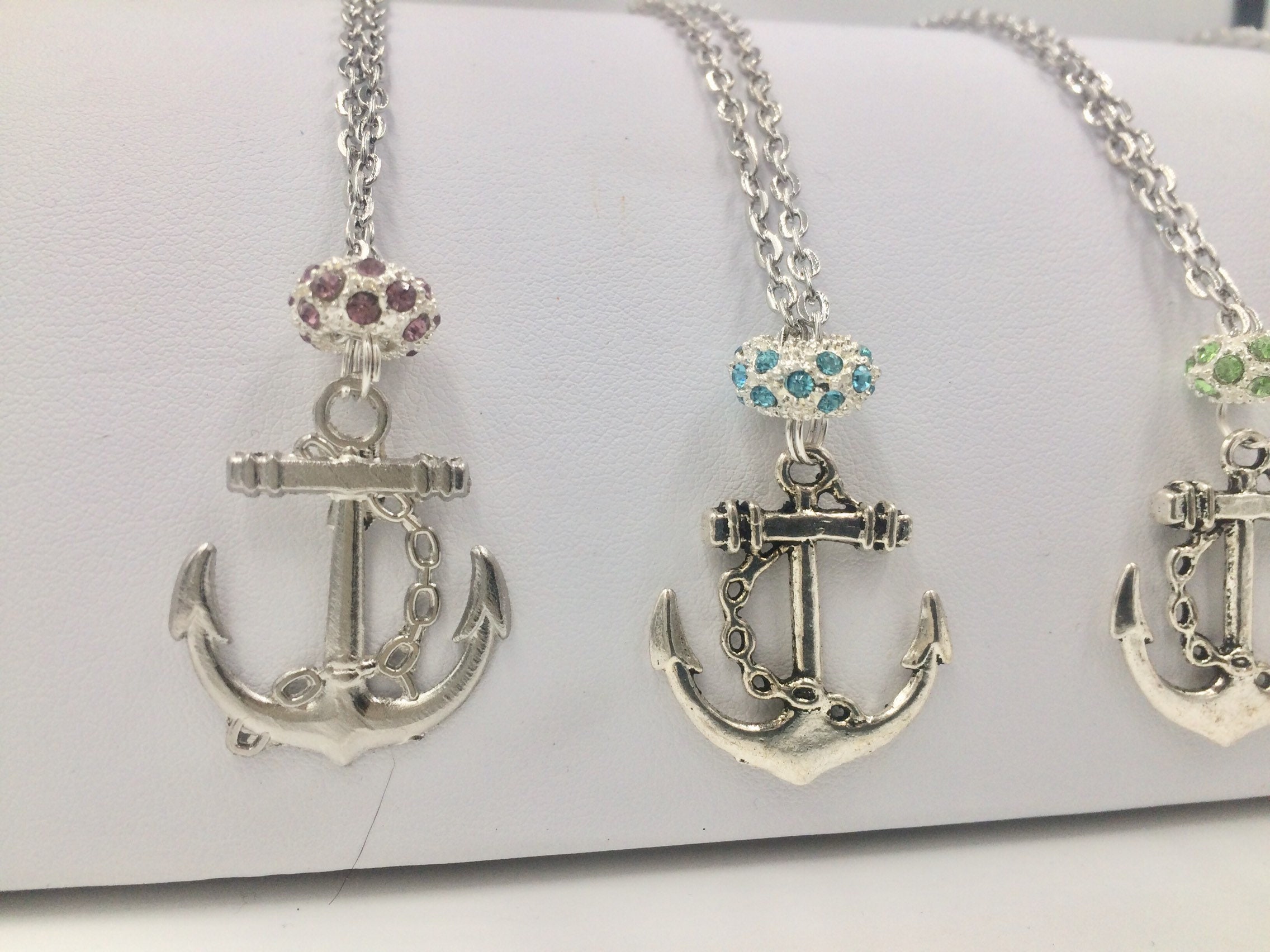 Anchor Charm & Rhinestone Bead on a Silvertone 24”L Chain Necklace with lobster clasp closure