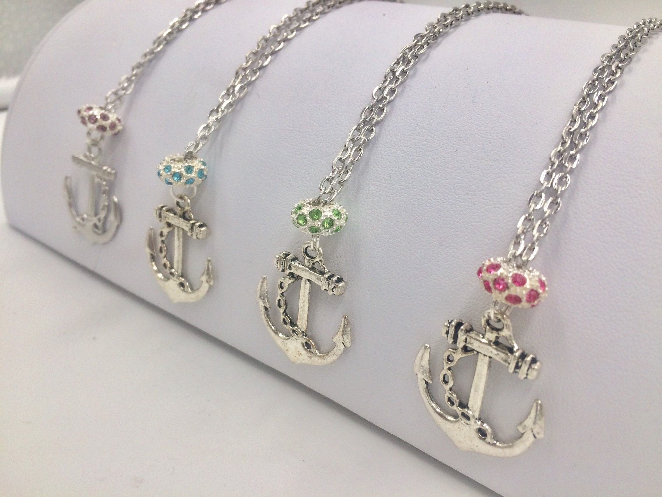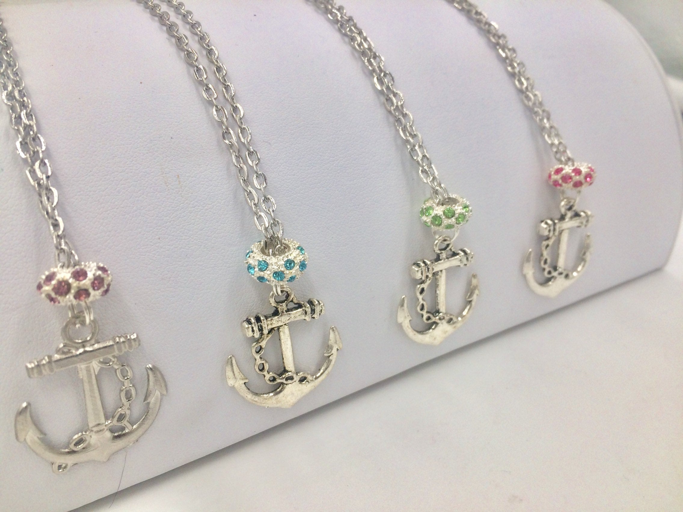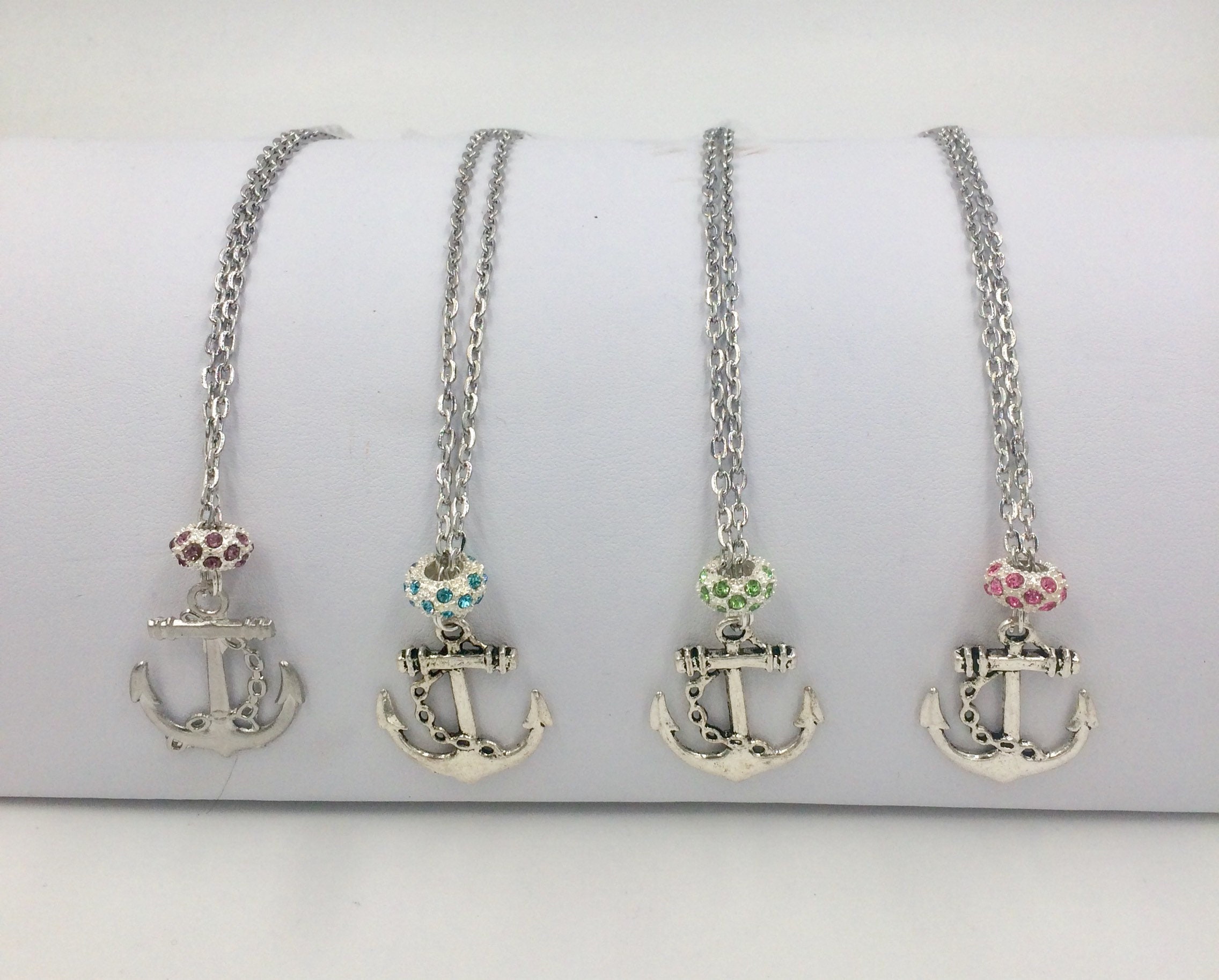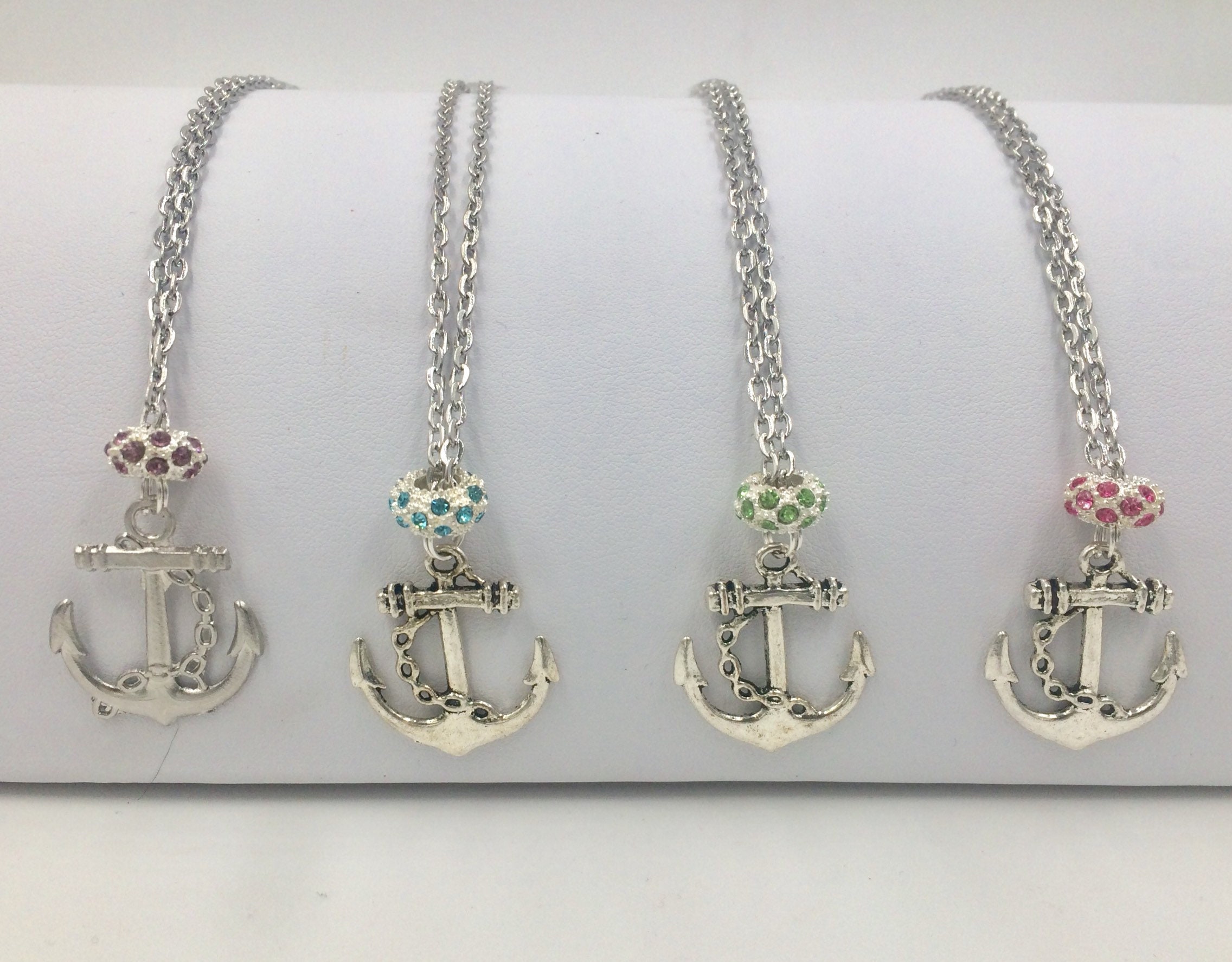 Anchor Charm & Rhinestone Bead on a Silvertone 24”L Chain Necklace with lobster clasp closure