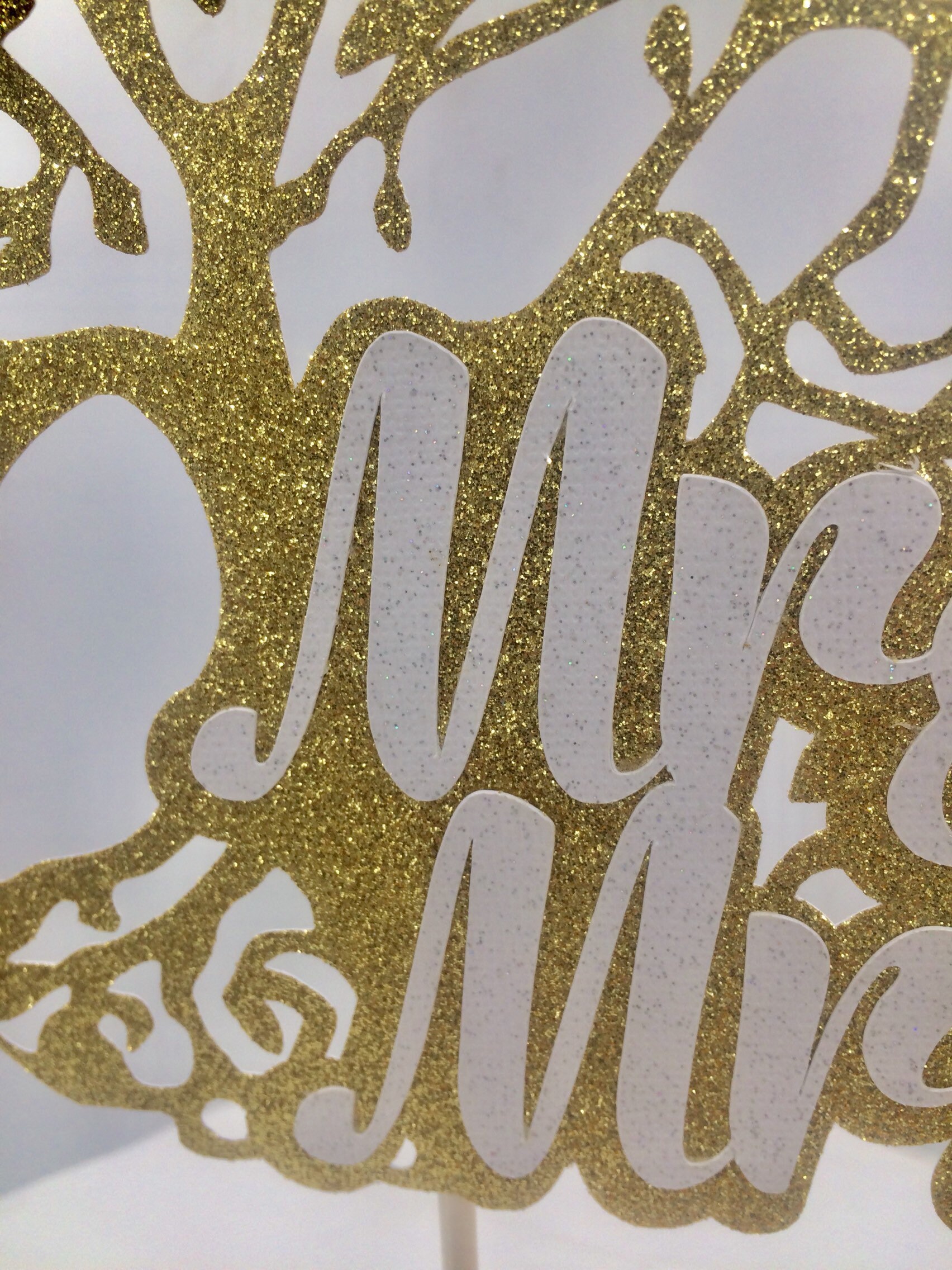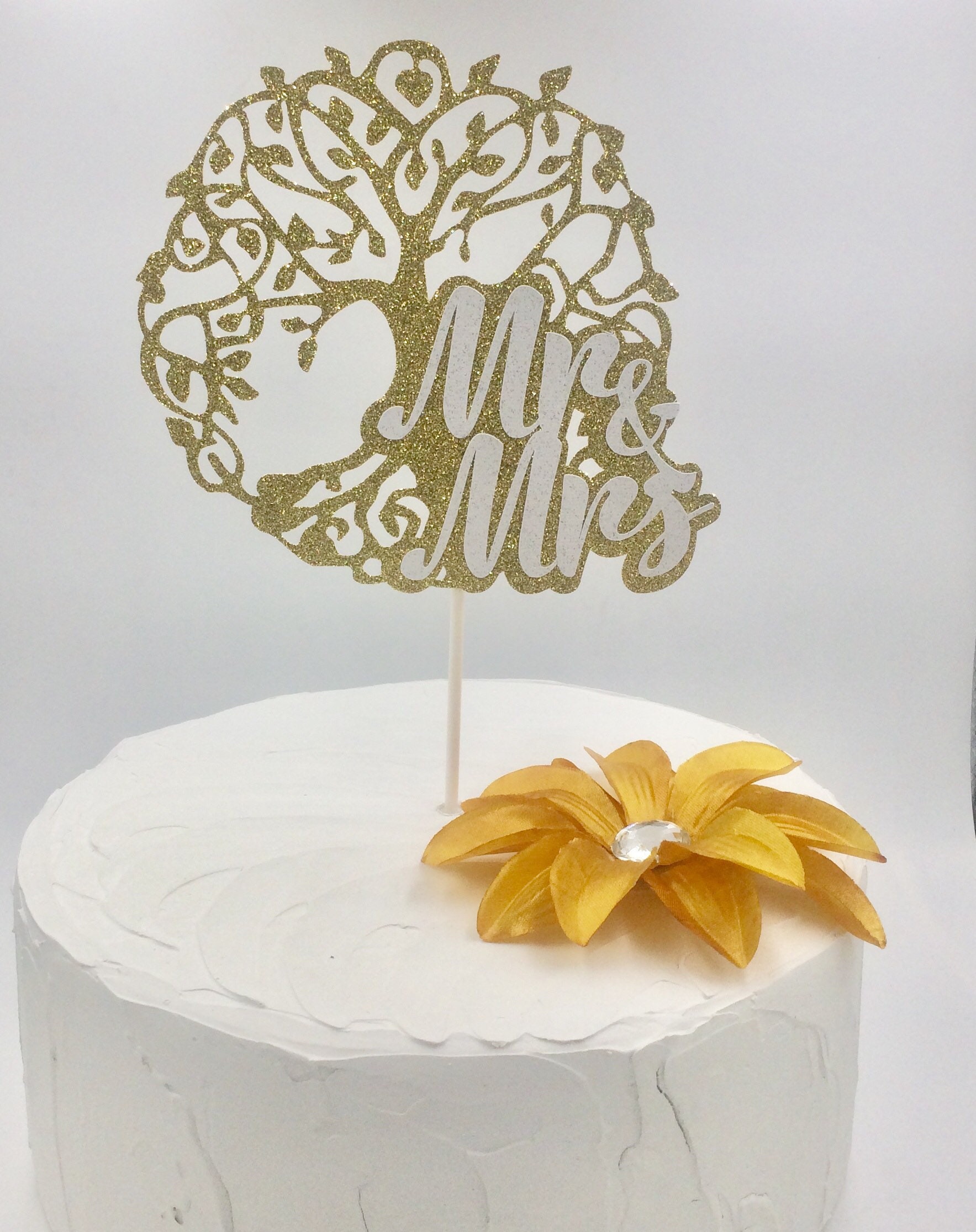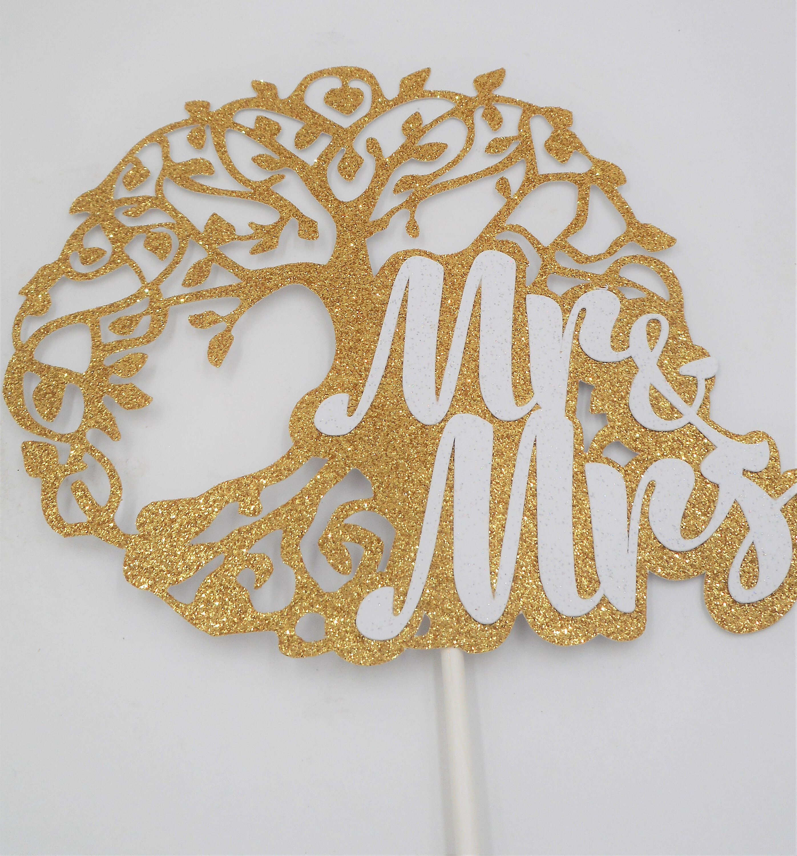 Gold Glitter Tree of Life Mr & Mrs Cake Topper (one sided)
