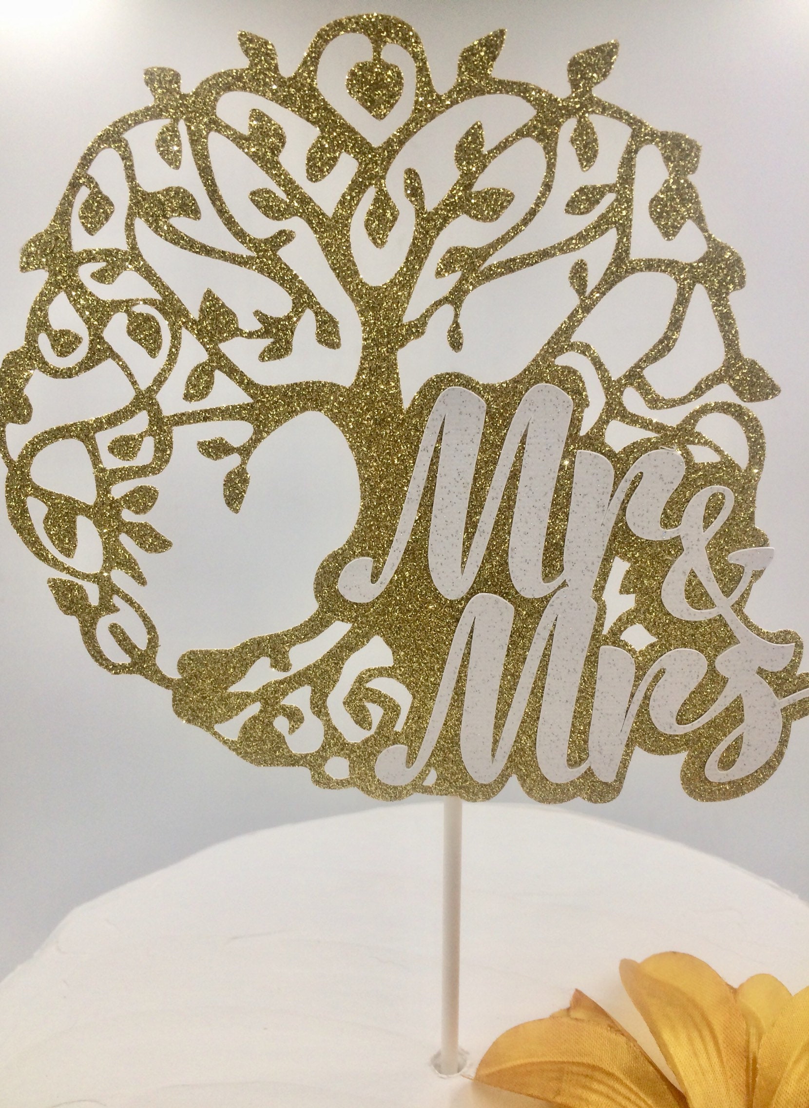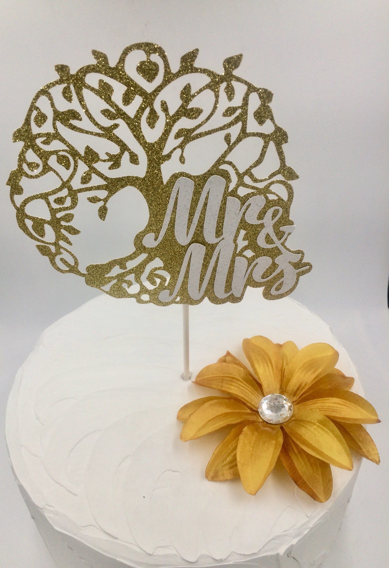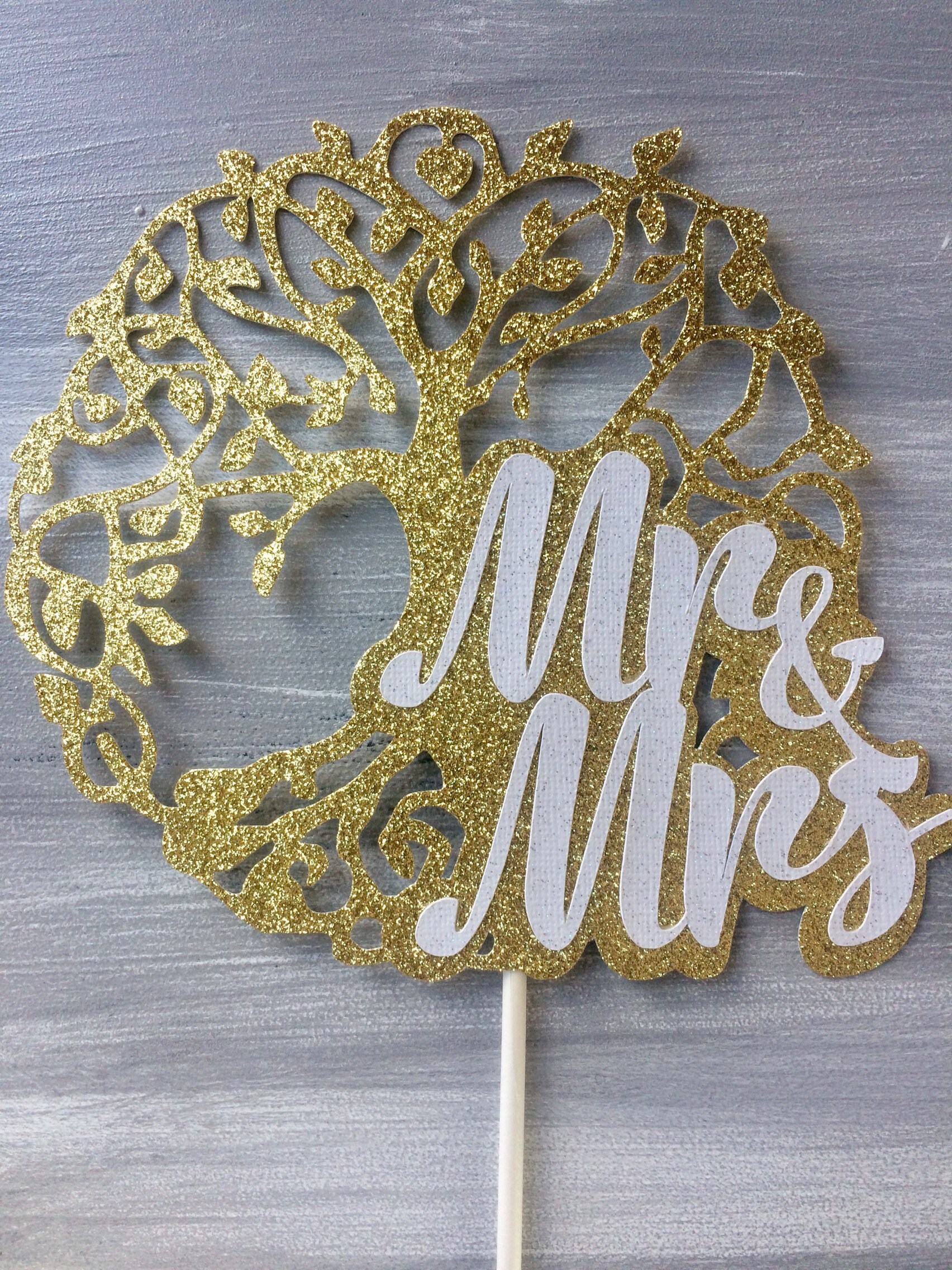 Tree of Life Cake Topper, Mr & Mrs Gold Glitter Cake Topper, Tree Theme, Wedding Cake Topper, Mr and Mrs Cake Topper, Gold Cake Decor