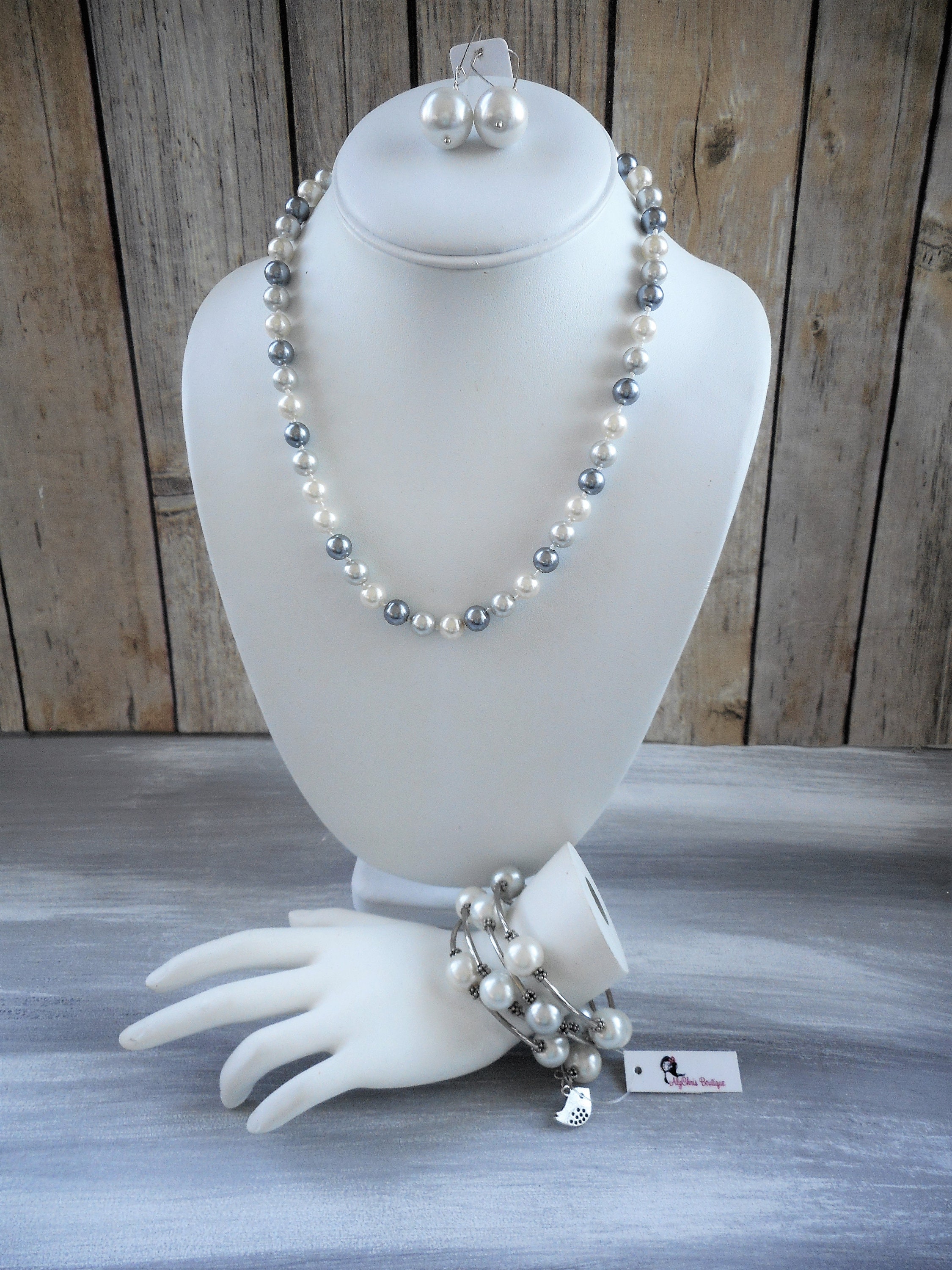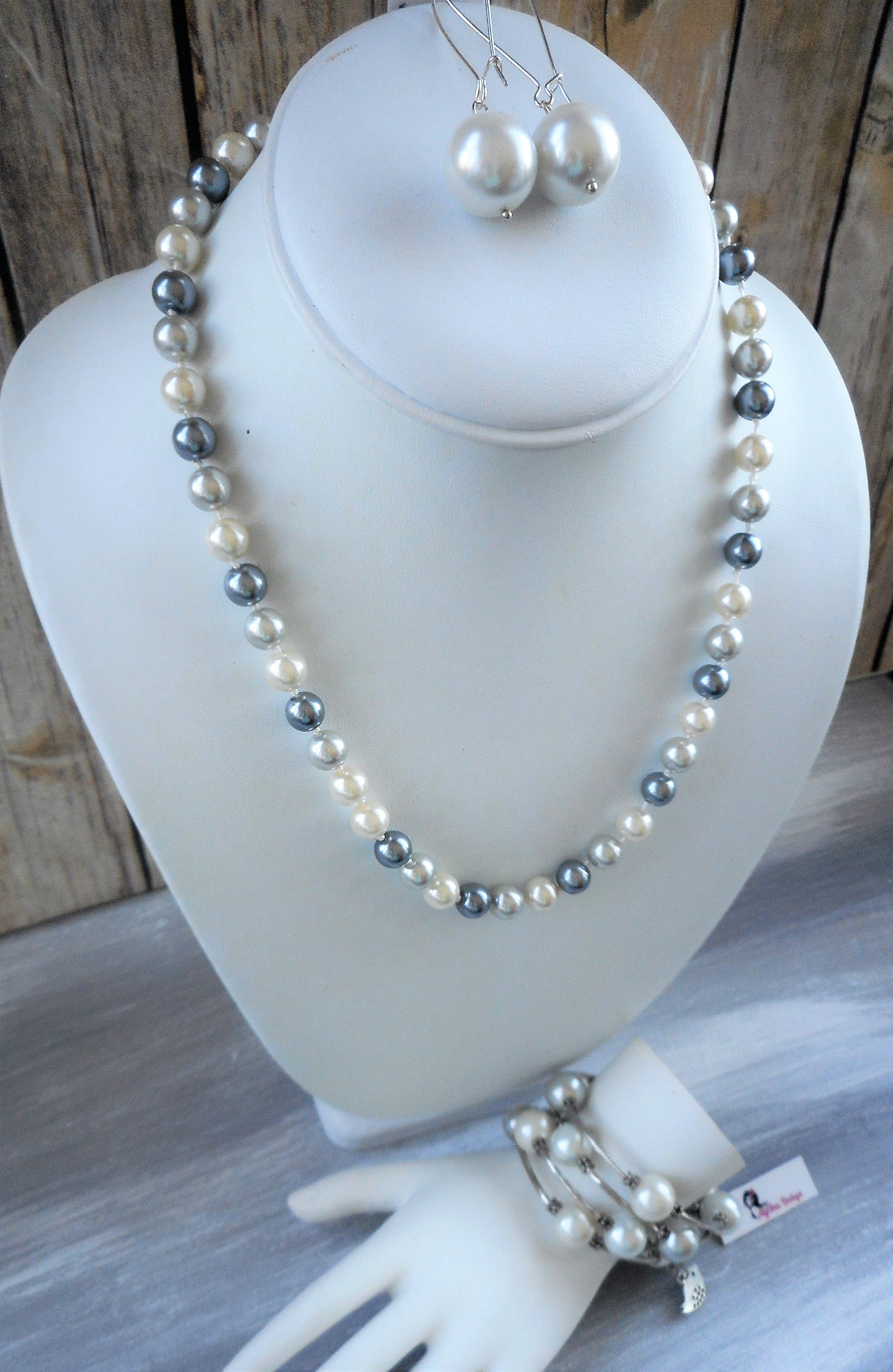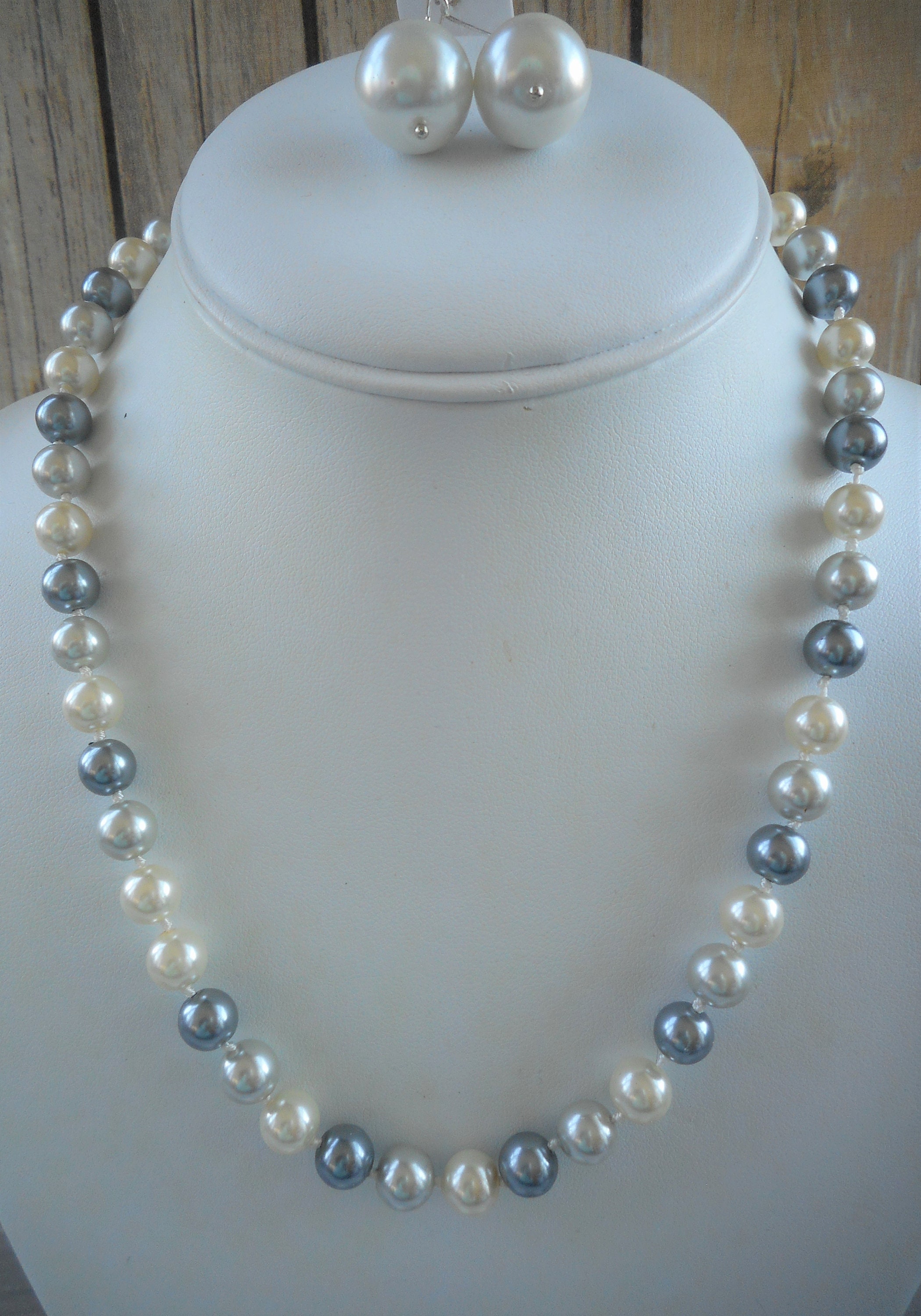 Faux Pearl Necklace Set, Grey and White Pearl Necklace, Bridal Jewelry, Prom Jewelry Set, Pearl Beaded Necklace, Glass Pearl Jewelry