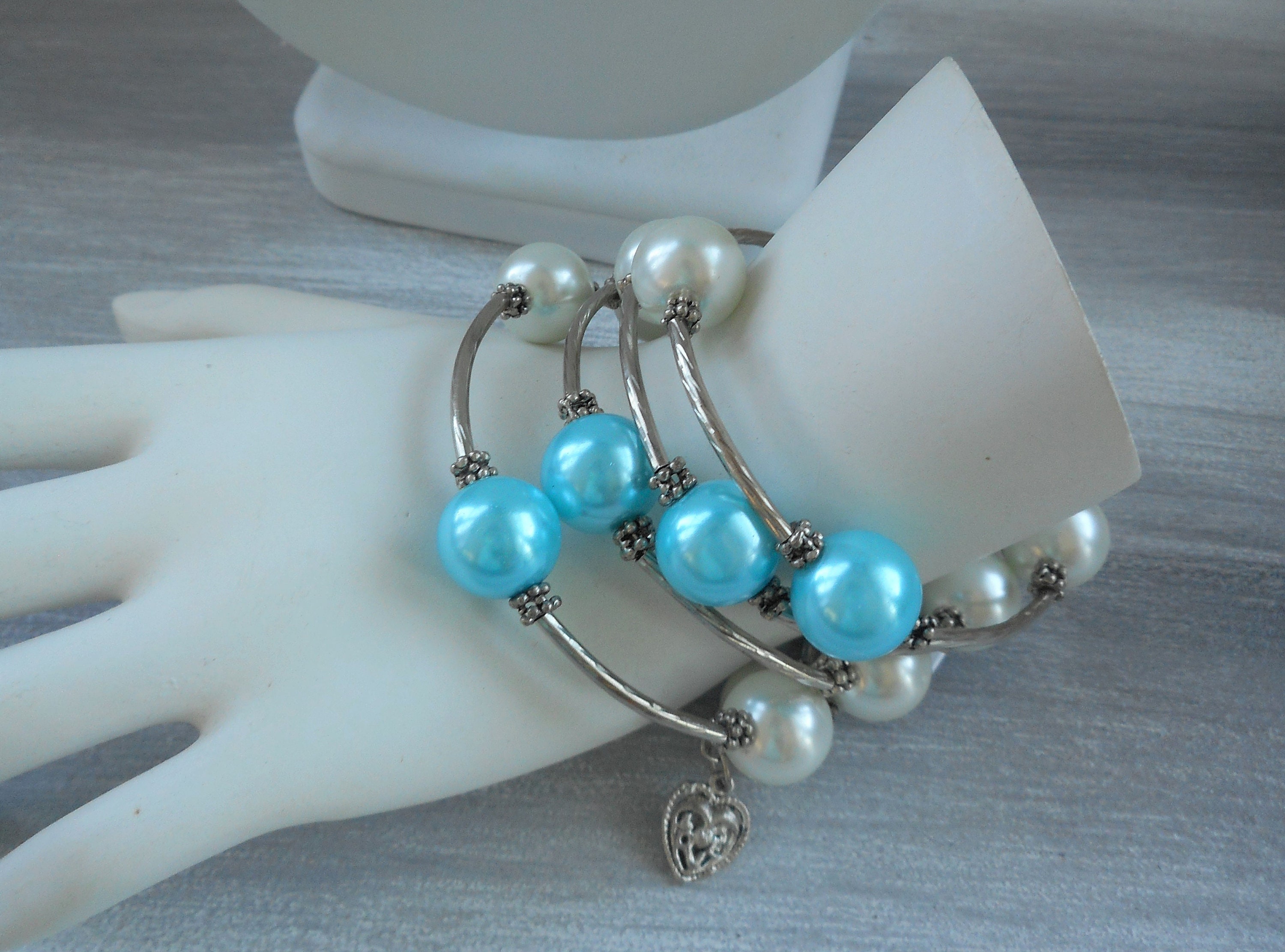 Wire Wrap Bracelet: 12mm beads in white & robin egg blue