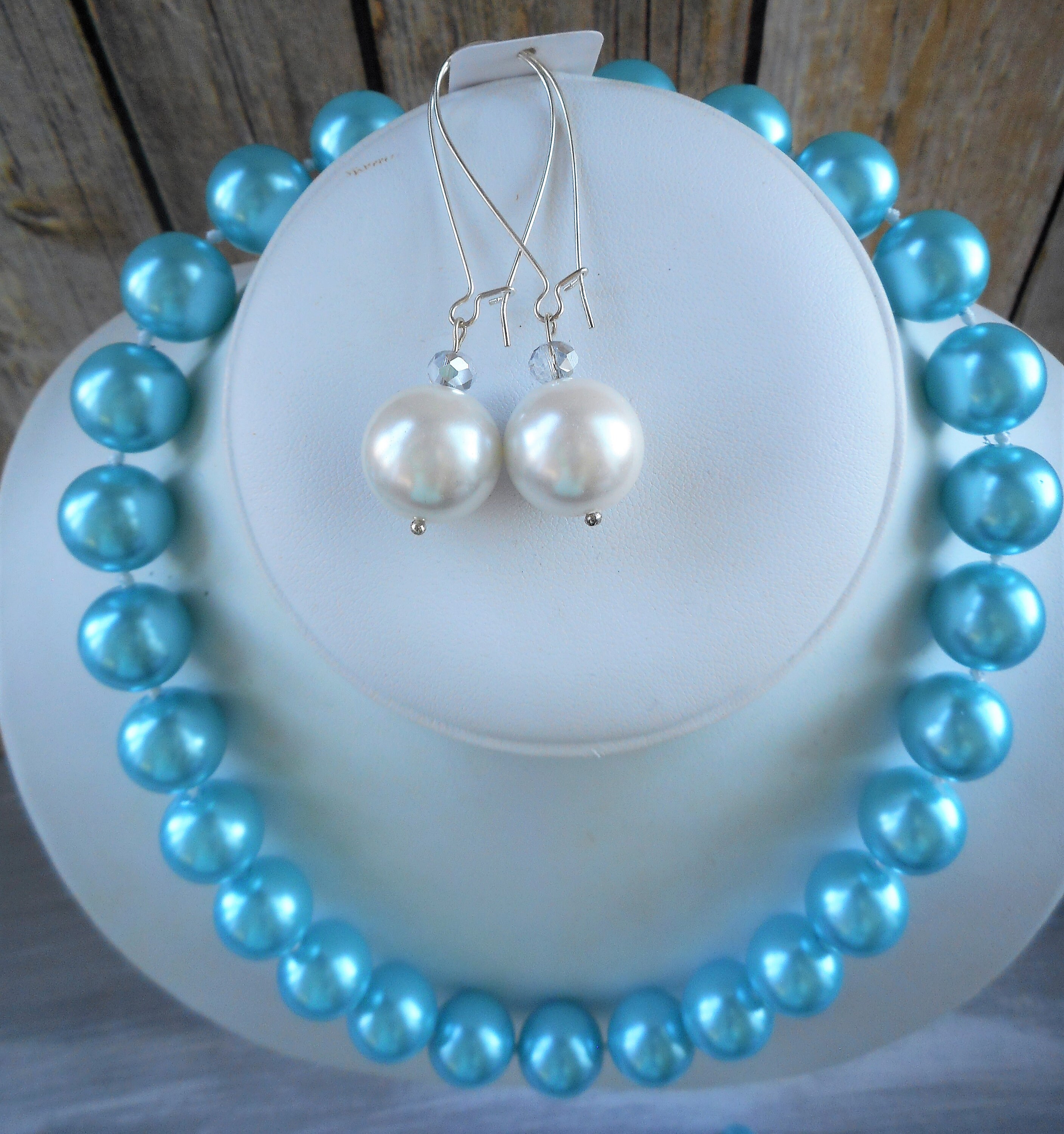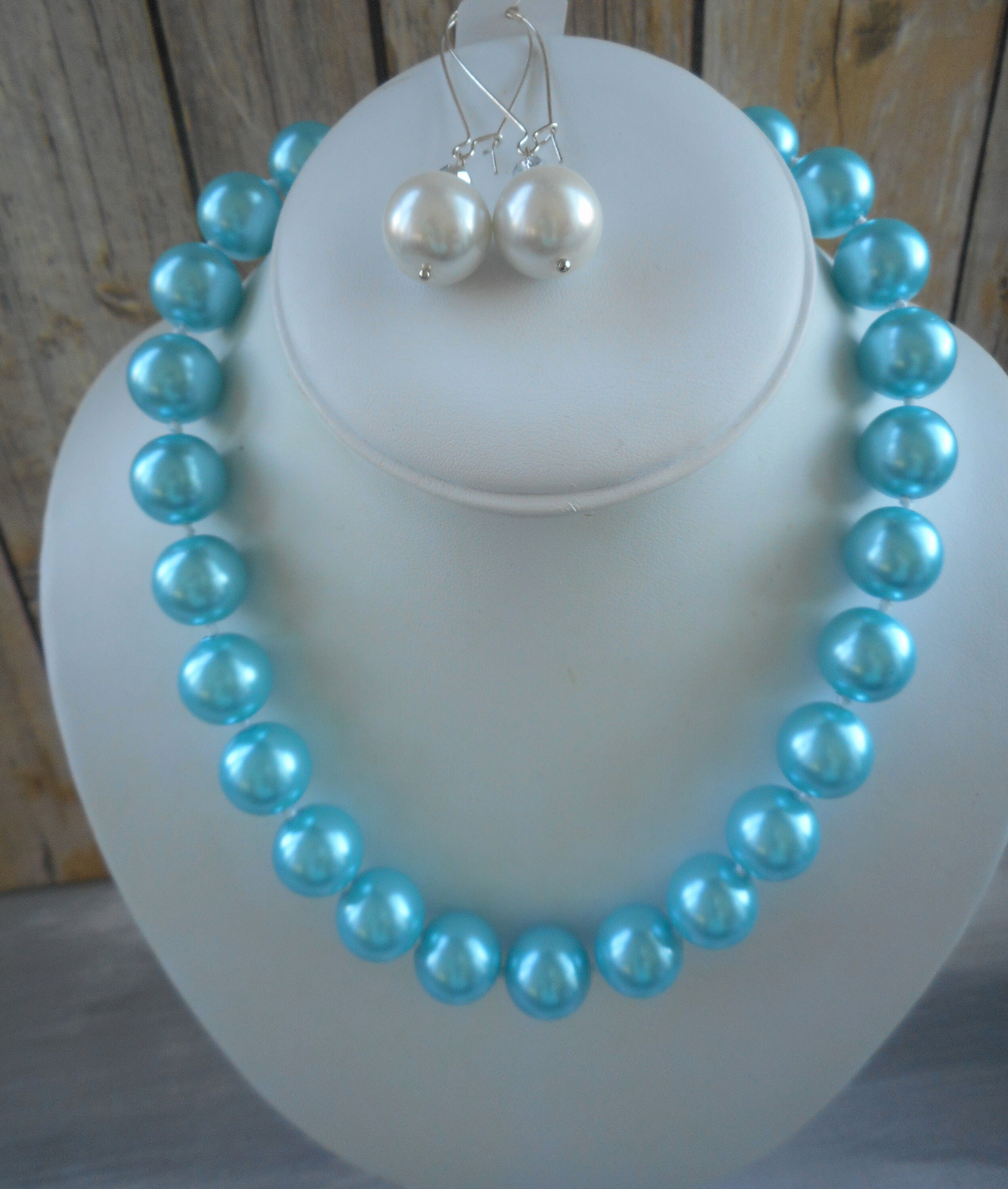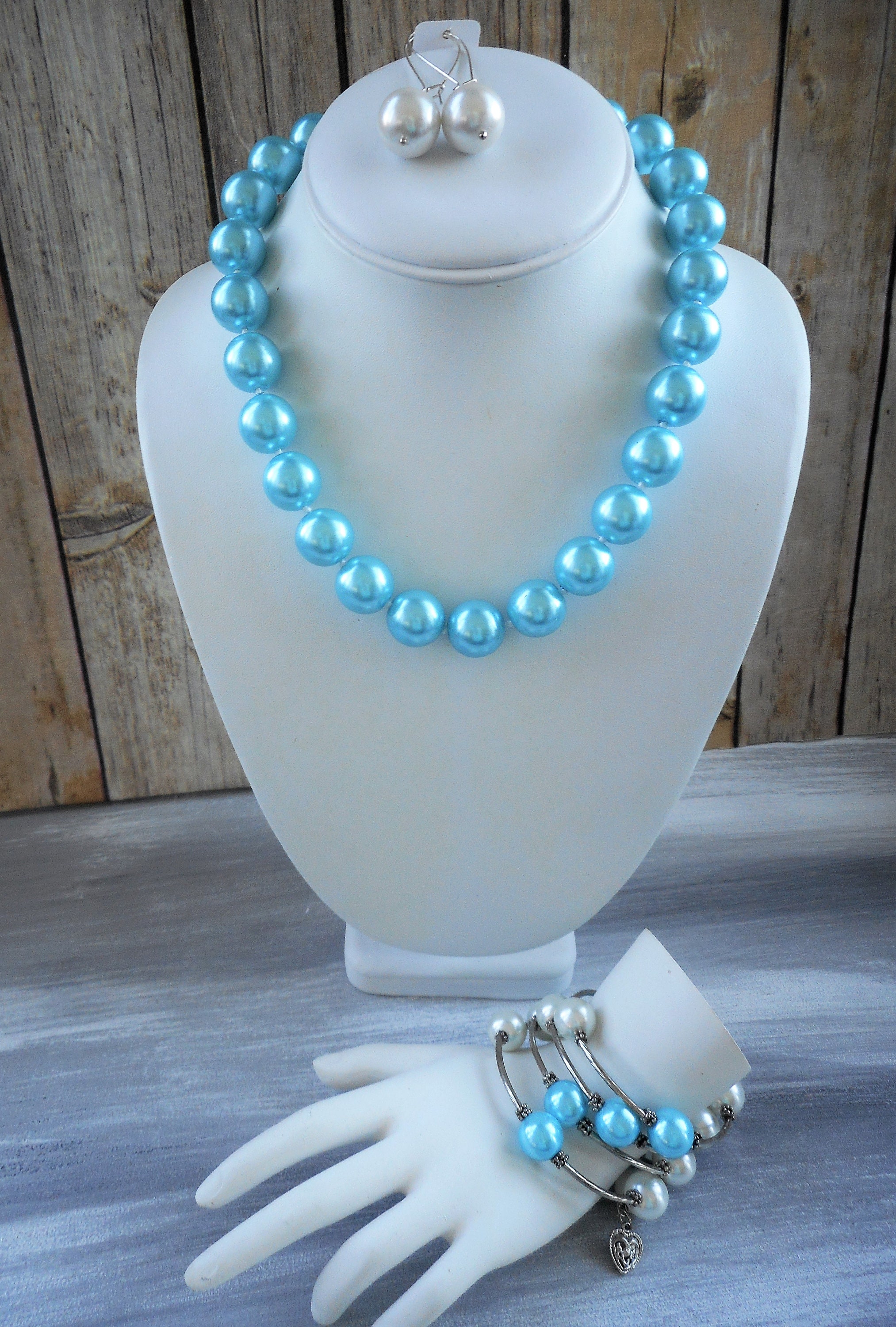 Faux Pearl Necklace Set, Metallic Robin Egg Blue Pearl Necklace, Bridal Jewelry, Prom Jewelry Set, Pearl Beaded Necklace, Pearl Jewelry