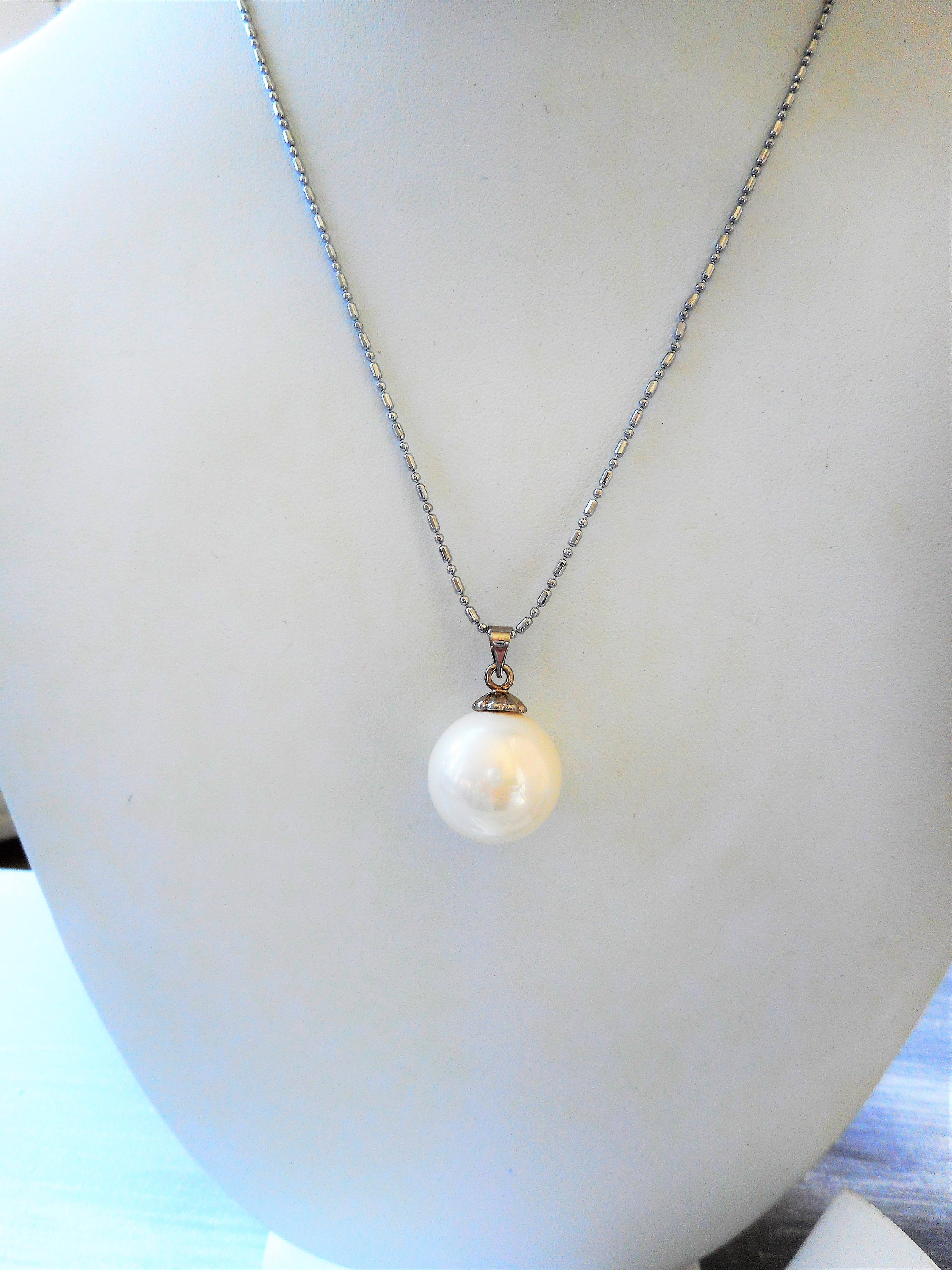 Necklace: 16" Silvertone chain necklace with 16mm white faux pearl bead with spring ring closure
