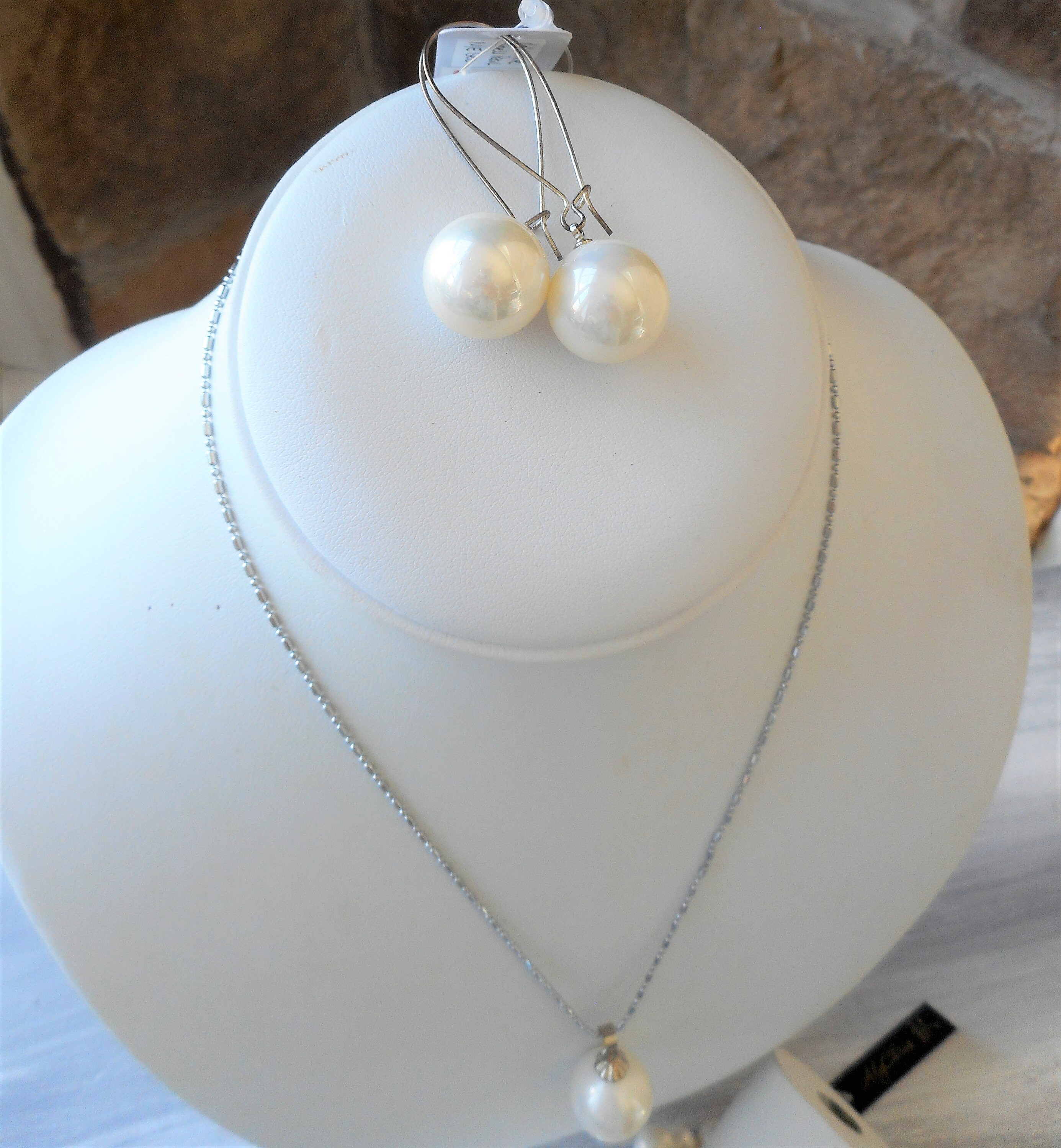 Earrings: 16mm white pearl beads on kidney earwire, 2"L drop