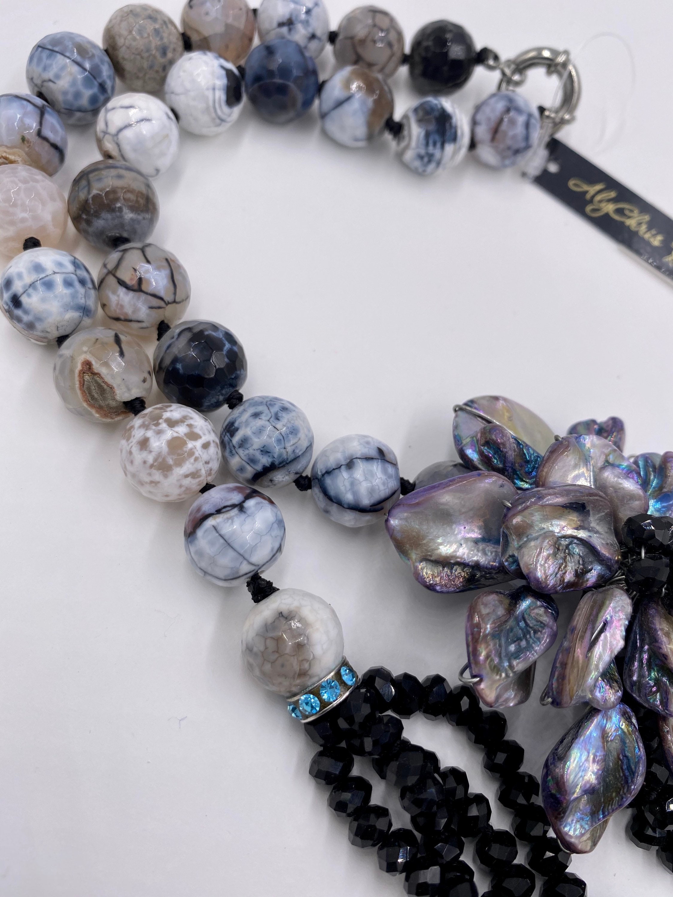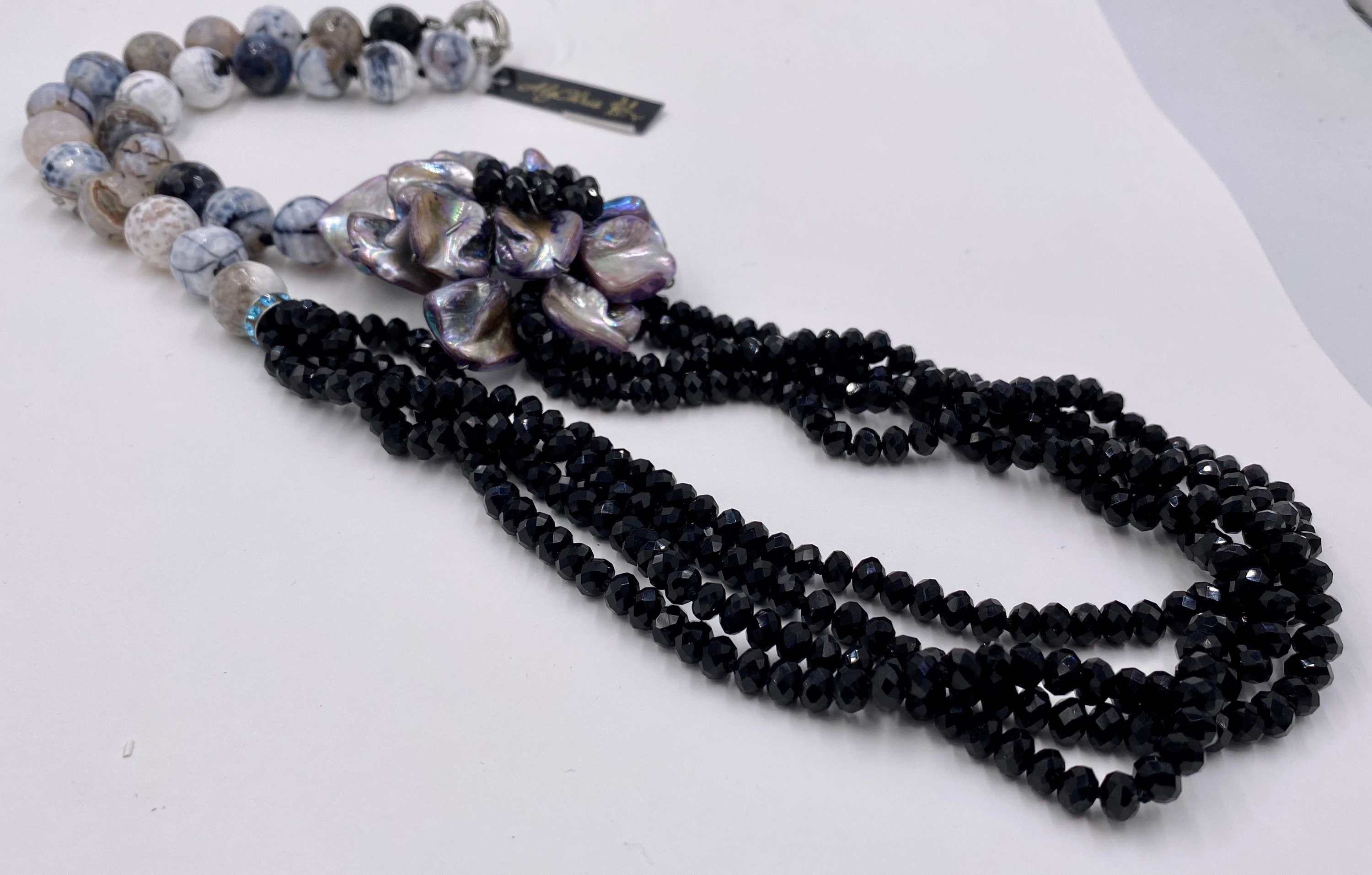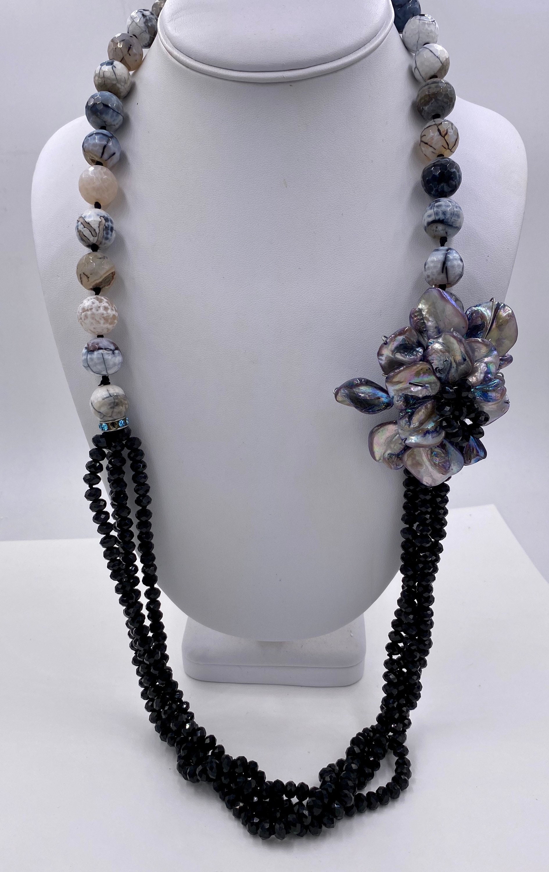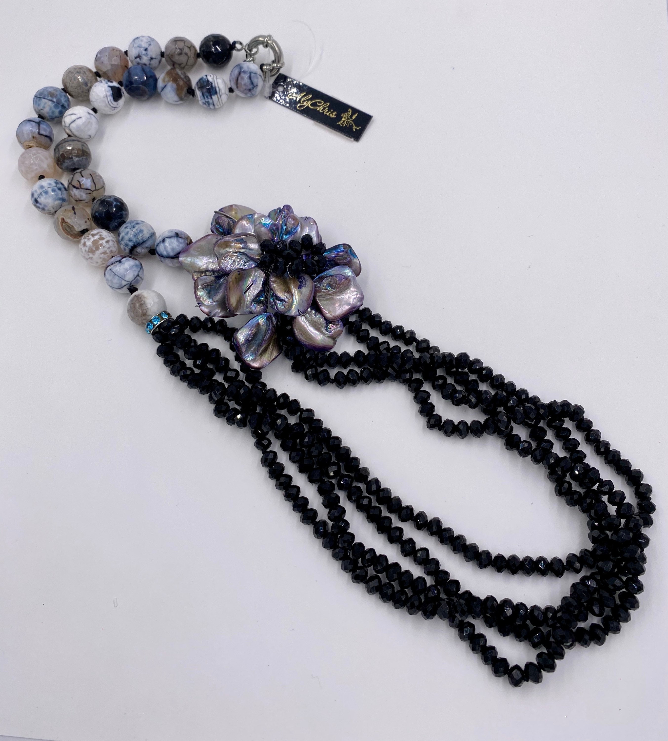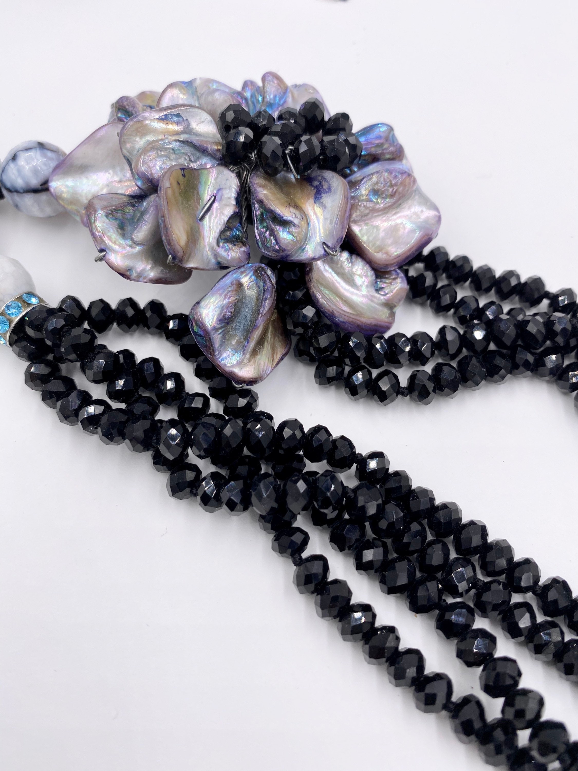 Faceted Agate Beaded Long Necklace with Black faceted crystal beads & Mother of Pearl Floral Accent