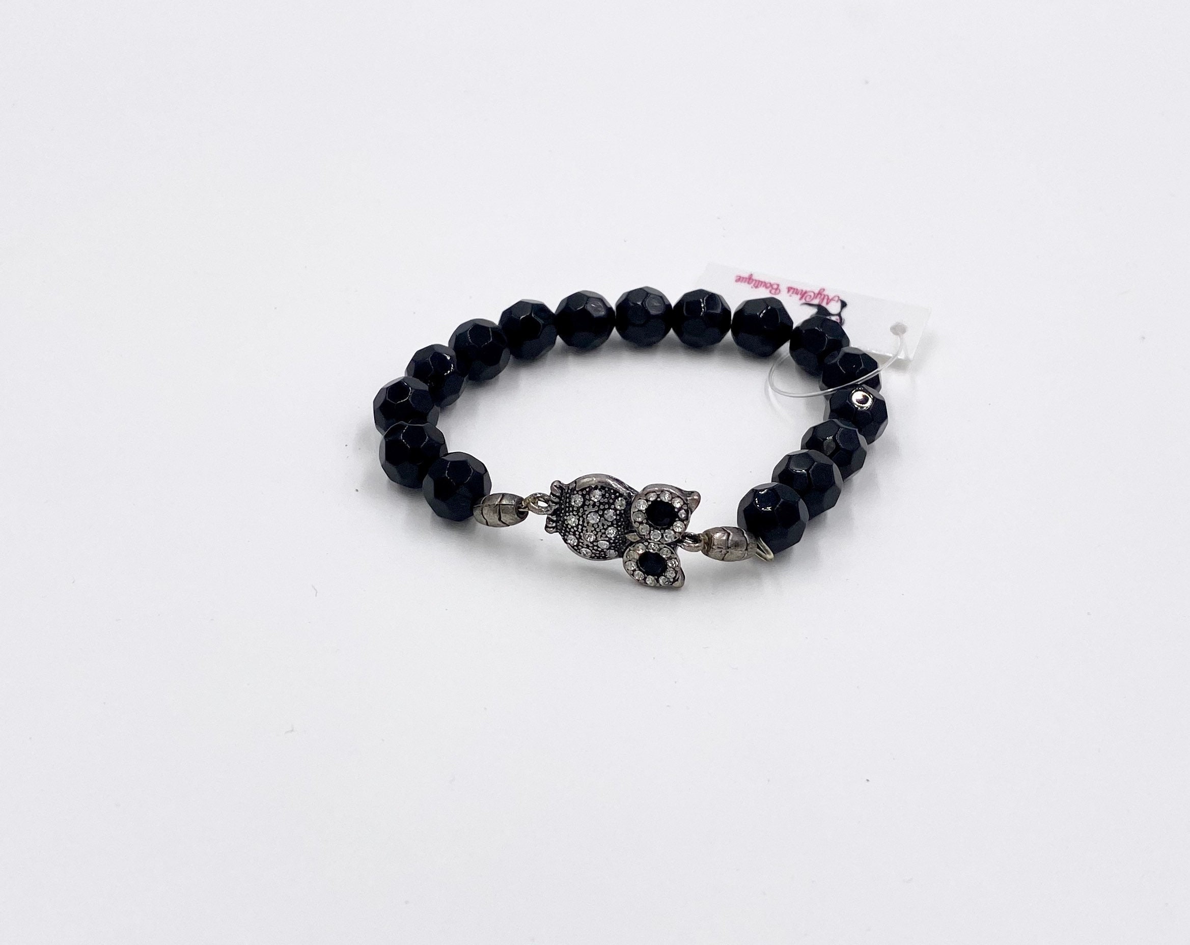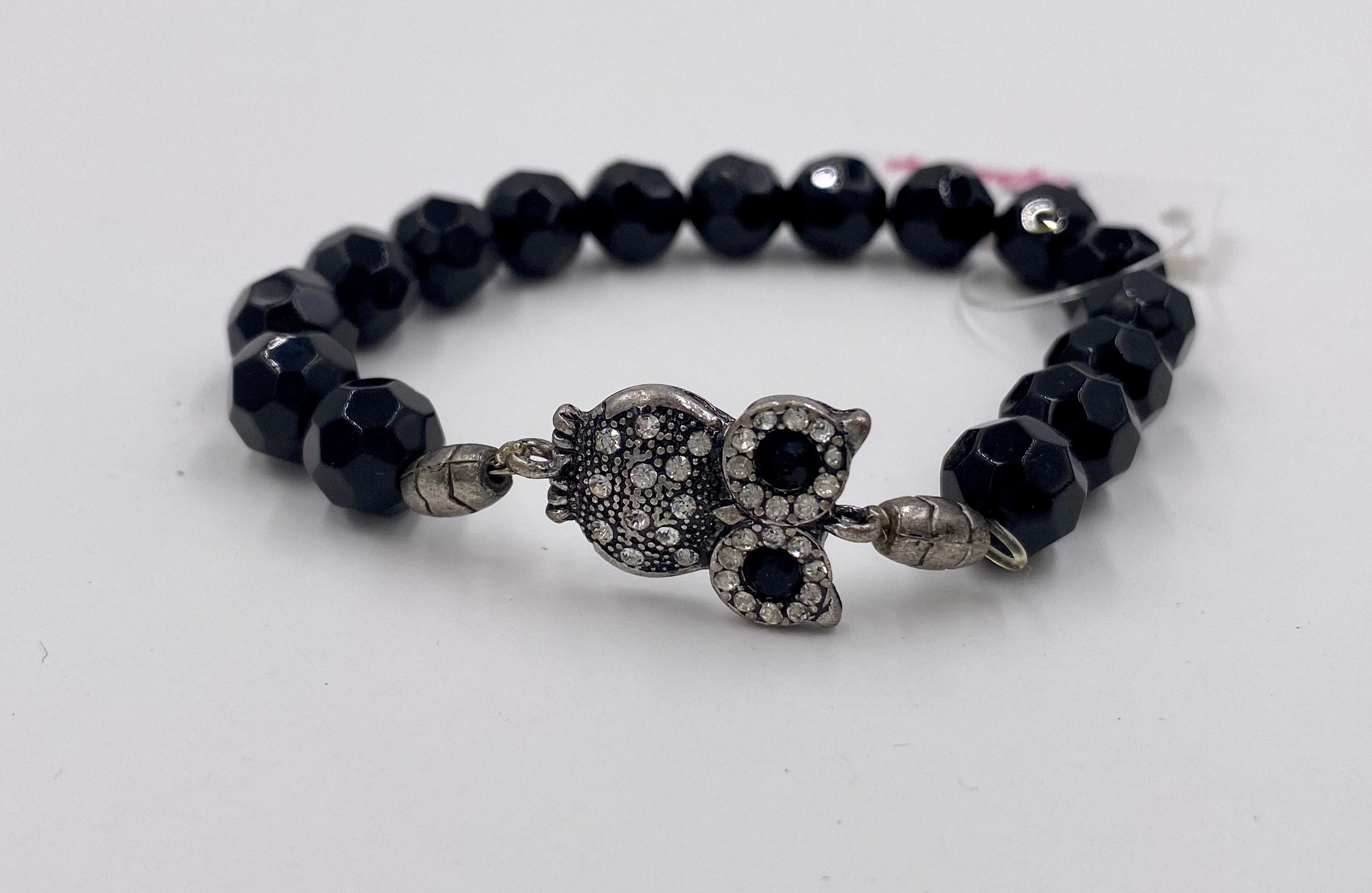 Owl Charm Black Onyx Gemstone Bracelet, Owl Jewelry, Onyx Jewelry, Owl Lover Jewelry, Owl Charm Bracelet, Stone Stretch Bracelet, Owl Gifts